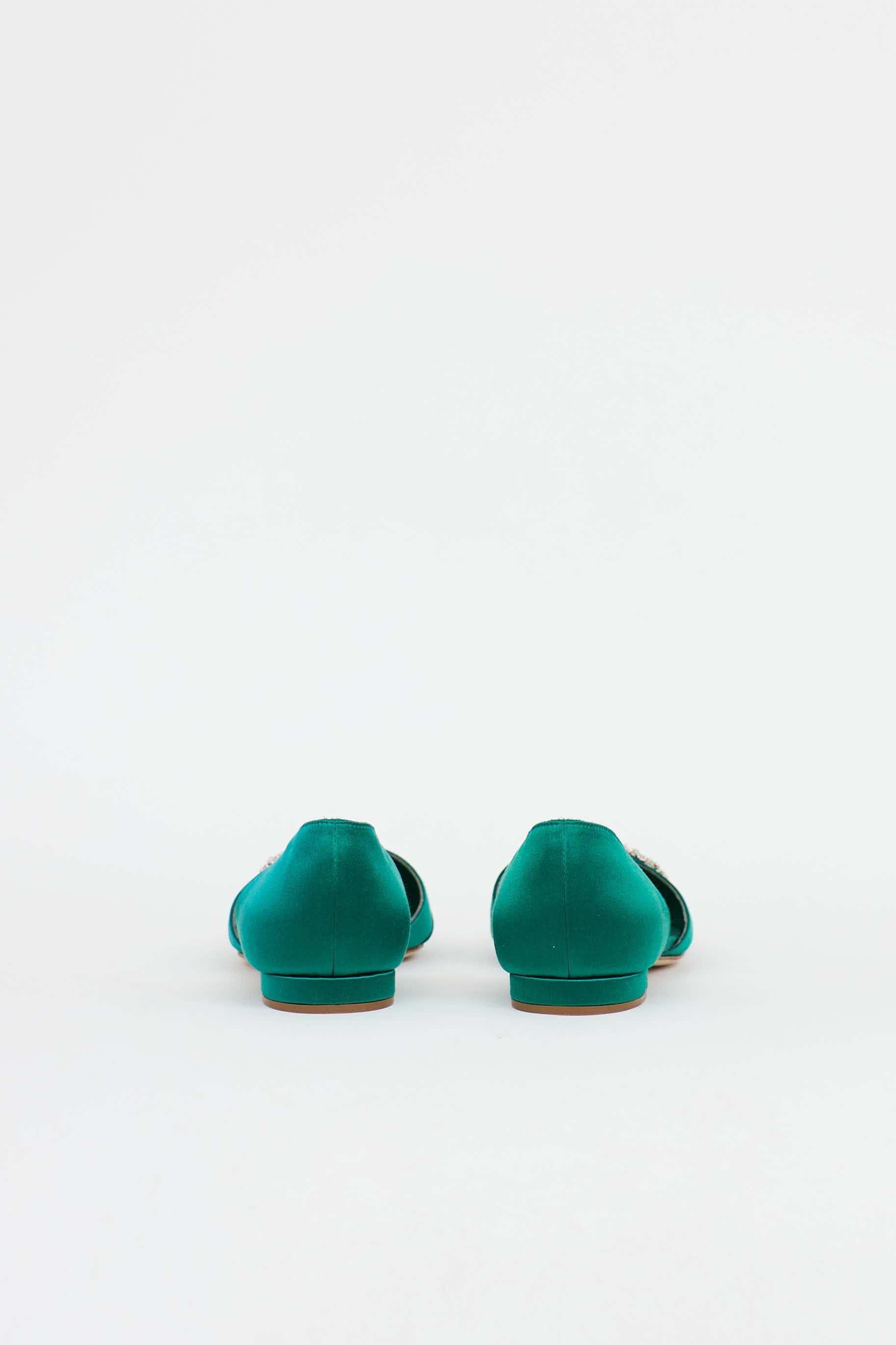 Pre-owned Manolo Blahnik green Luanda flats featuring a pointed toe, slip on entry, satin uppers, d'orsay silhouette, pleated strap at toe with jewel embellished buckle.