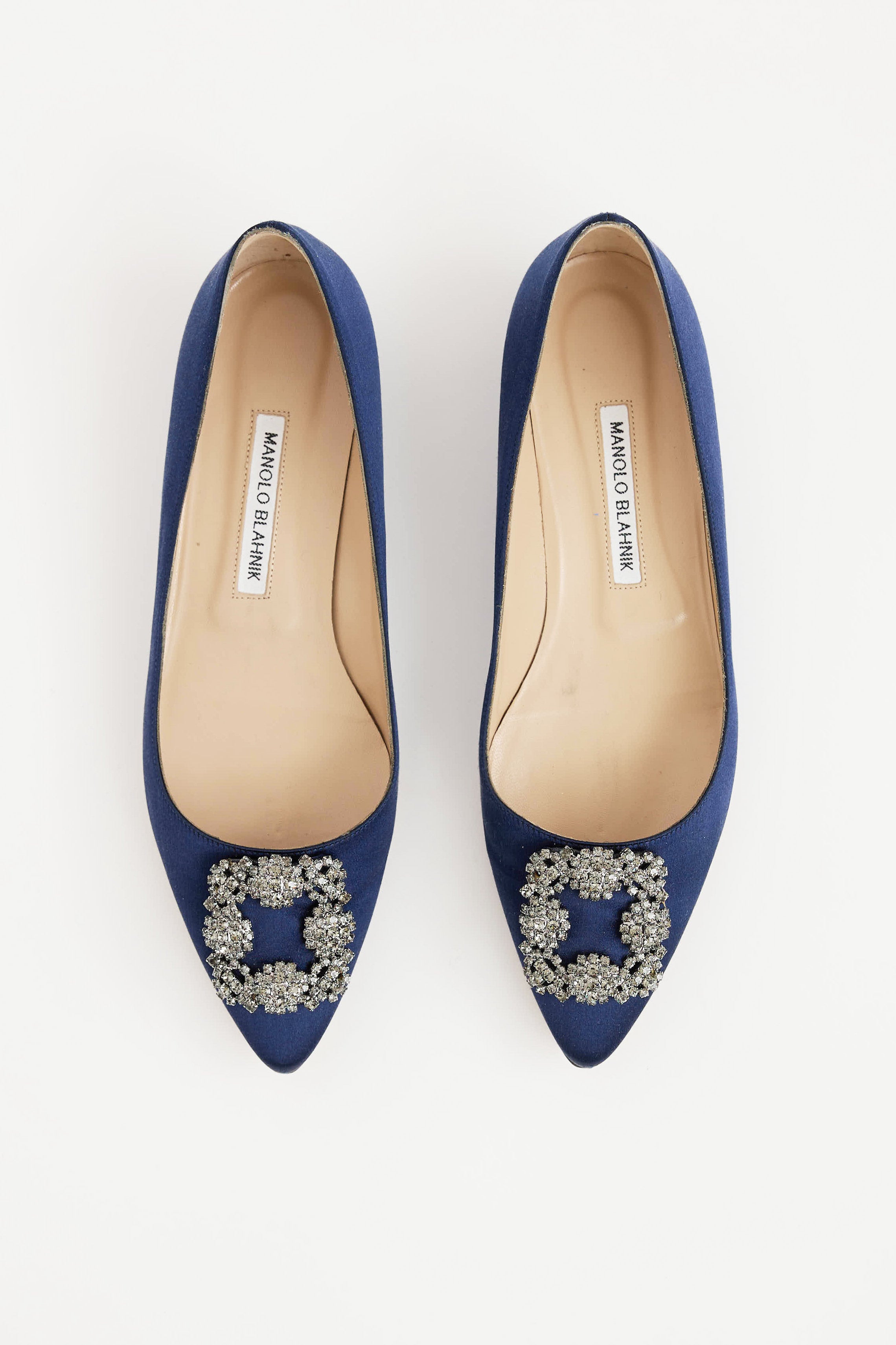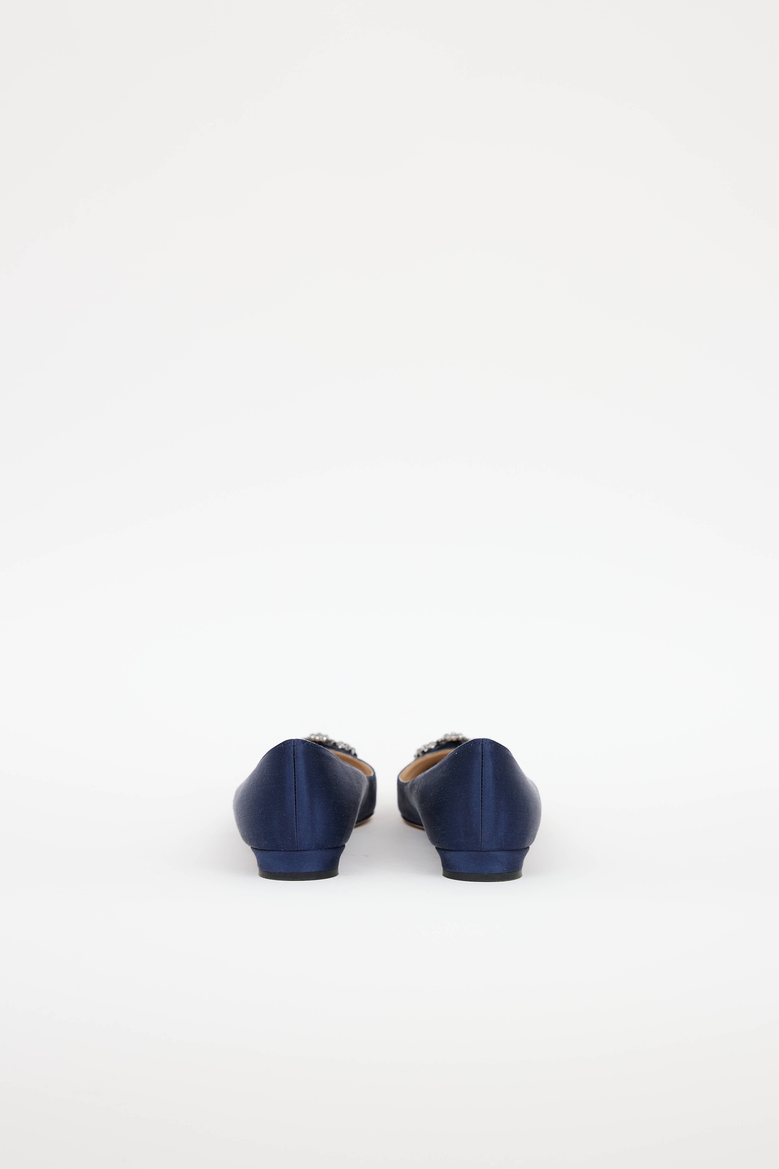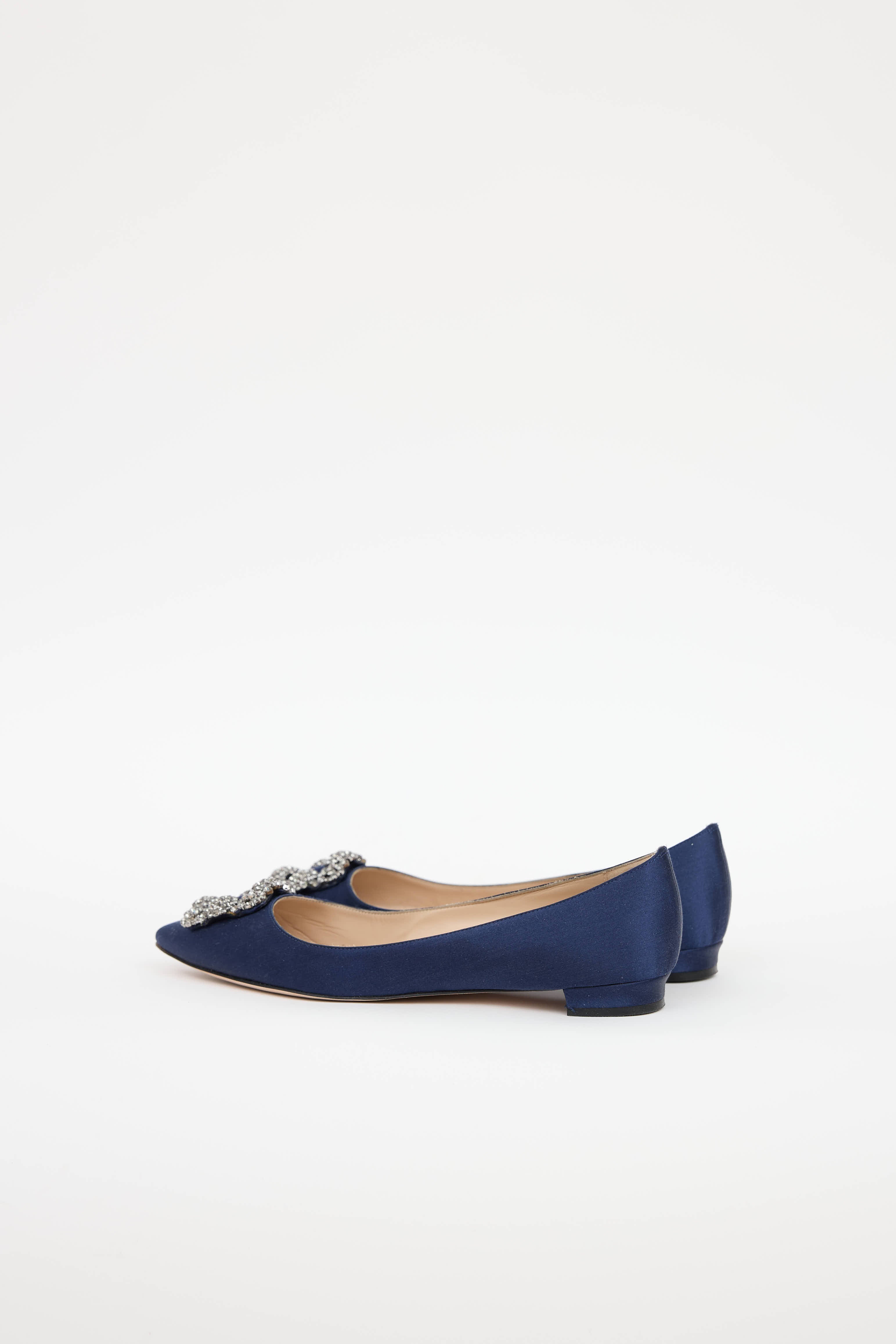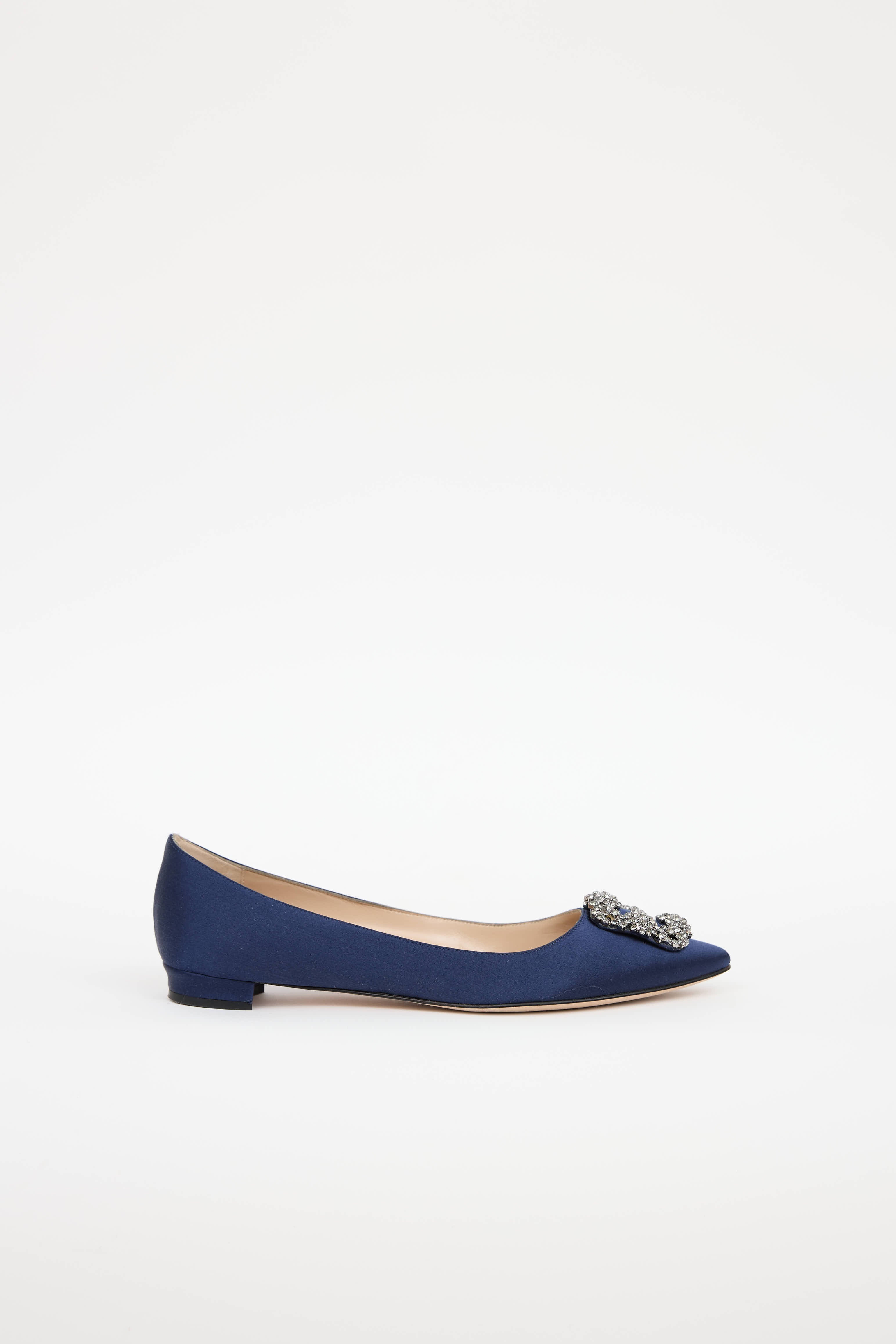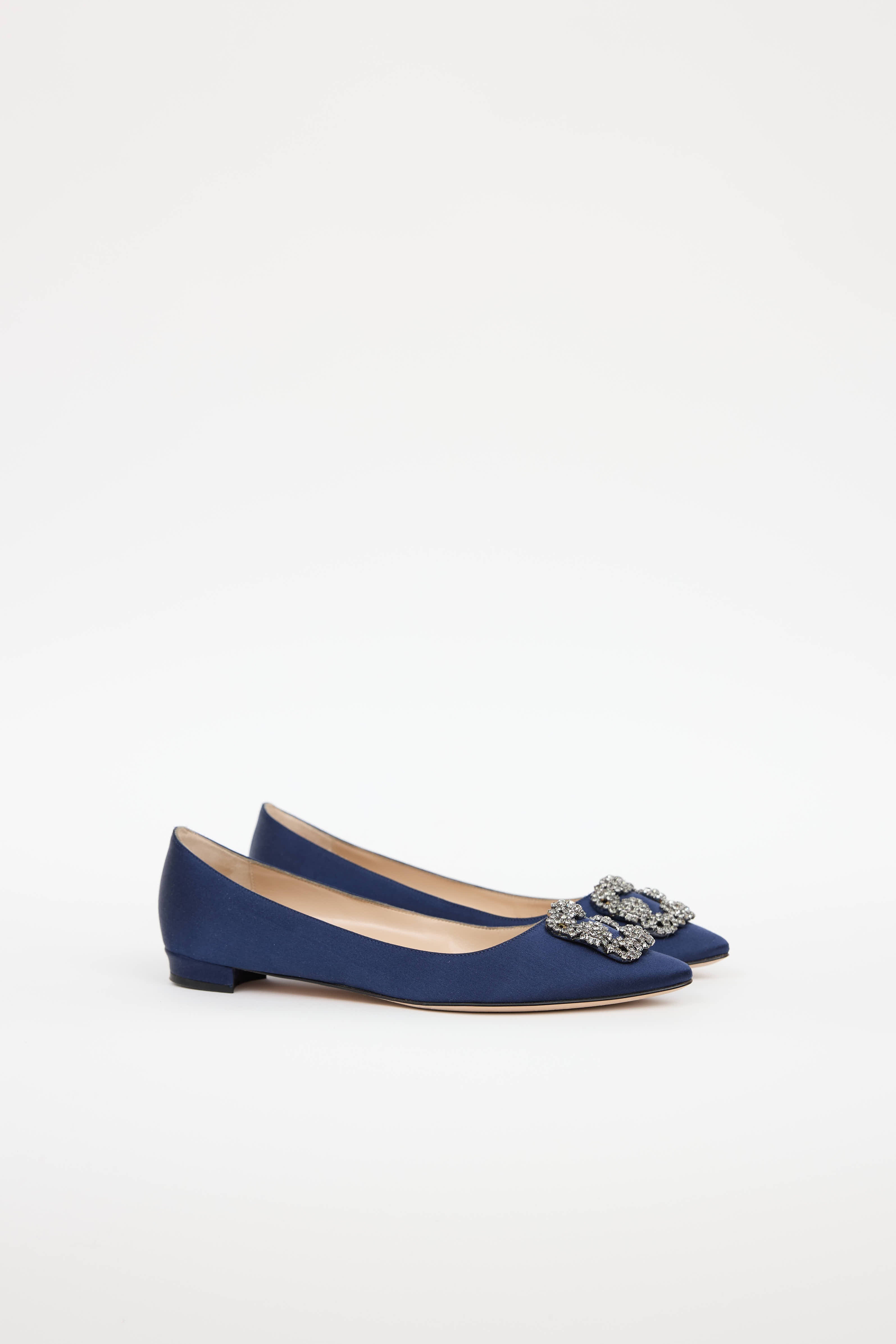 Pre-owned Manolo Blahnik navy Hangisi satin flats featuring a pointed toe, jewel embellished buckle at vamp, and slip on entry.