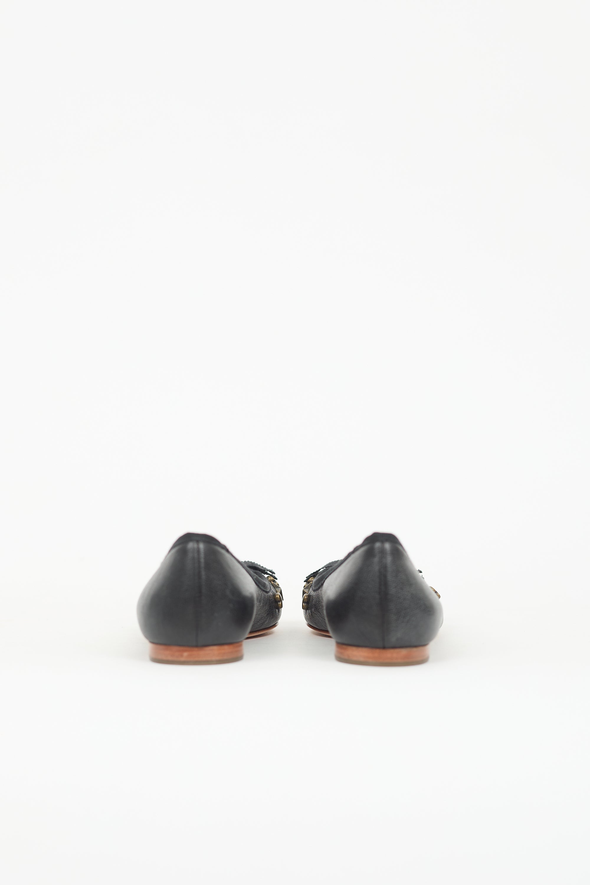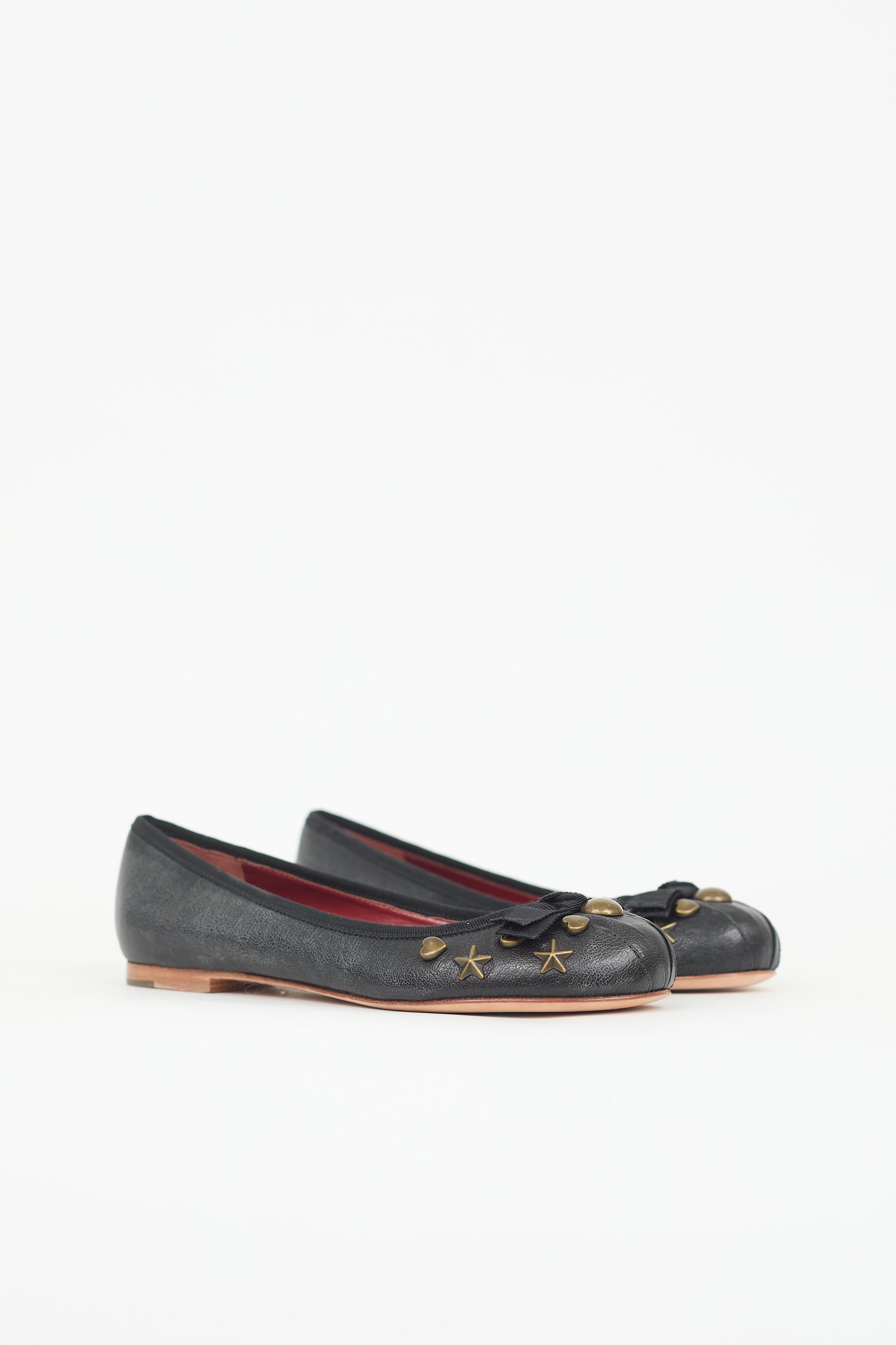 Pre-owned Marc by Marc Jacobs black grained leather flats featuring a round ruched toe, aged bronze studs throughout vamp, grosgrain bow and trimmed collar, and a small stacked heel.