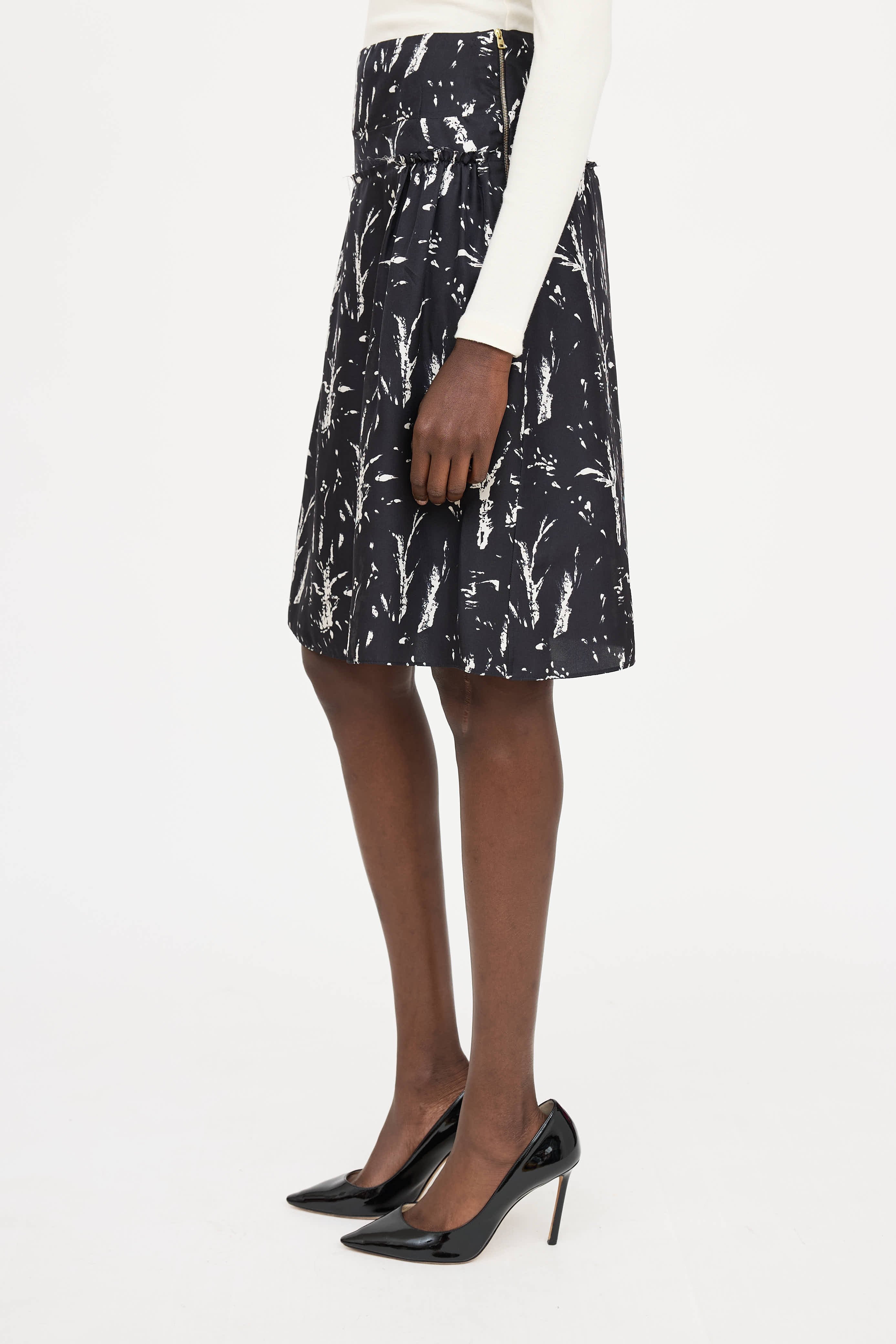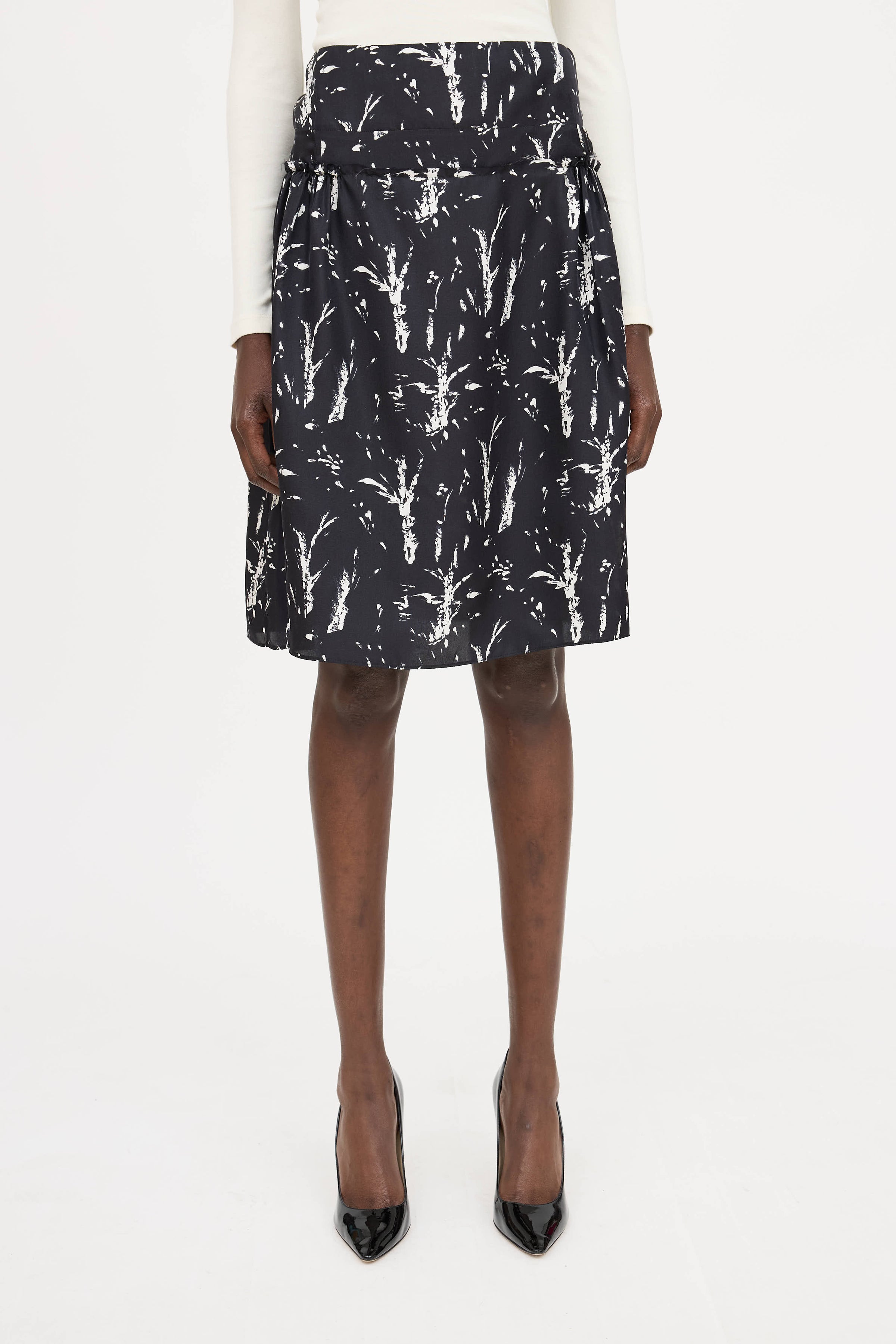 Pre-owned Marni black and white silk pattern midi skirt featuring a flat waist band, zip closure at right side, and ruched frayed detail along hip line.