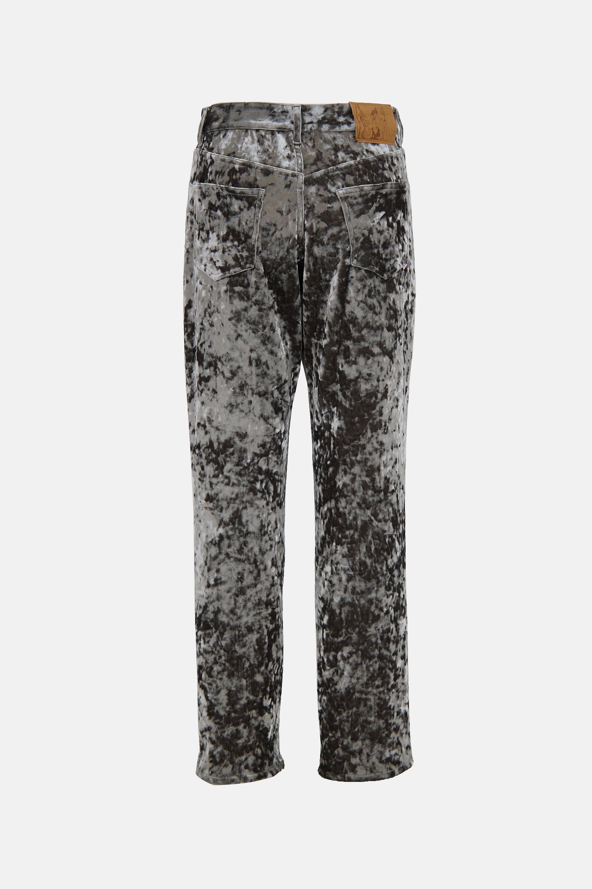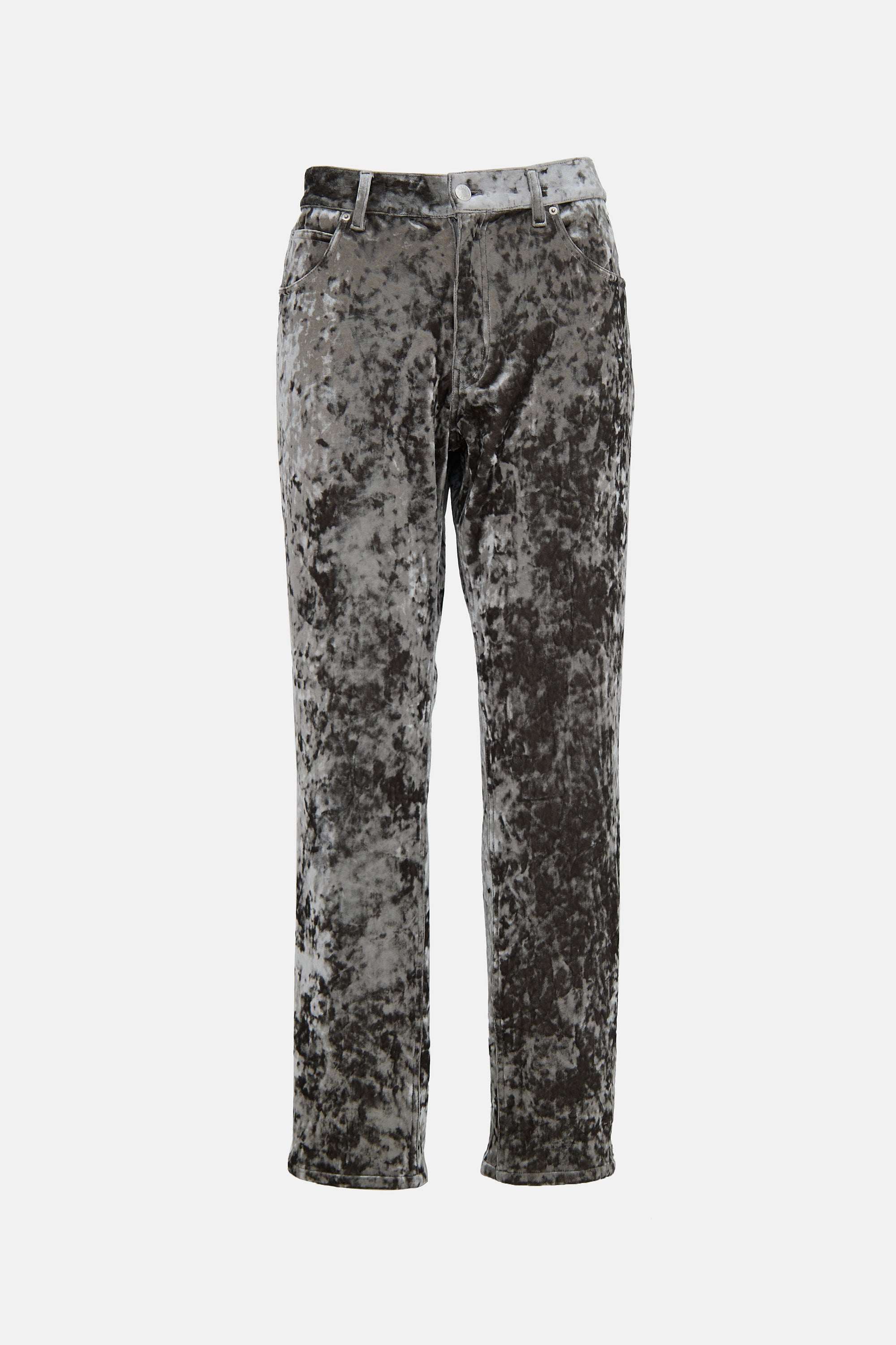 Pre-owned Martine Rose grey velvet jeans featuring belt loops, zip fly, five pocket styling, low rise, Jacron patch at back, and straight leg.
