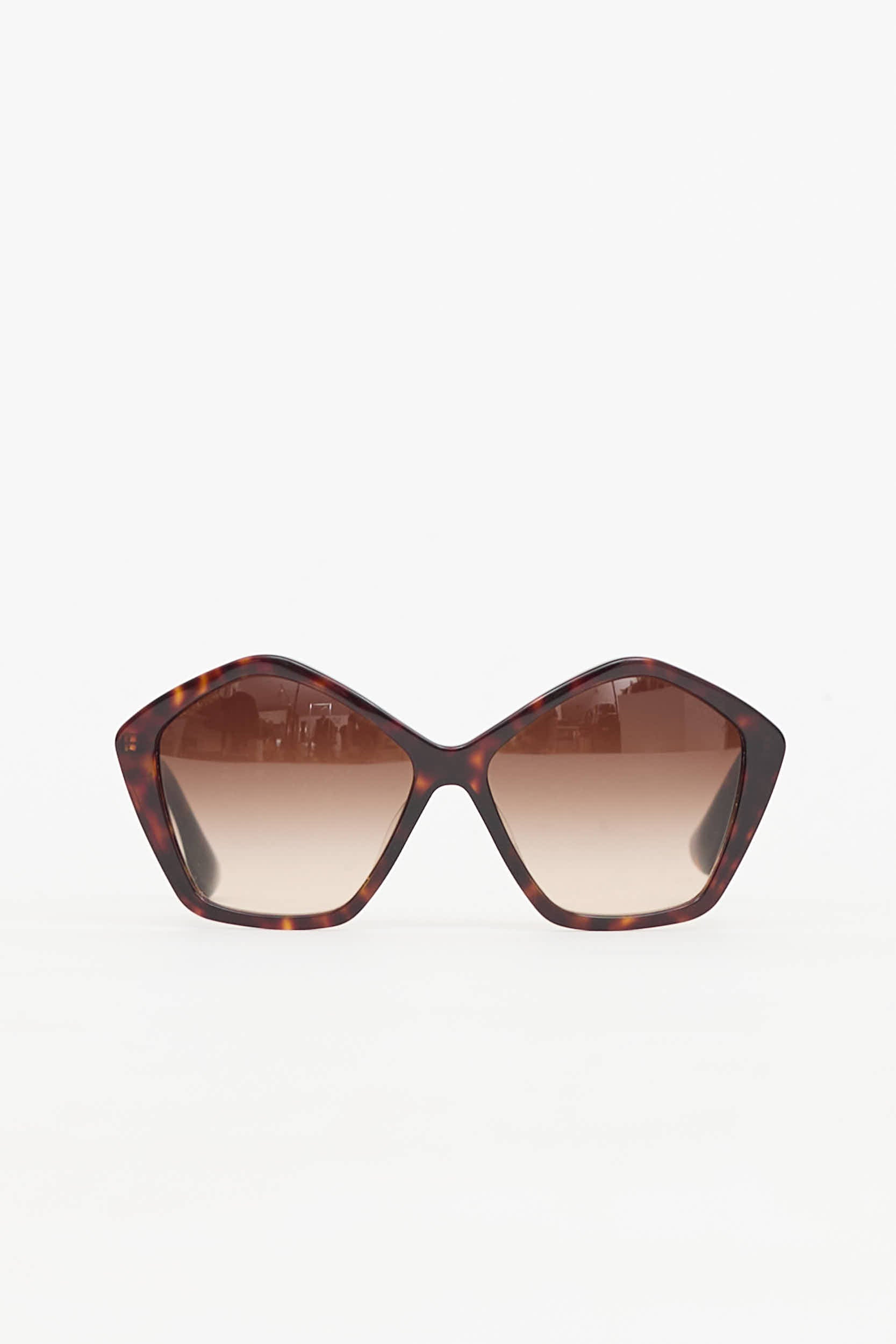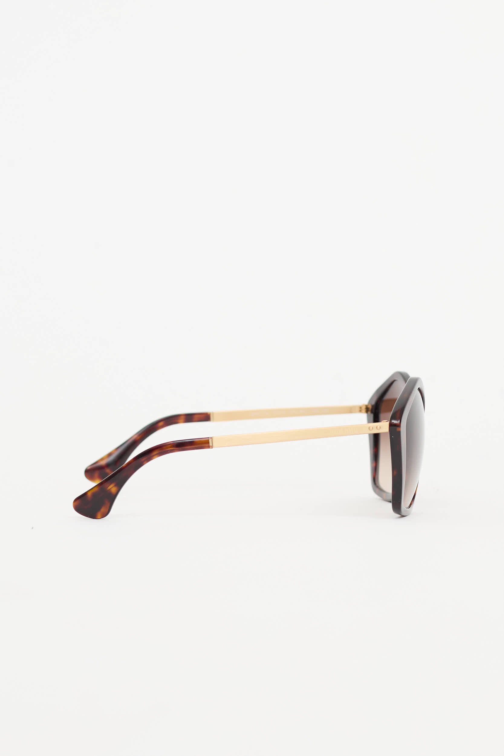 Pre-owned Miu Miu brown SMU11N sunglasses featuring tortoise frames, brown tinted lenses, and gold tone wire arms with debossed logo at temples. Includes original case, dust bag, and polishing cloth.