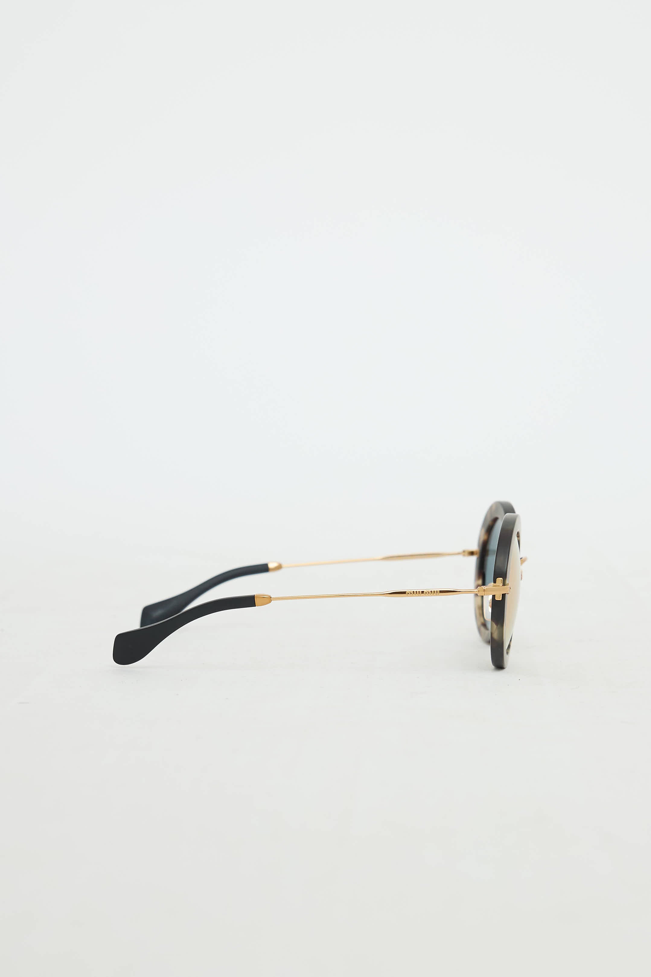 Pre-owned Miu Miu SMU13N brown tortoise sunglasses featuring black mirrored tinted lenses, nose pads, round matte tortoise frames, and wire arms.