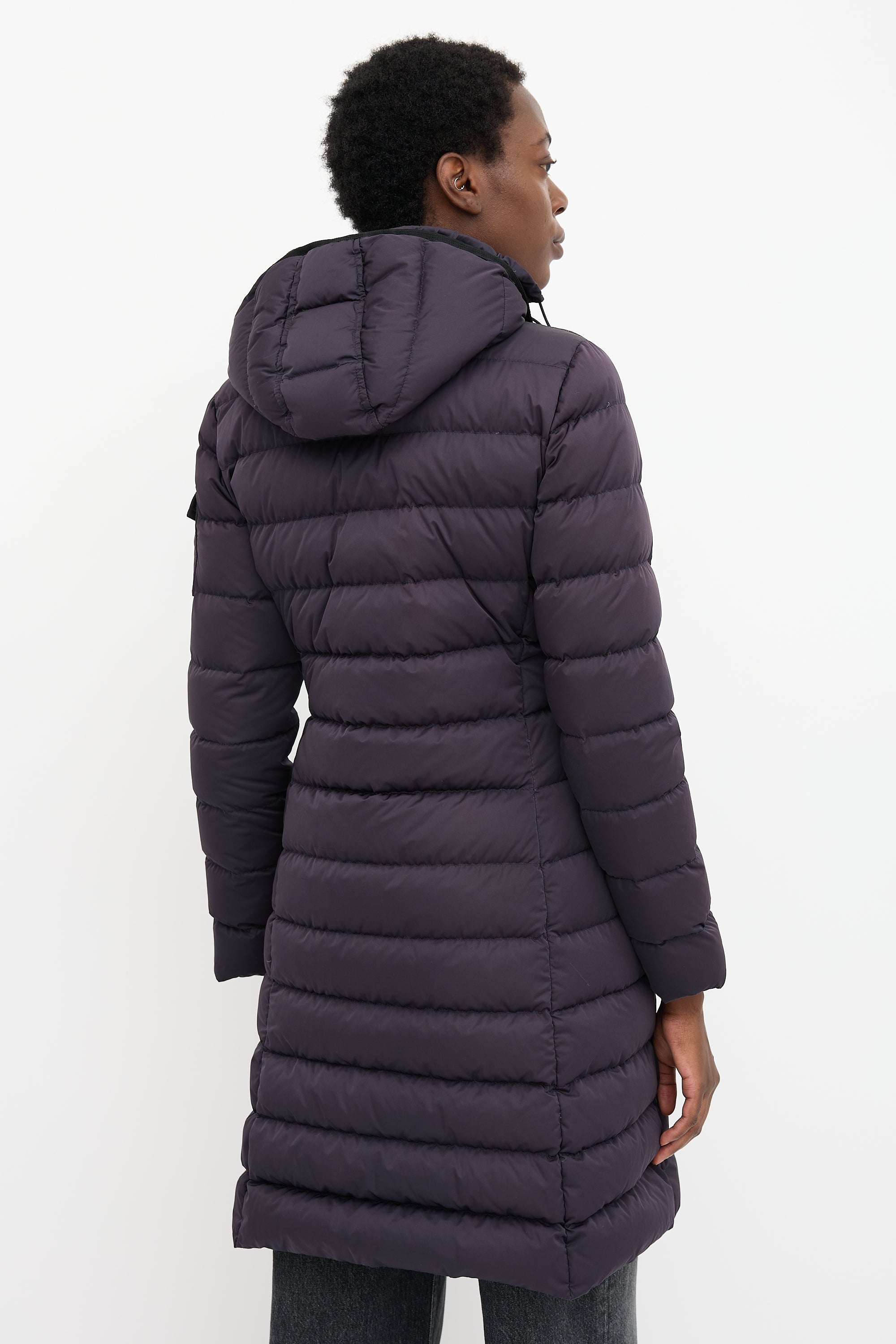 Pre-owned Moncler navy down Mokamat puffer coat featuring a stand collar with detachable hood, front zip, multicolour logo patch at left sleeve, and zip pockets.