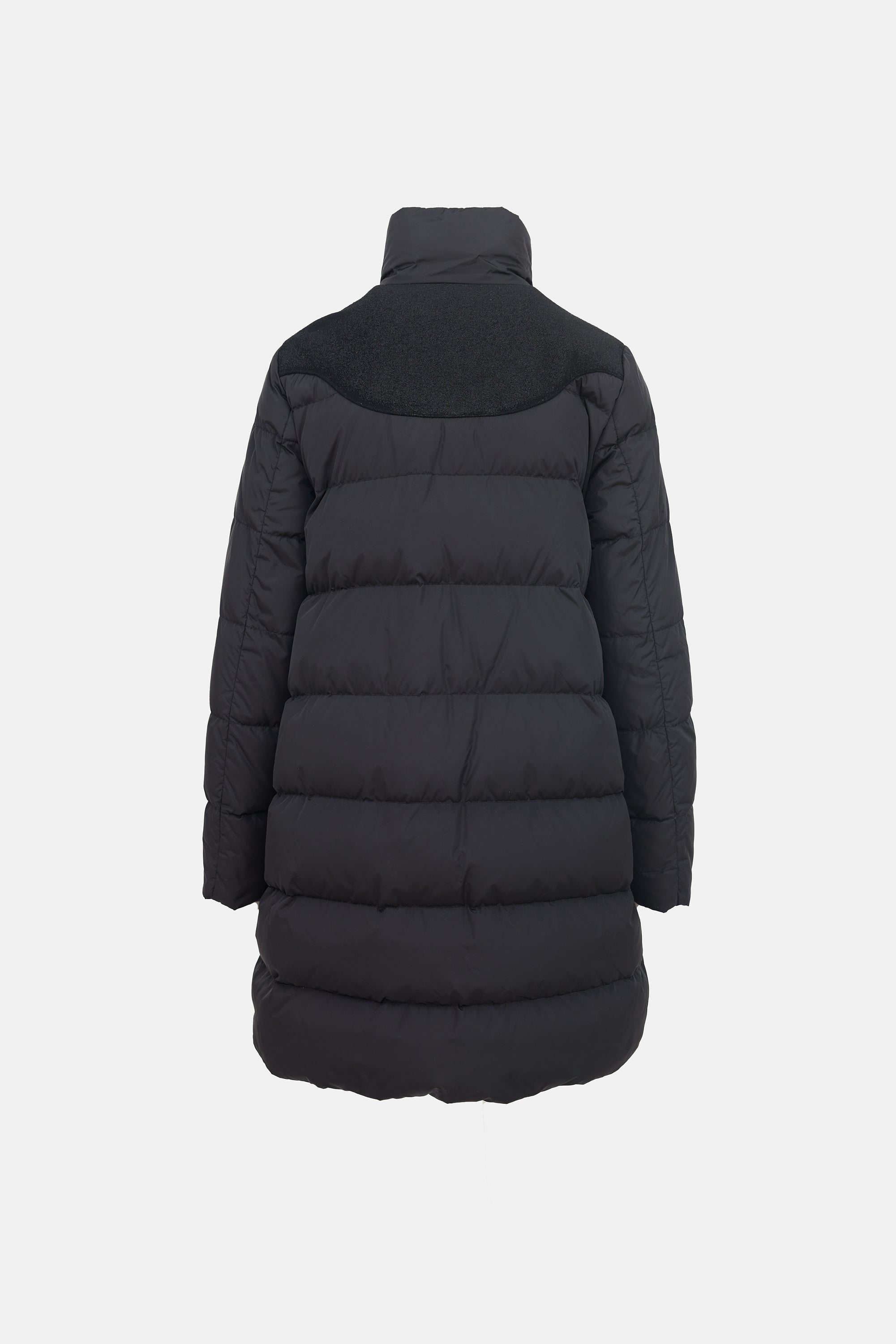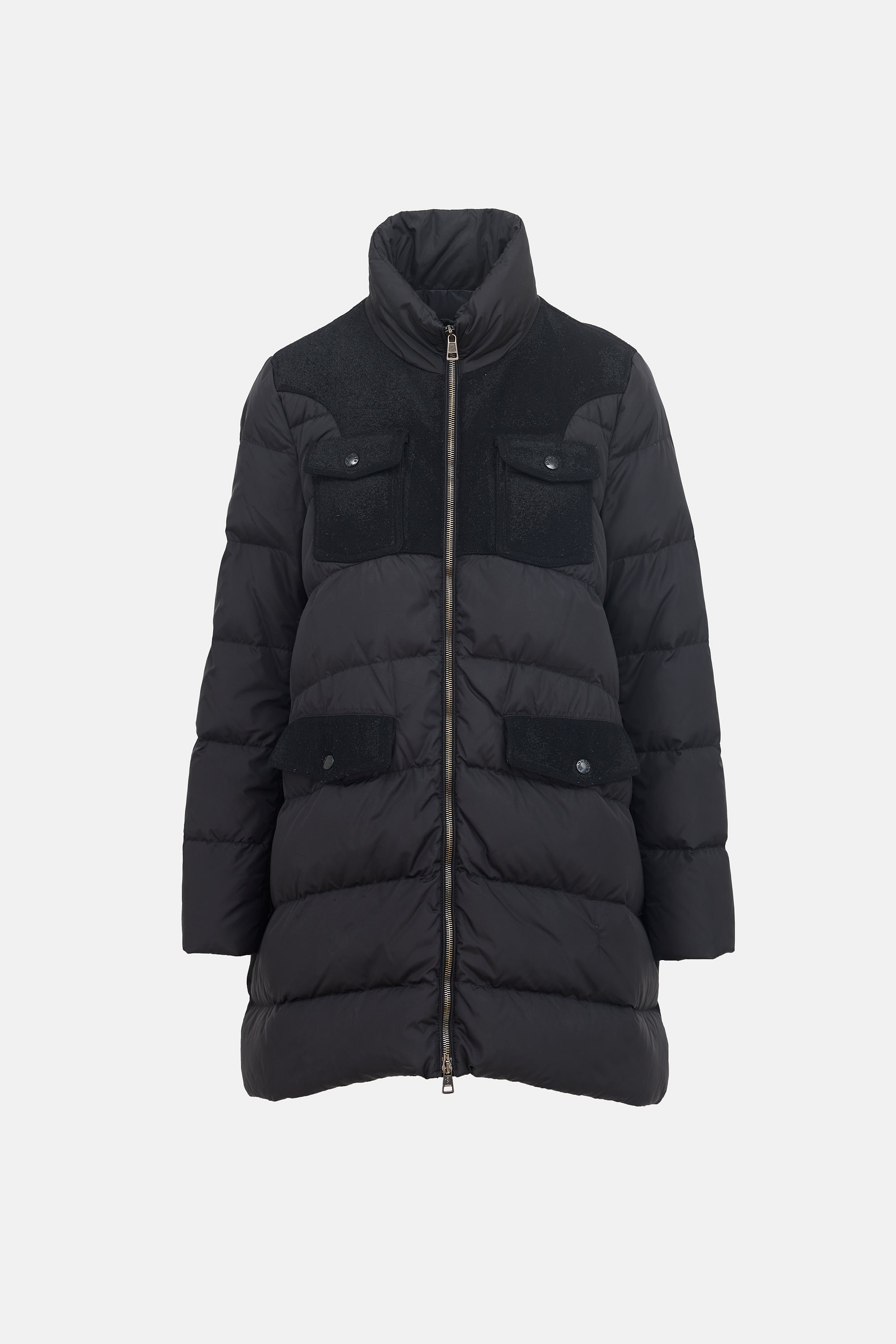 Pre-owned Moncler black down-filled puffer jacket featuring a stand collar, dual zip front, wool yoke and pocket trim, four buttoned flap pockets at front, and drawcord hem. Lined.