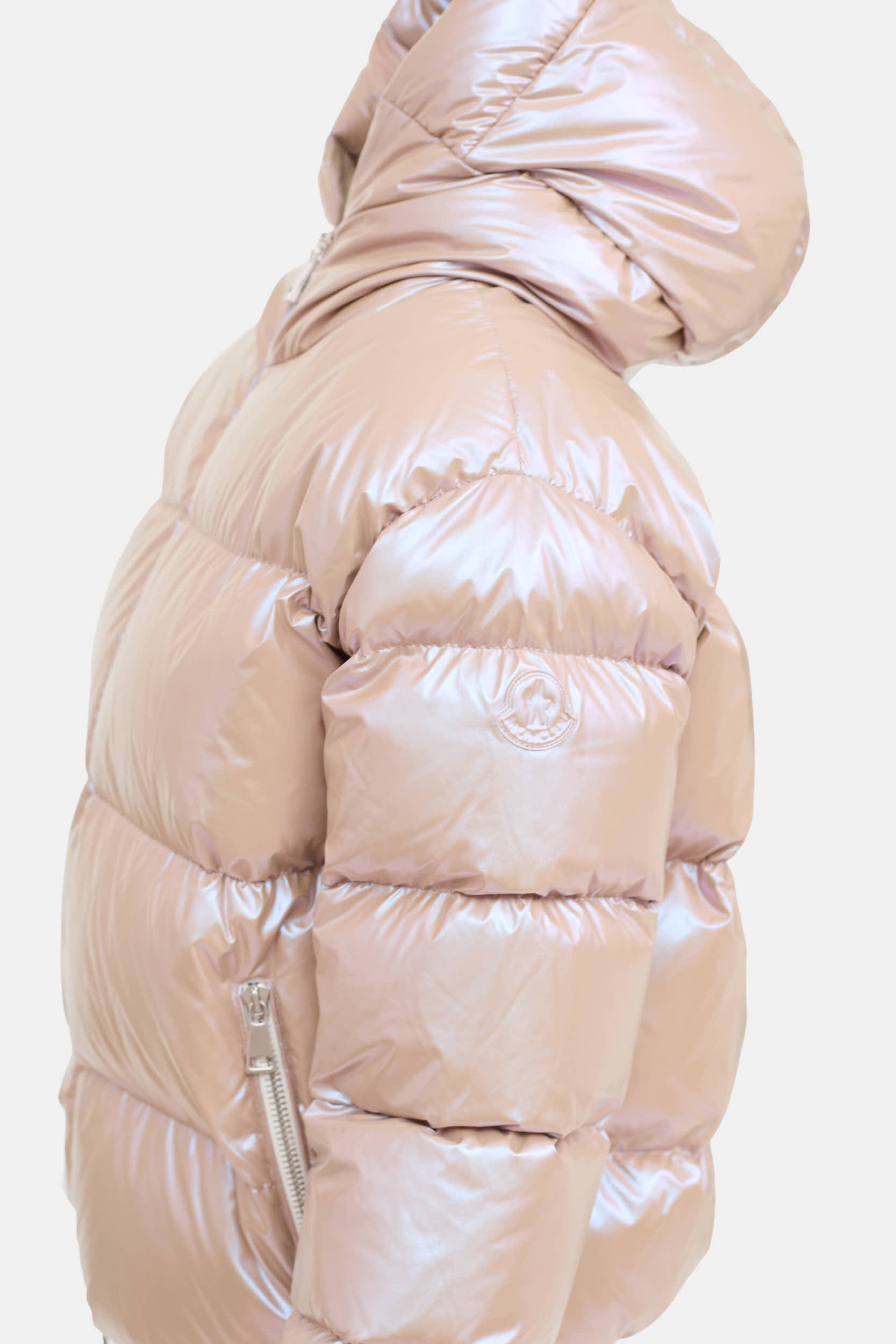 Pre-owned Moncler pink Iridescent Frasne puffer coat featuring attached hood, double zip front, zip pockets, logo at sleeve, and elasticized cuffs and hem.