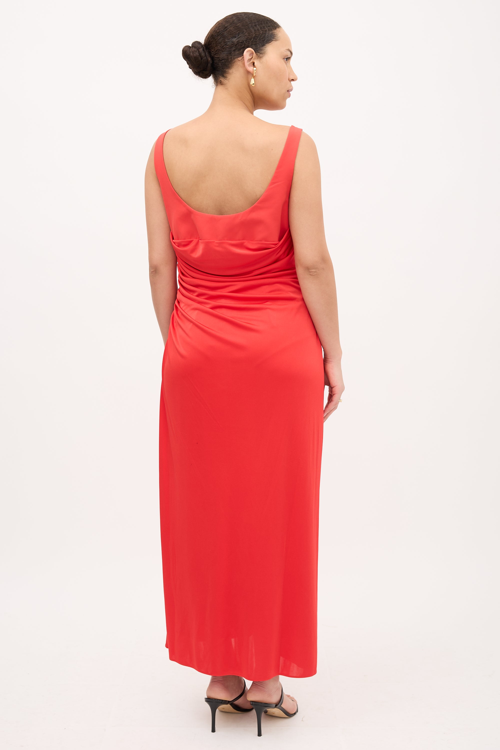 Pre-owned Monique Lhuillier ML red dress featuring V-neckline, structured bust with ruched layer, zip closure at side, and front slit.