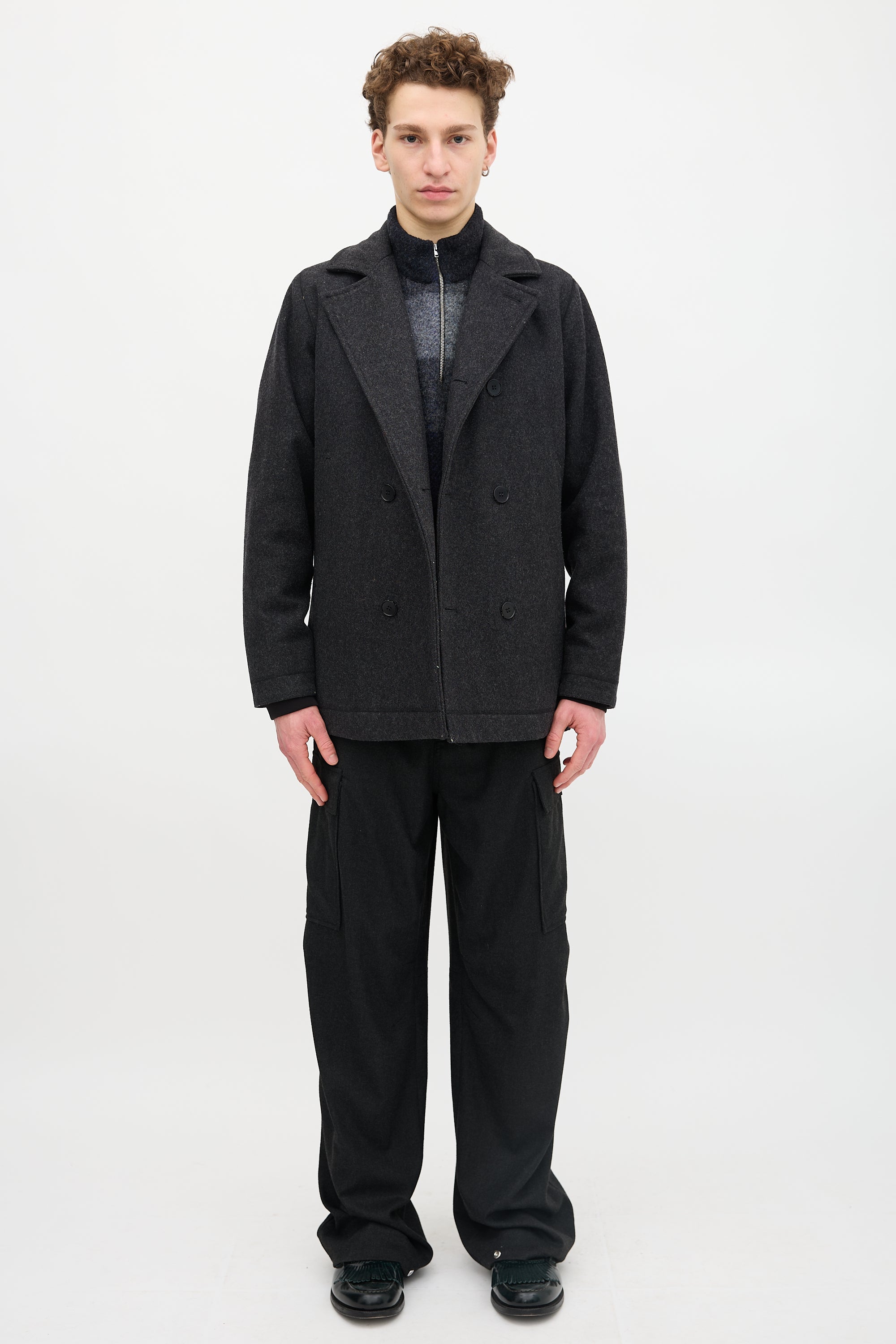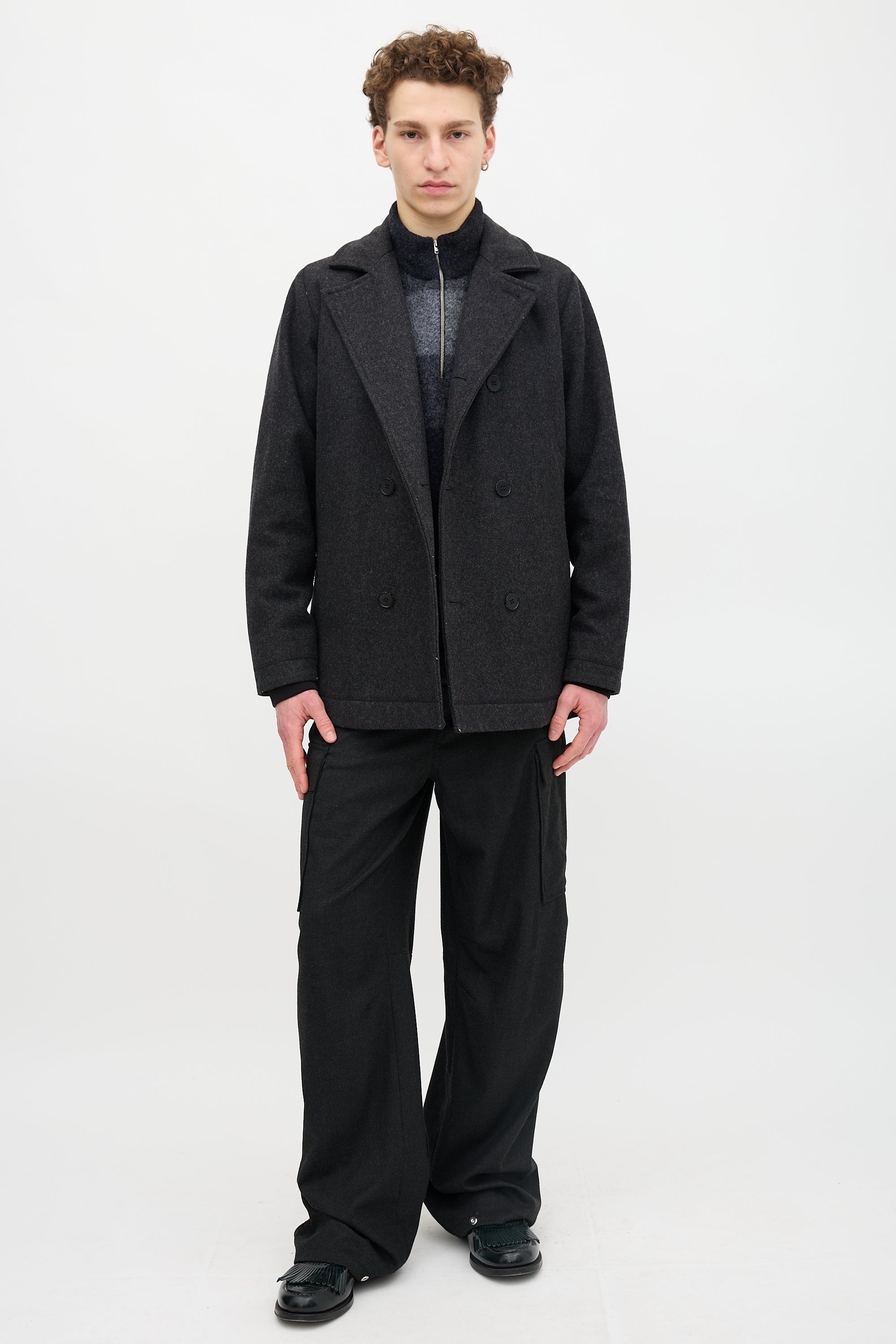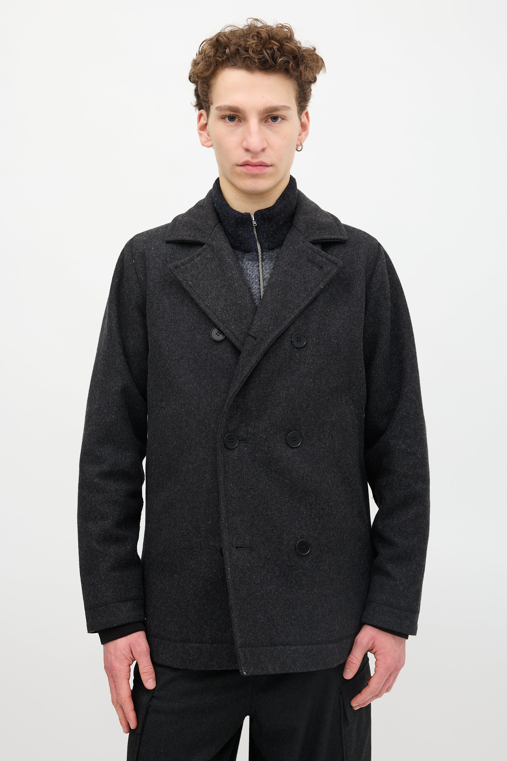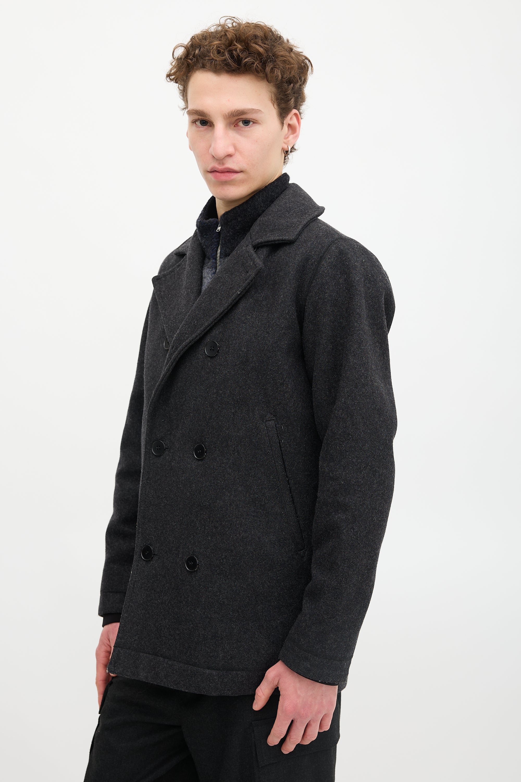 Pre-owned Norse Projects dark grey wool Birk coat featuring a notched lapel, double breasted button front, two welt pockets, and padded interior. Lined.