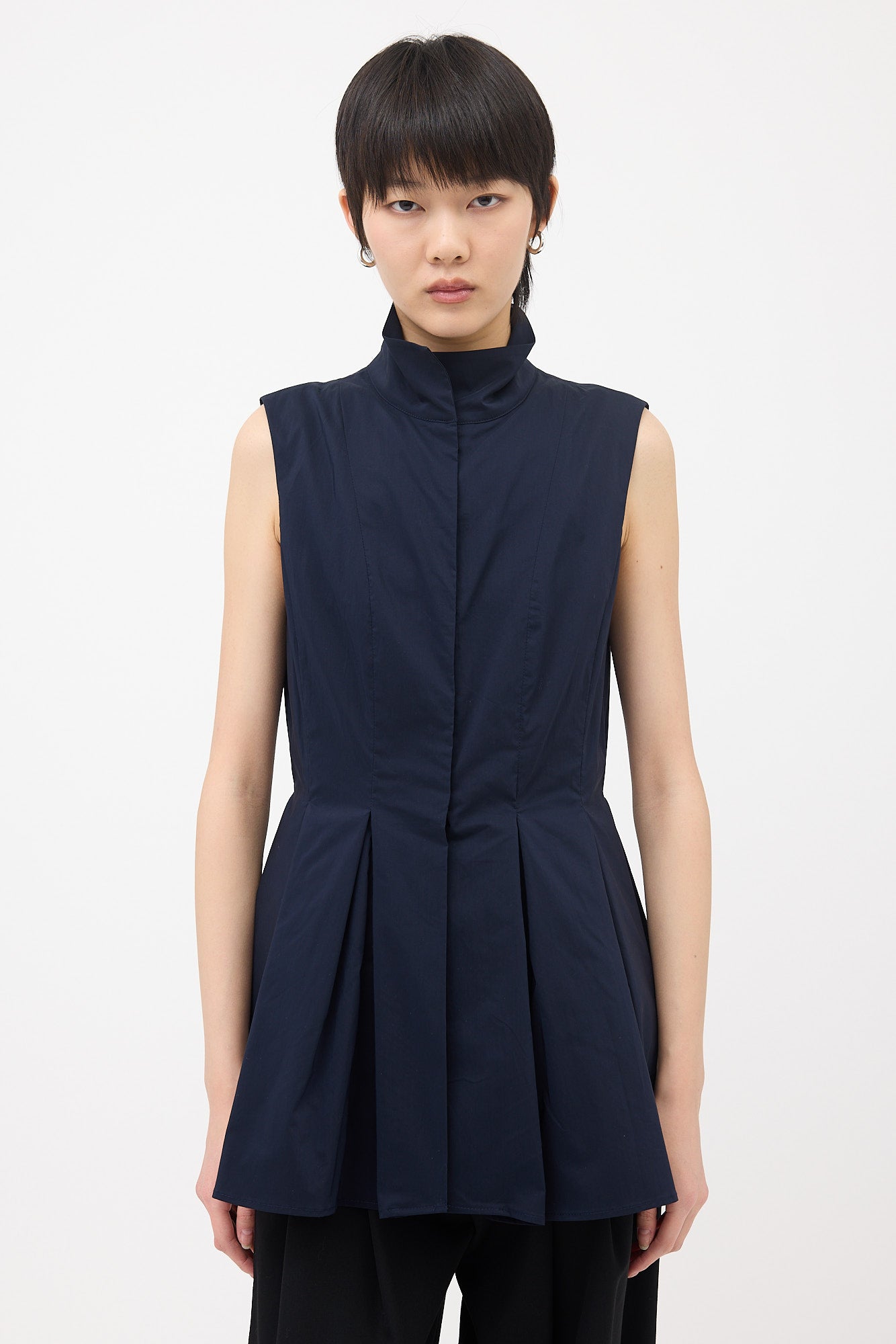 Pre-owned Pilosoule navy Row Vest top featuring stand collar, hook and eye front closure, in seam pockets, and lower box pleated design.