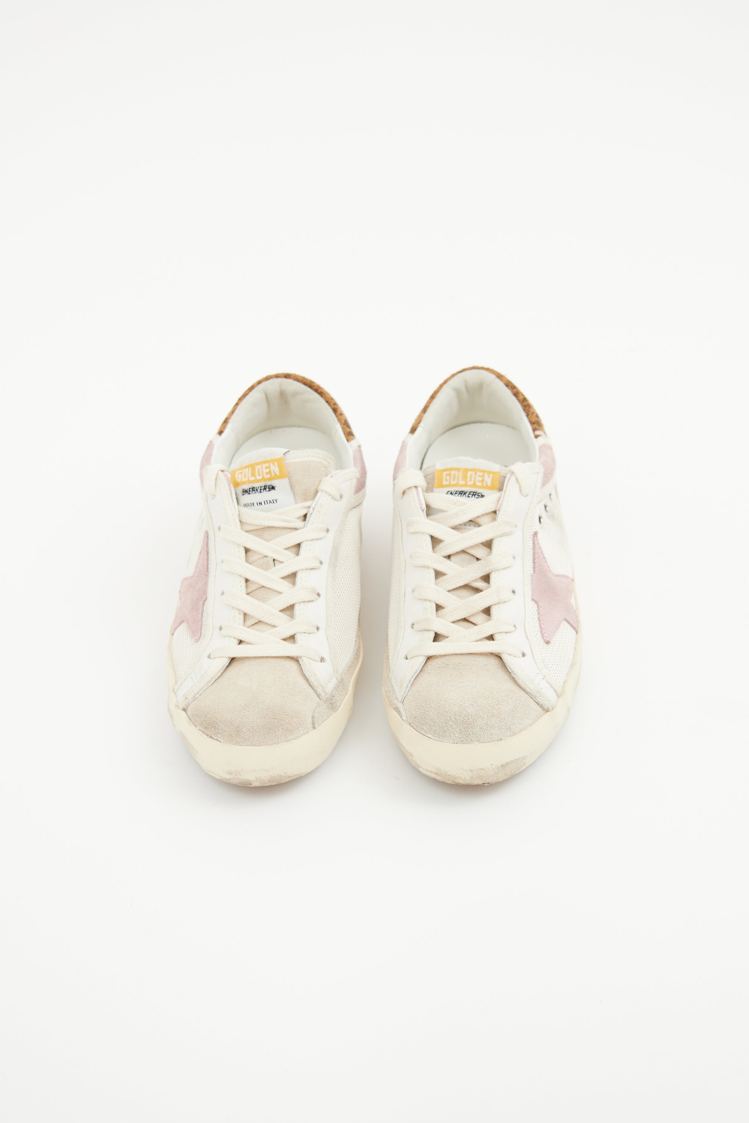Pre-owned Golden Goose pink and grey lo-top leather Superstar sneaker featuring round toe, white mesh detailing at sides, pink leather detailing, star embellishment on outer sides, faux leopard print detail at heel, and intentional distressing throughout.
