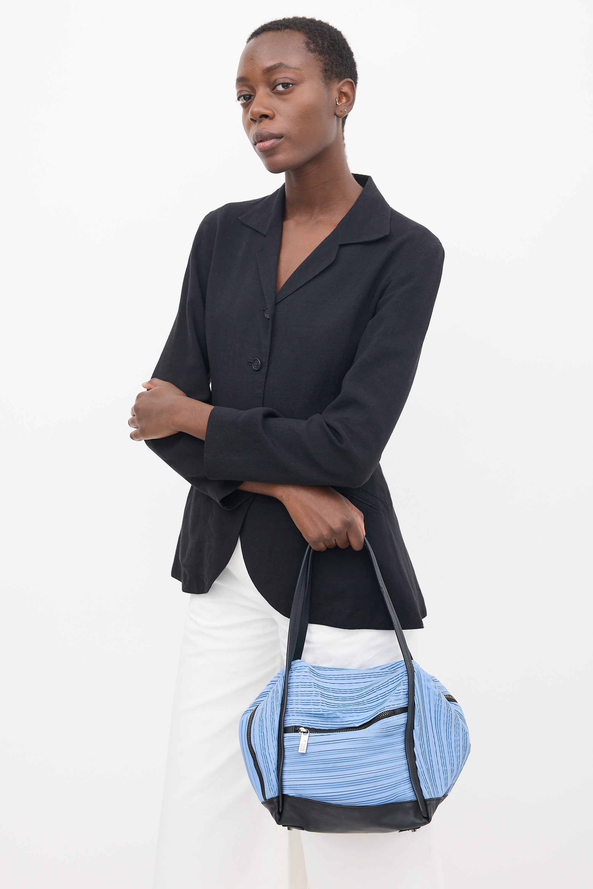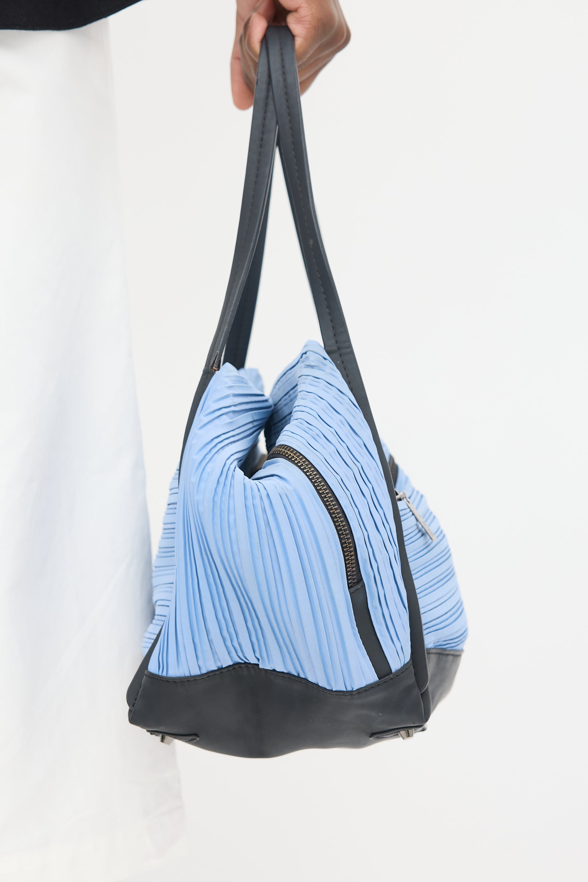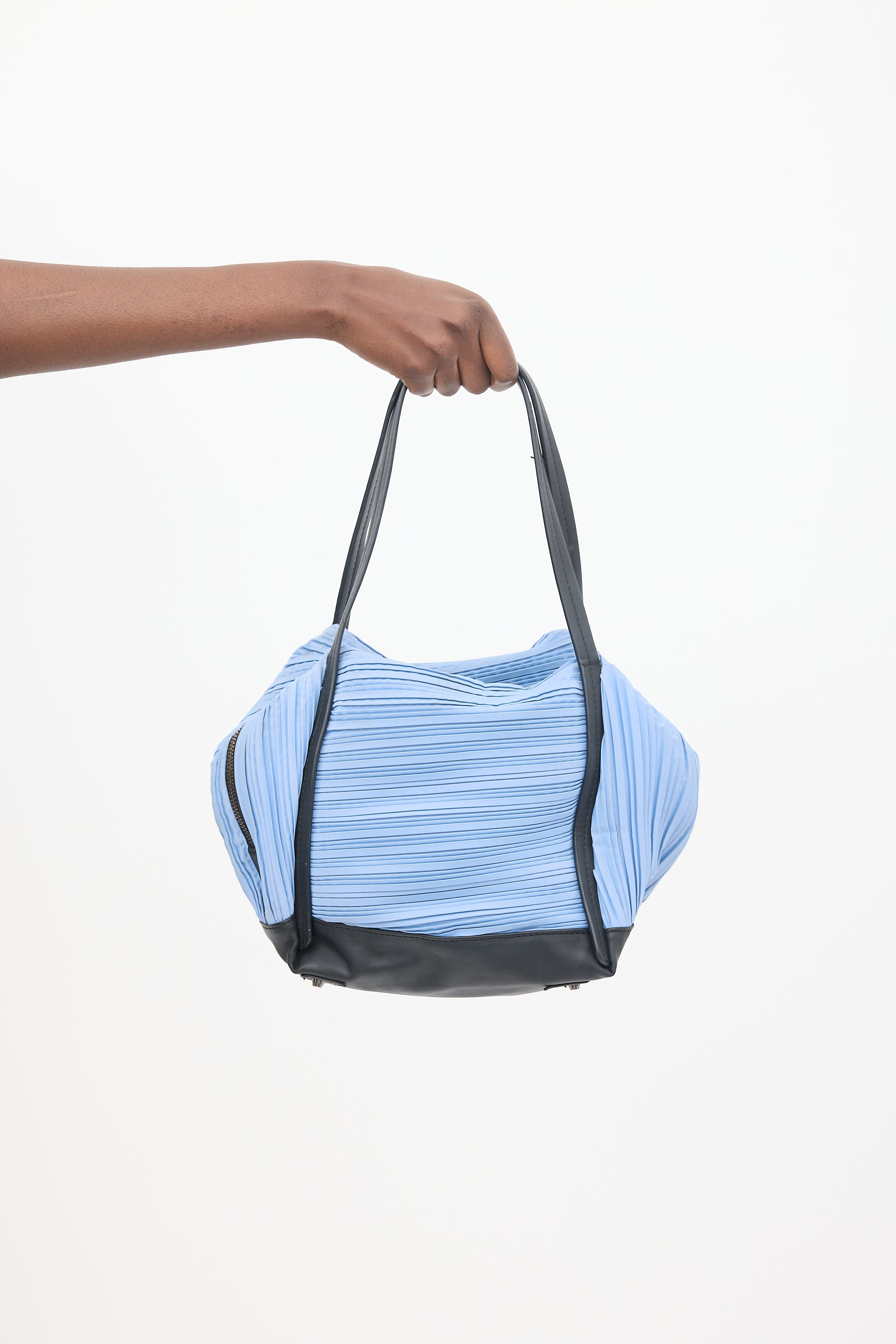 Pre-owned Pleats Please Issey Miyake blue pleated bag featuring black faux leather trim, two top handles, one zip pocket at front, one main compartment with one zip pocket, and top zip closure.