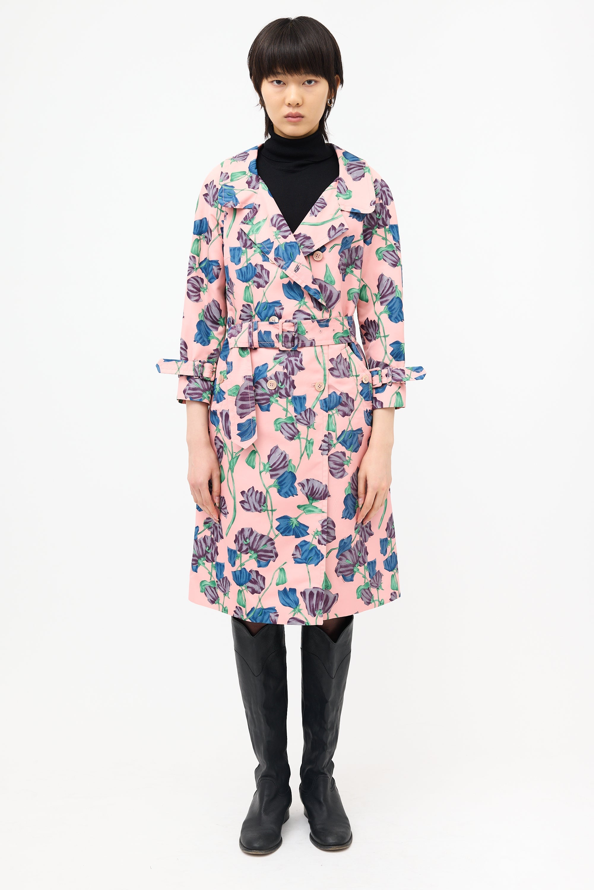 Pre-owned Prada Resort 2008 pink silk trench coat featuring multicolour floral print, notched collar, button front, three quarter length sleeves, adjustable belt, and back box pleat. Lined.