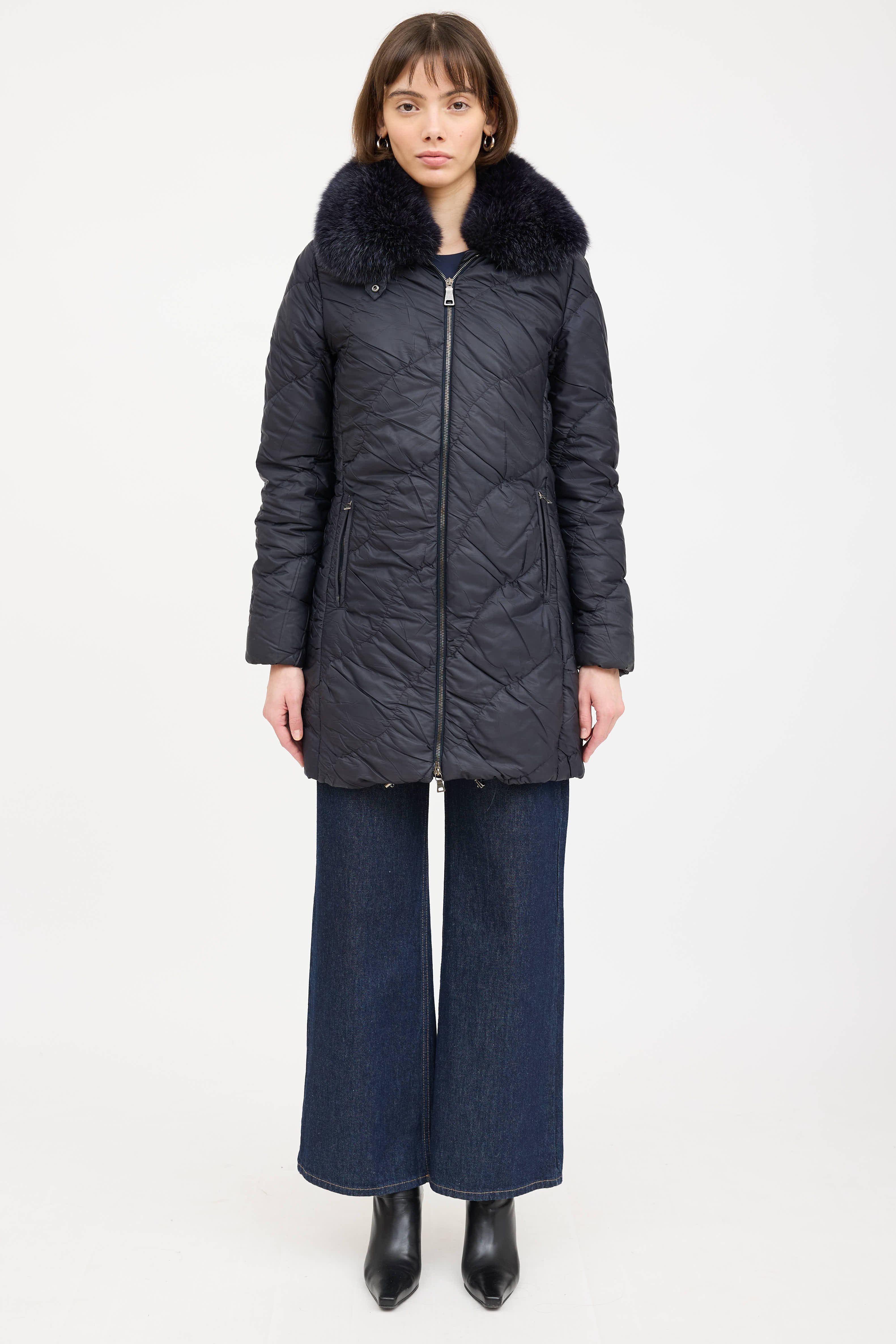 Pre-owned Prada 2009 navy nylon parka featuring a removable hood, funnel neck collar with dyed white fox fur trim, long sleeves with buttoned cuffs, two zip pockets at hip, drawstring hem, and zip closure.