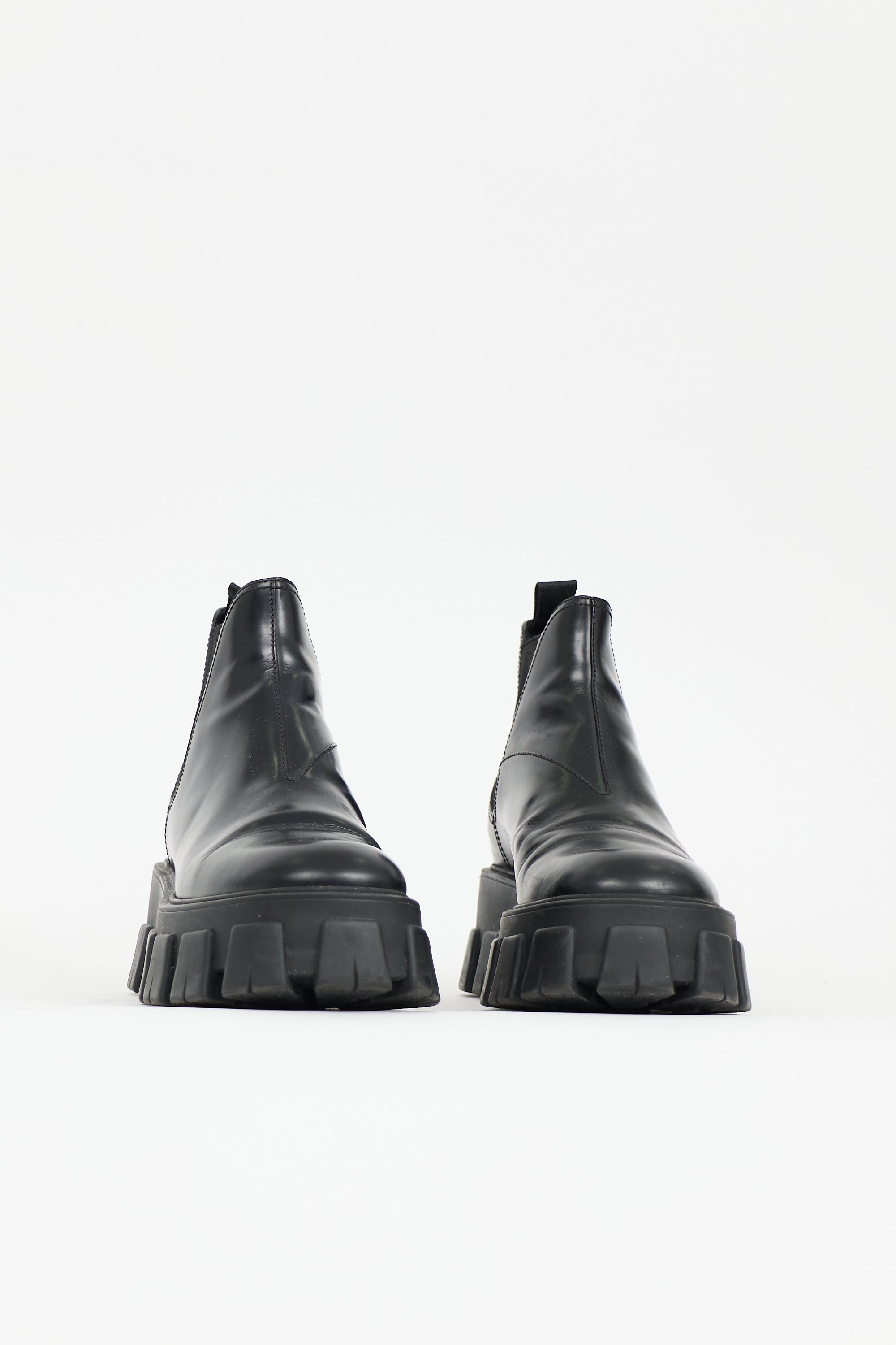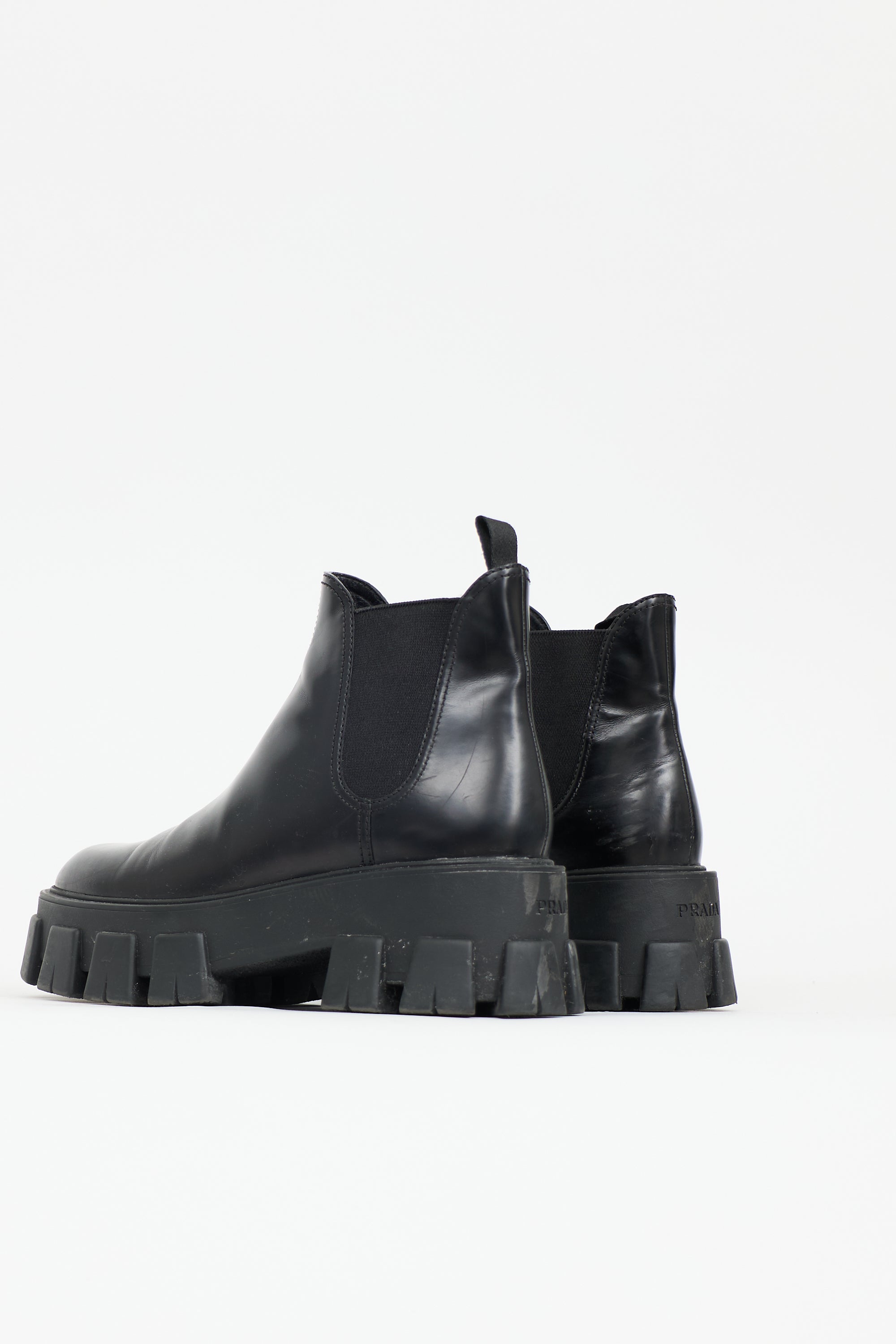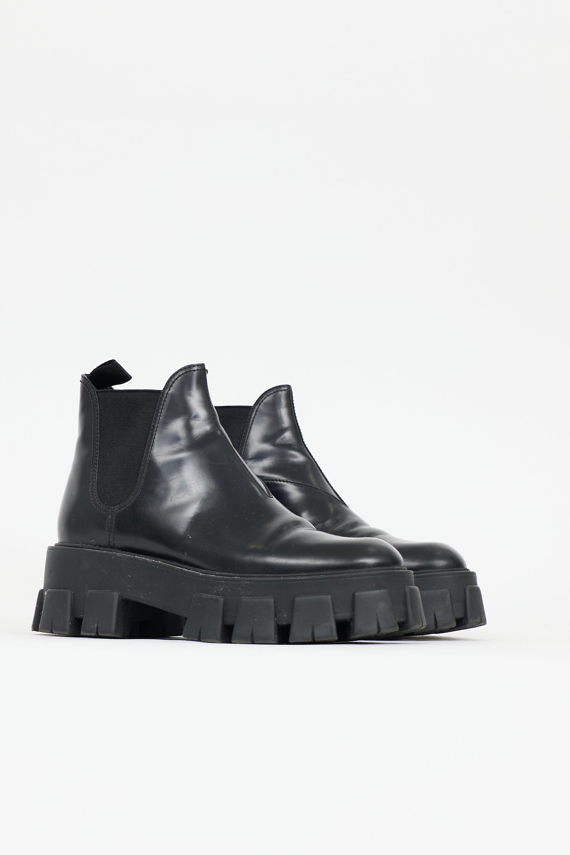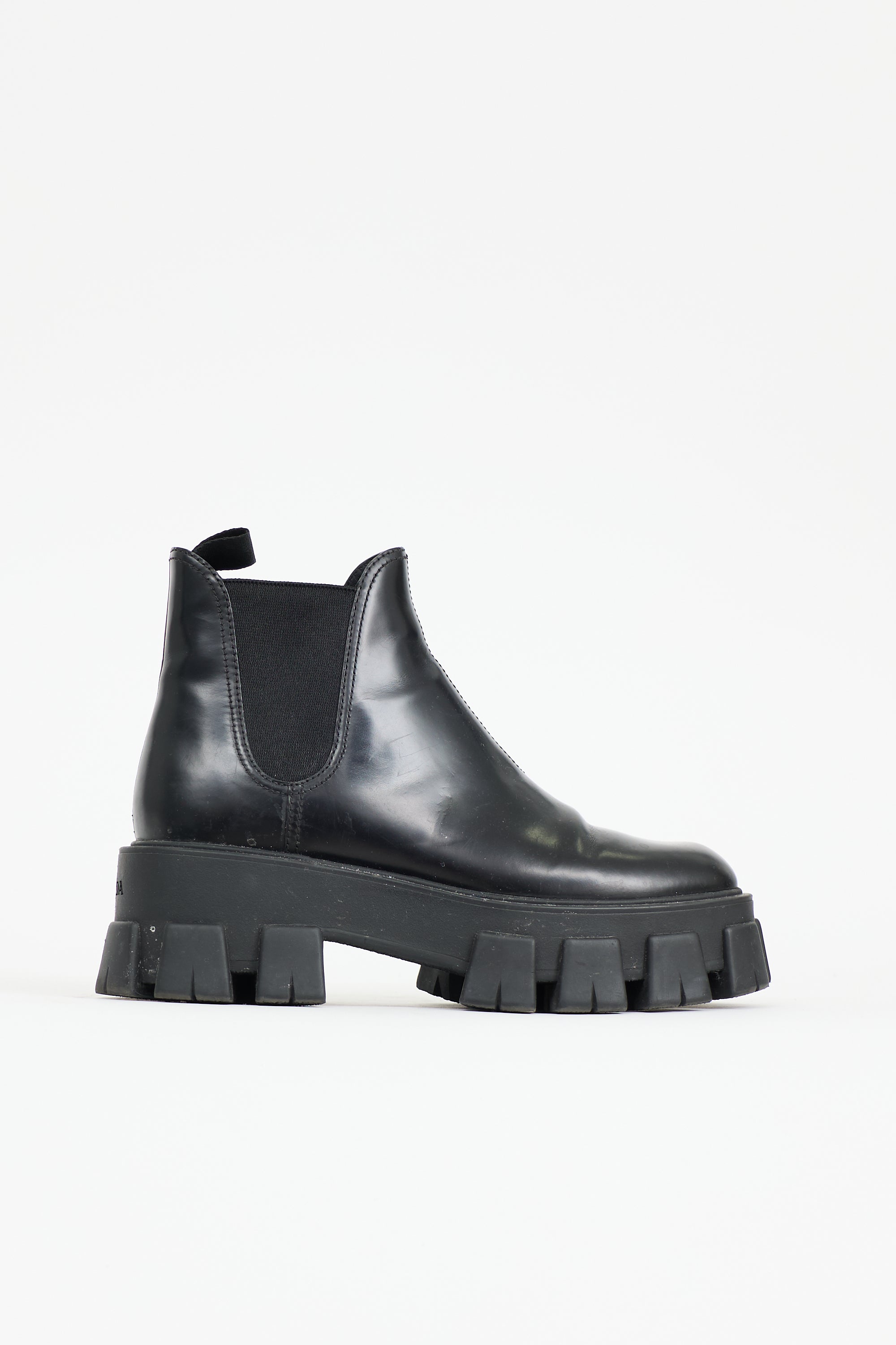 Pre-owned Prada black leather boots featuring rounded toe, elasticized gore, and rubber treaded outsole with logo at back.