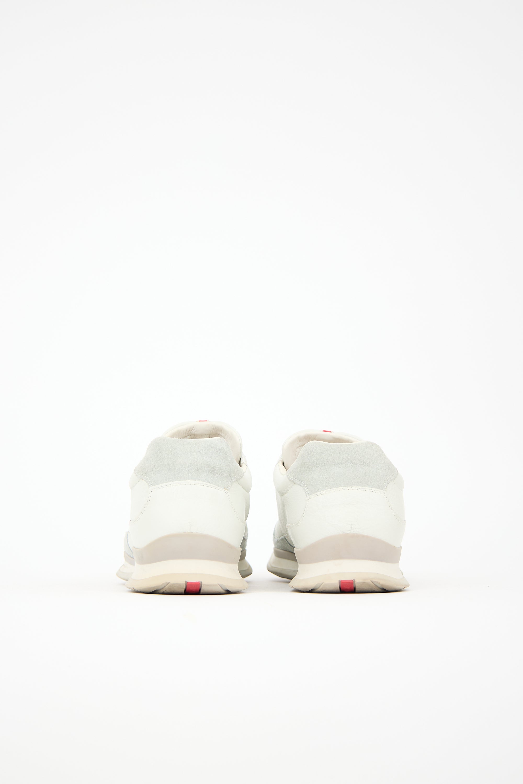Pre-owned Prada Sport green leather sneakers featuring square toe, lace up front, suede and leather upper, and rubber outsole.