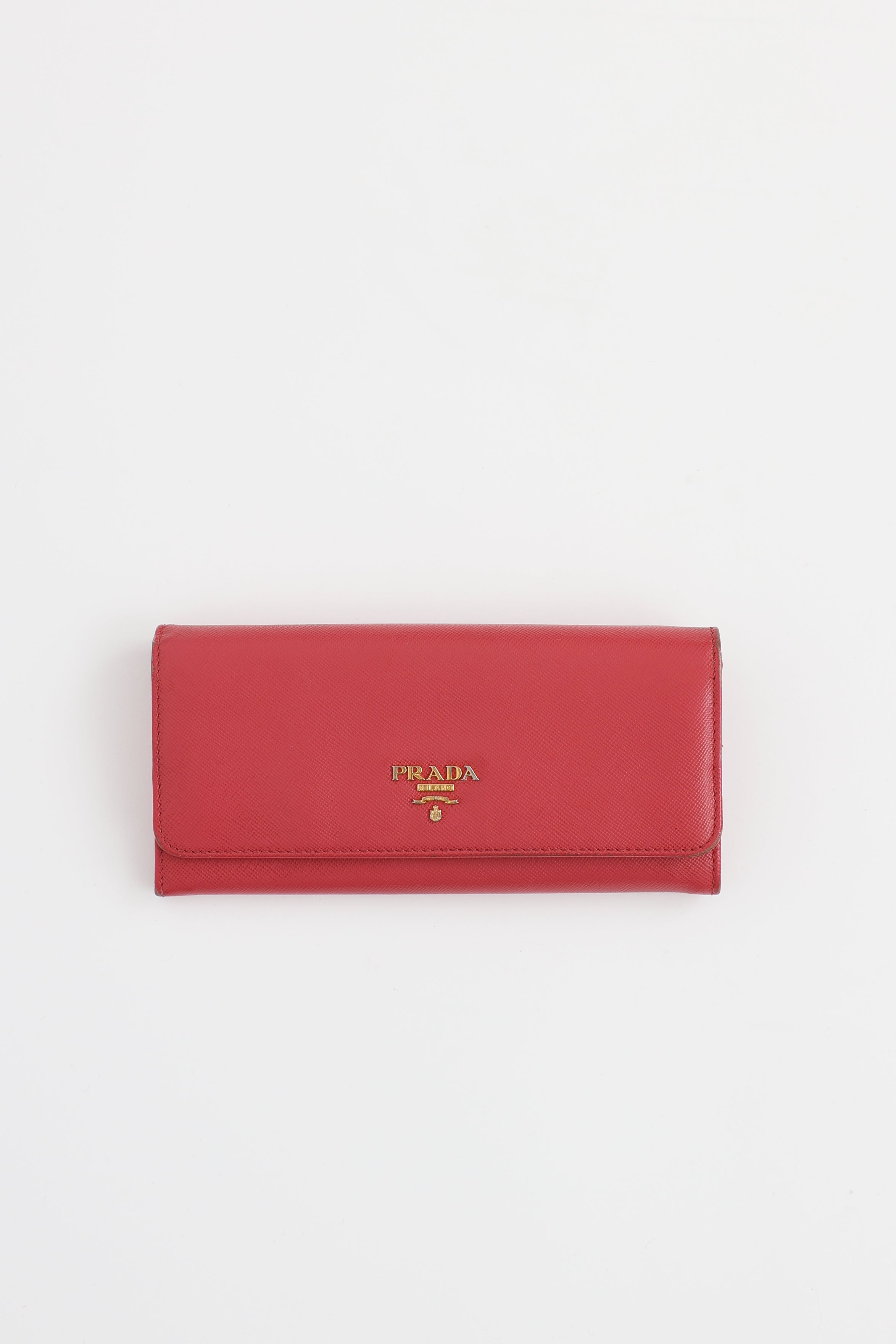 Pre-owned Prada pink flap wallet featuring Saffiano leather, gold tone metal logo at front, zip pocket at back face, top flap with snap closures, two main compartments, two bill slots, two slip pockets at front face, ten card slots, and one zip pocket divider at middle.