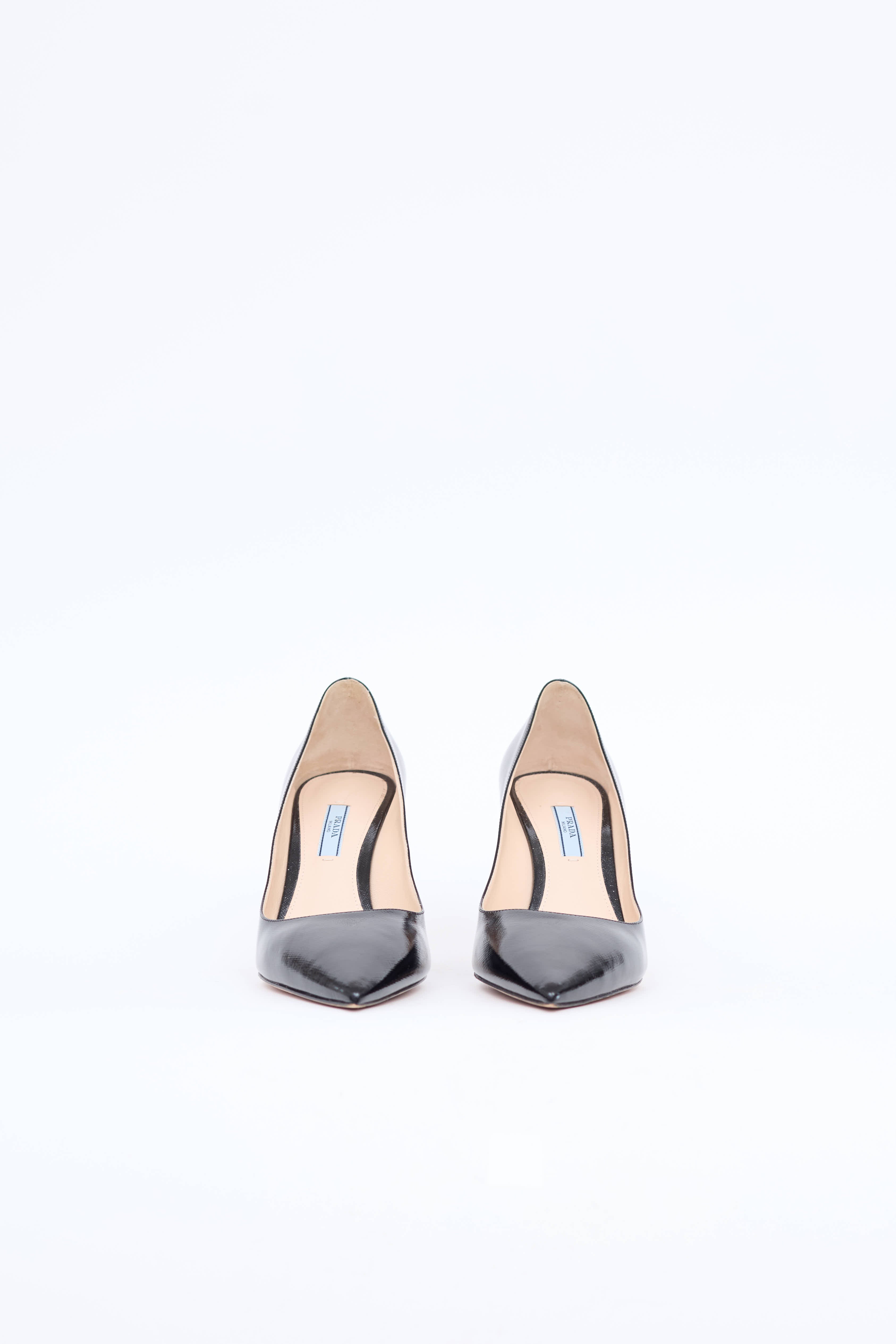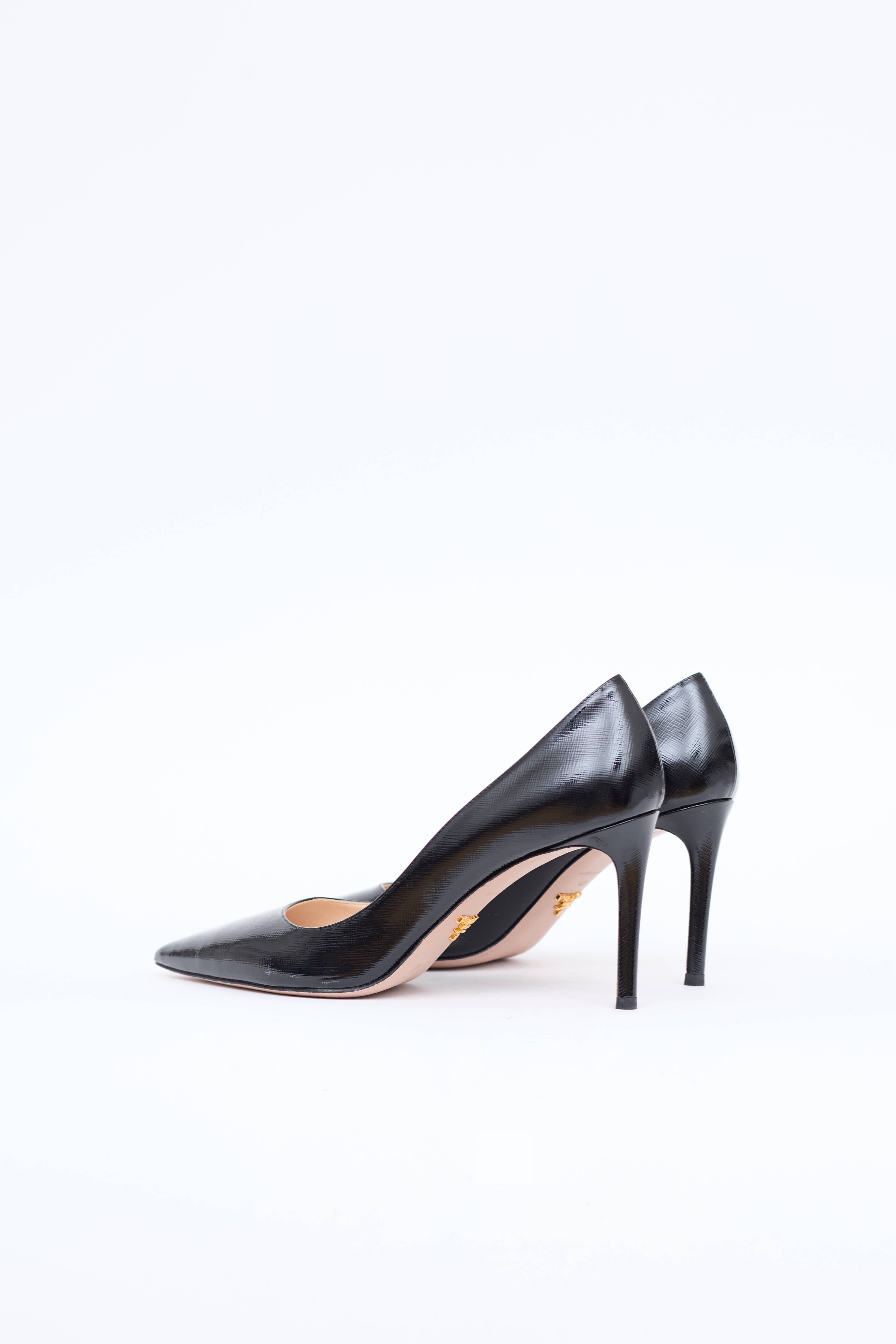 Pre-owned Prada black saffiano leather pump featuring pointed toe and covered stiletto heel.
