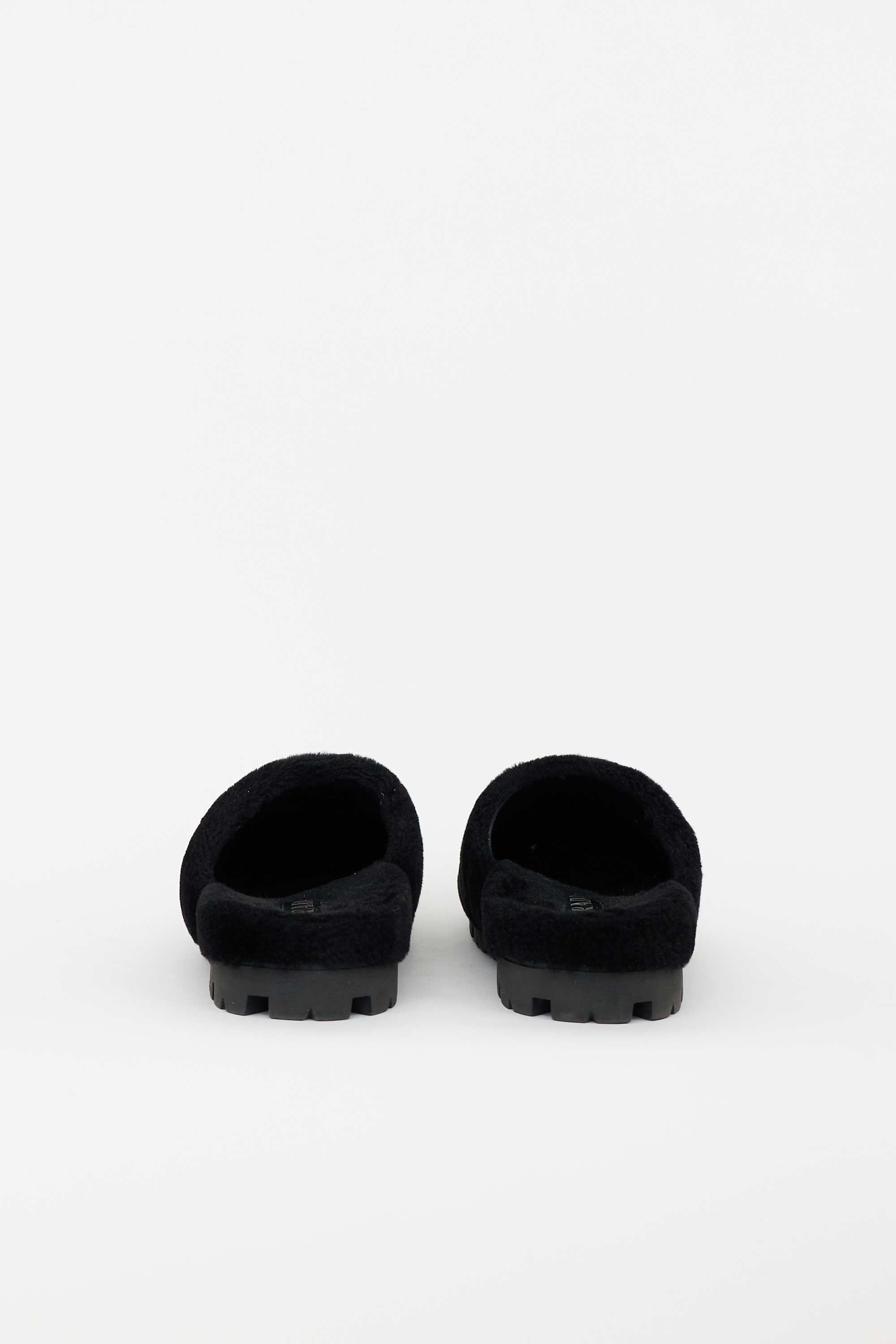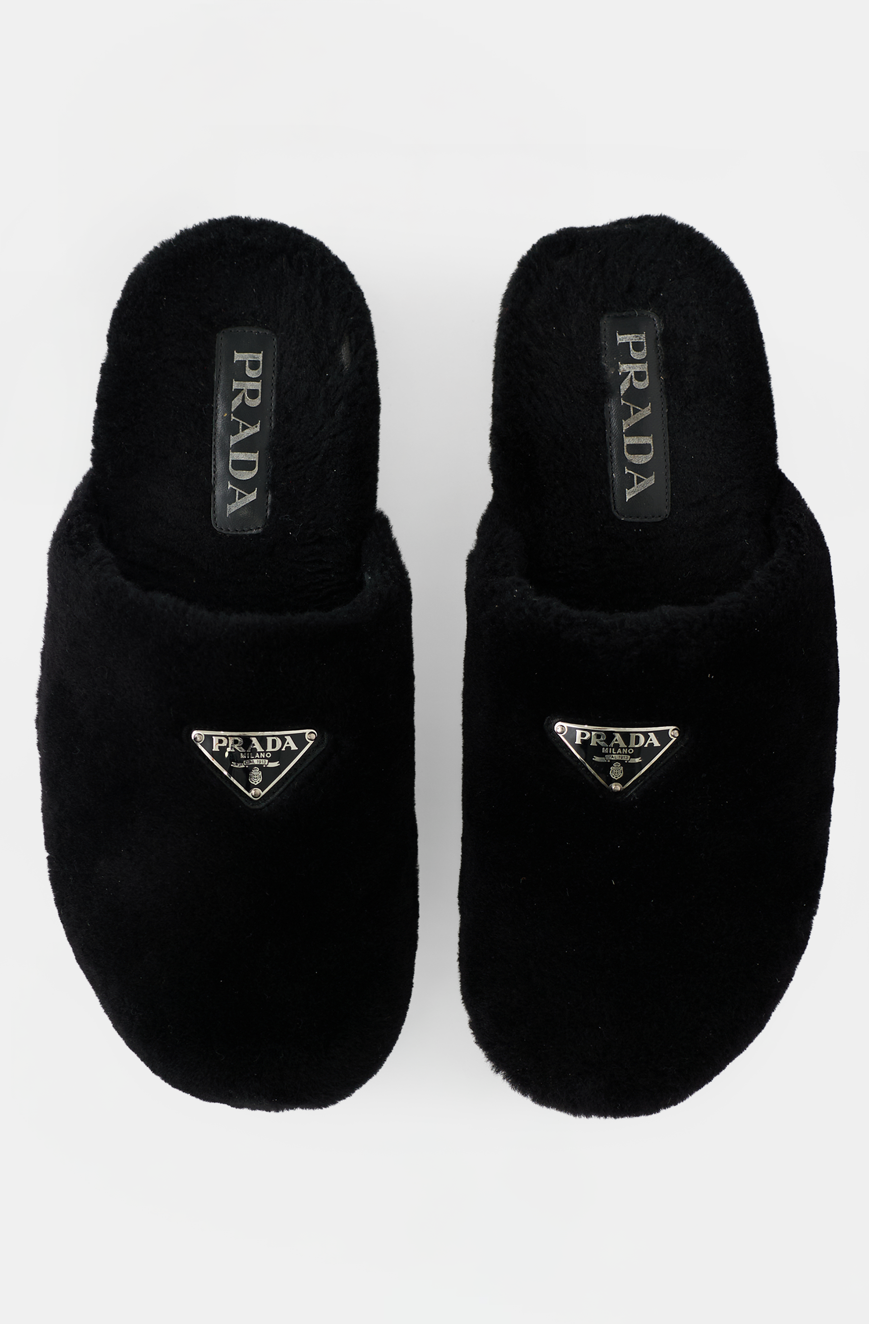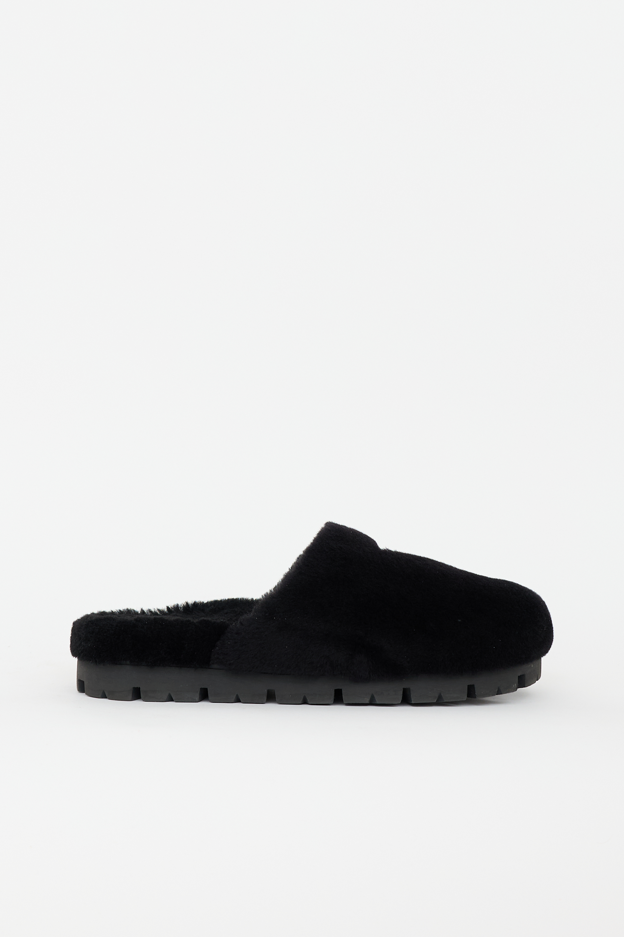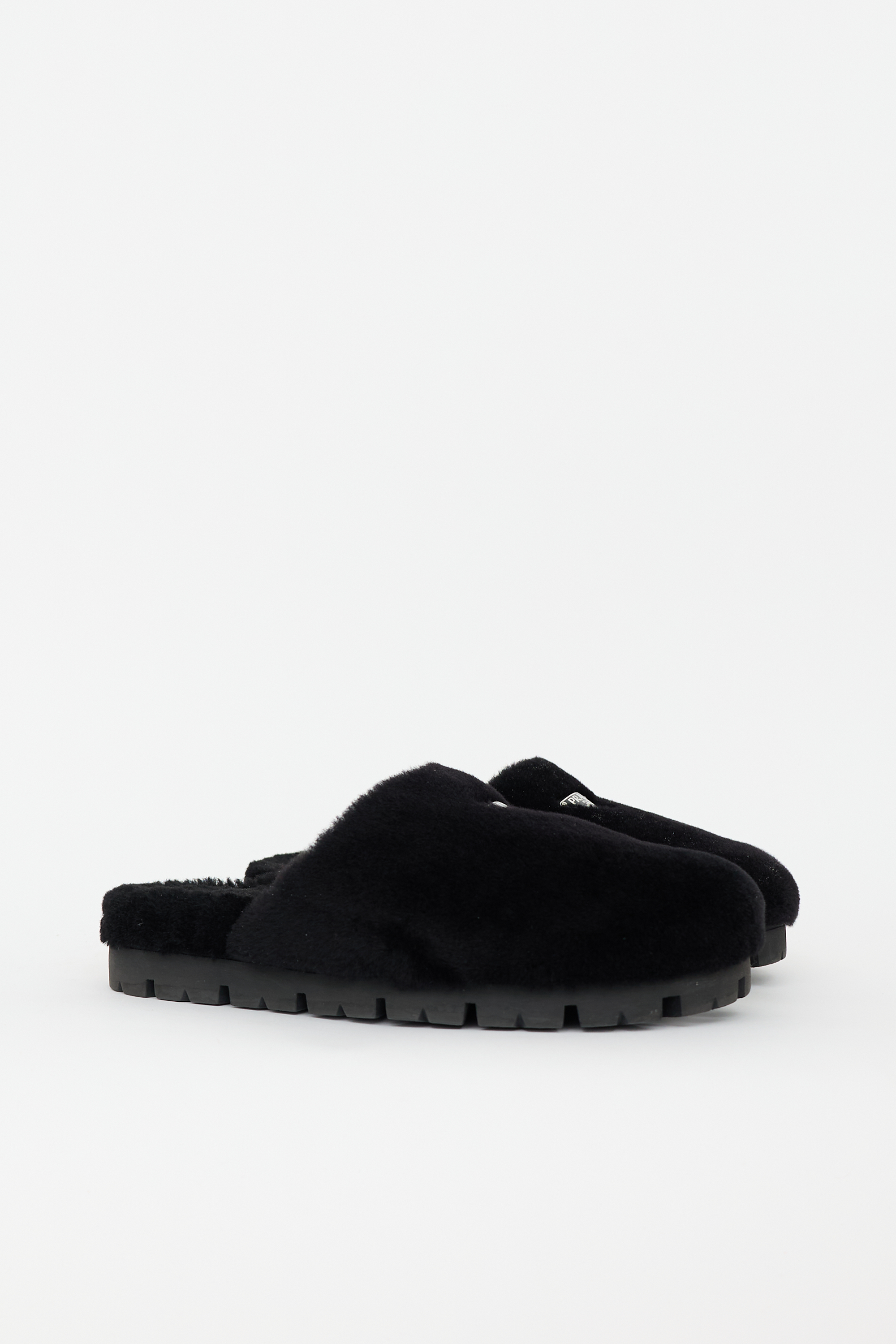 Pre-owned Prada black shearling mules featuring a rounded toe, silver tone enameled triangle logo hardware at vamp, slip on entry, and treaded rubber sole. Comes with original box.