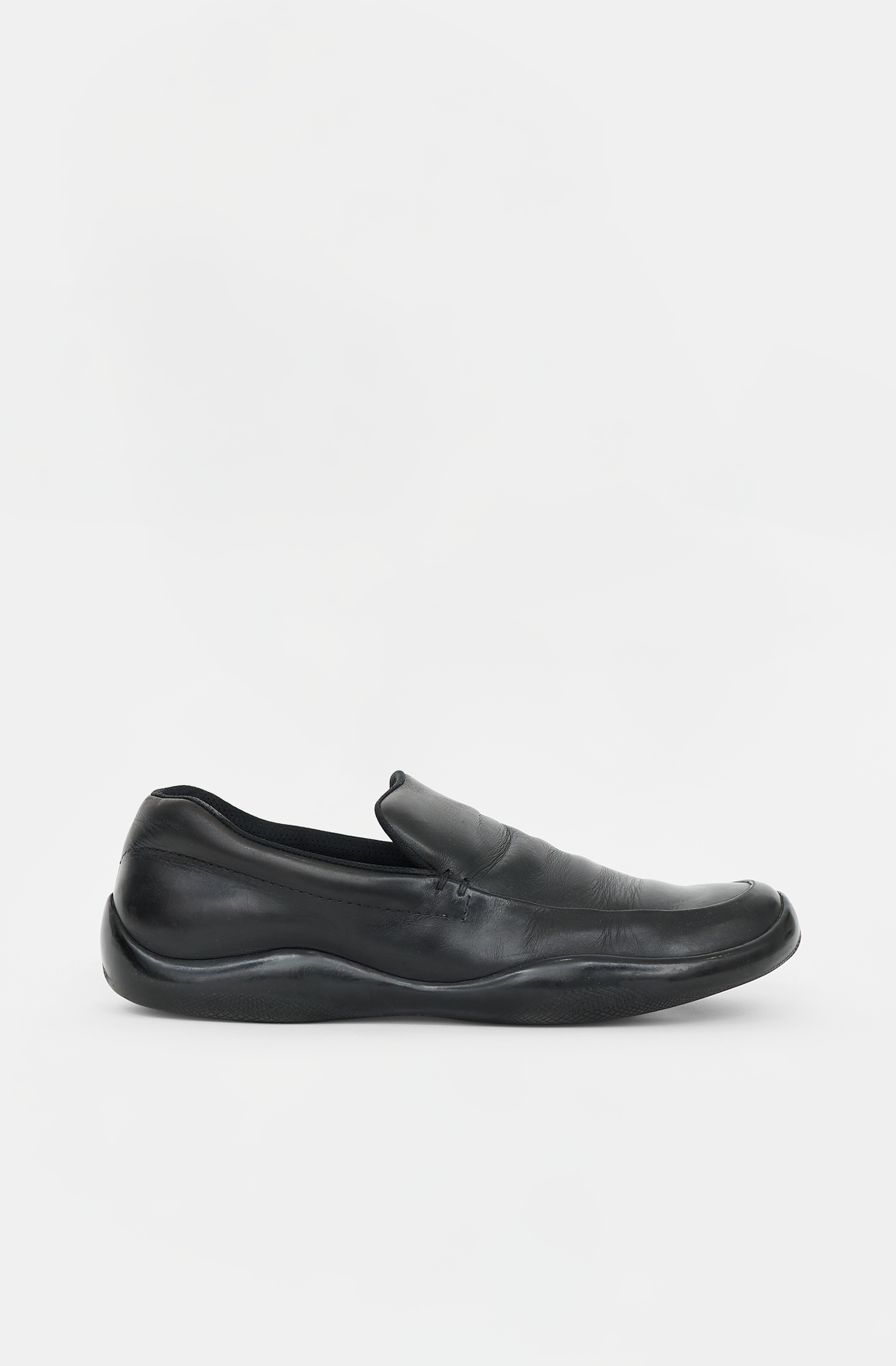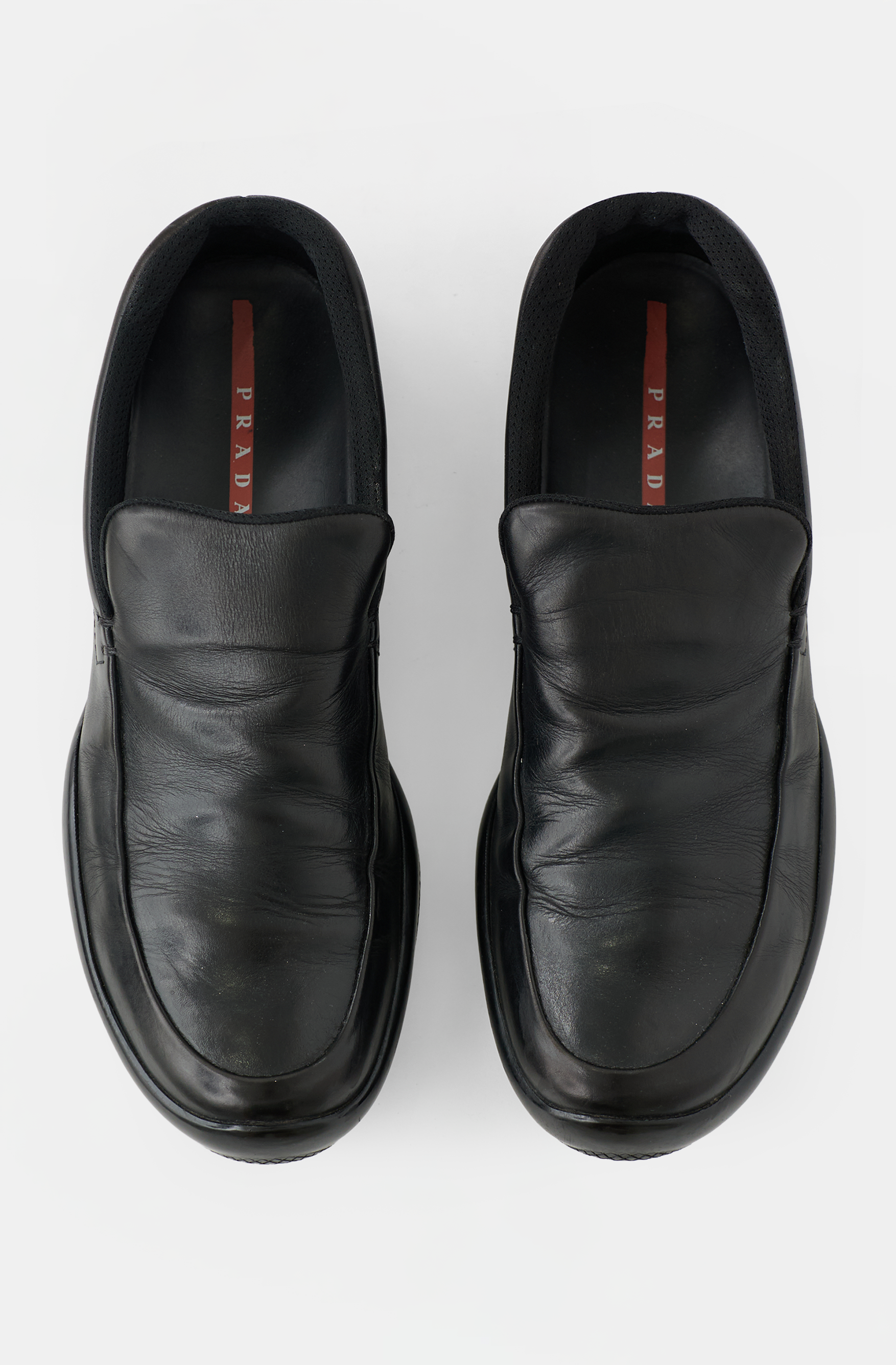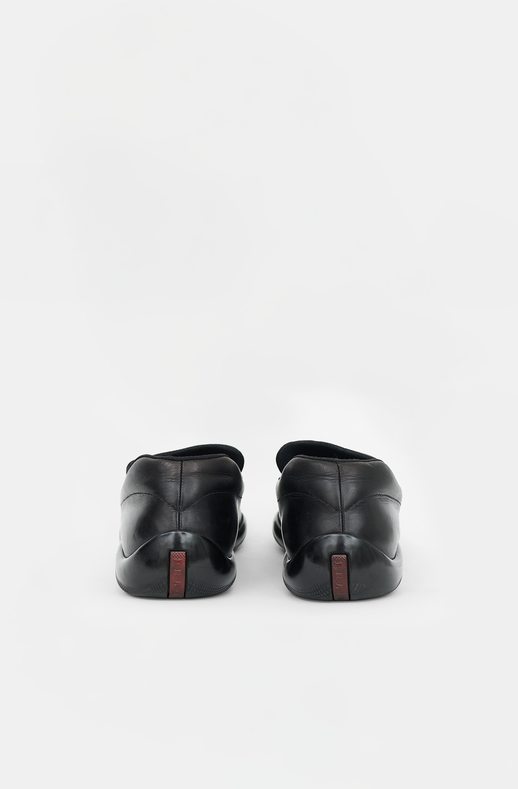 Pre-owned Prada Sport black leather loafer featuring a rounded toe, notched topline, signature rubber sole, and red stripe at counter.