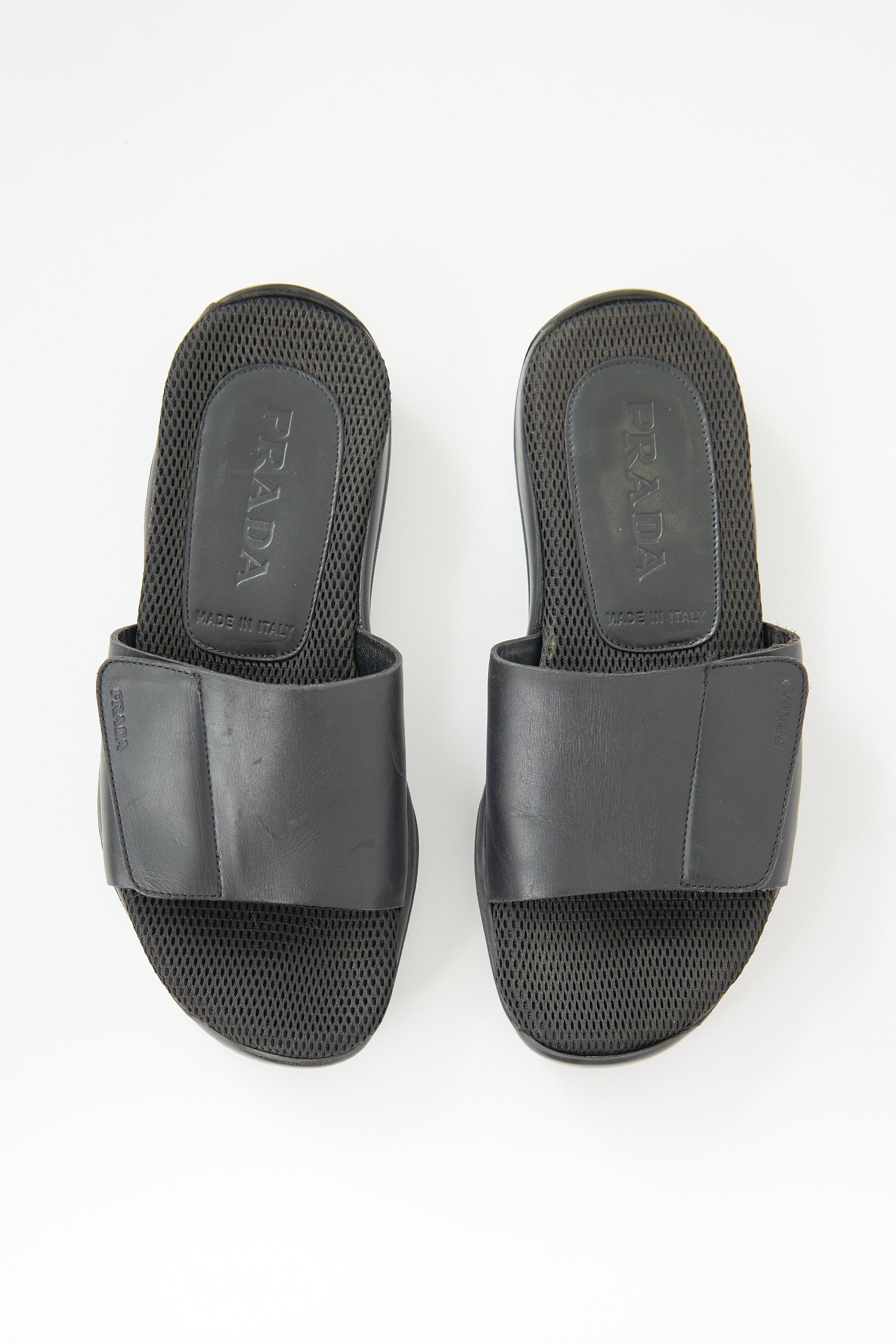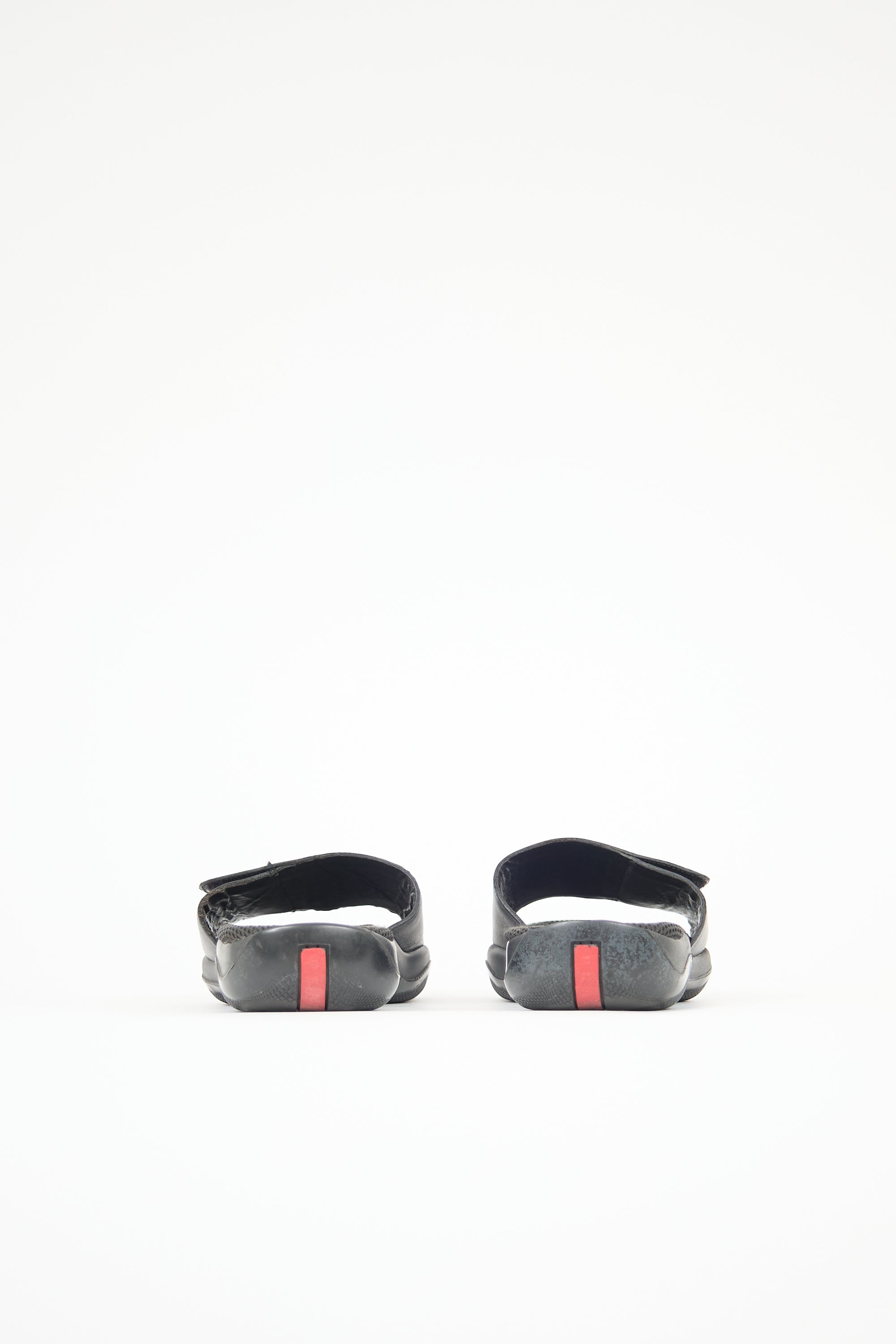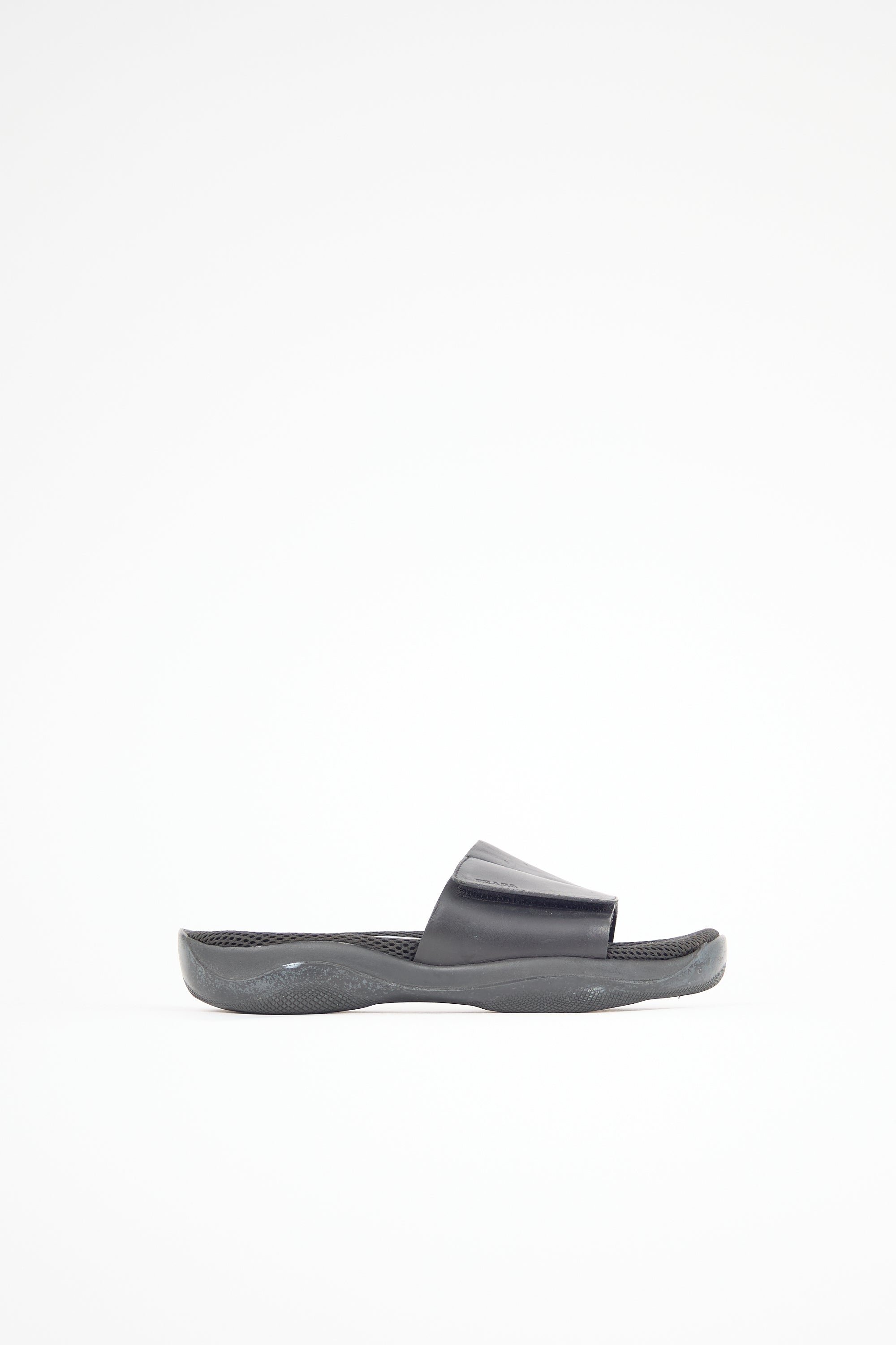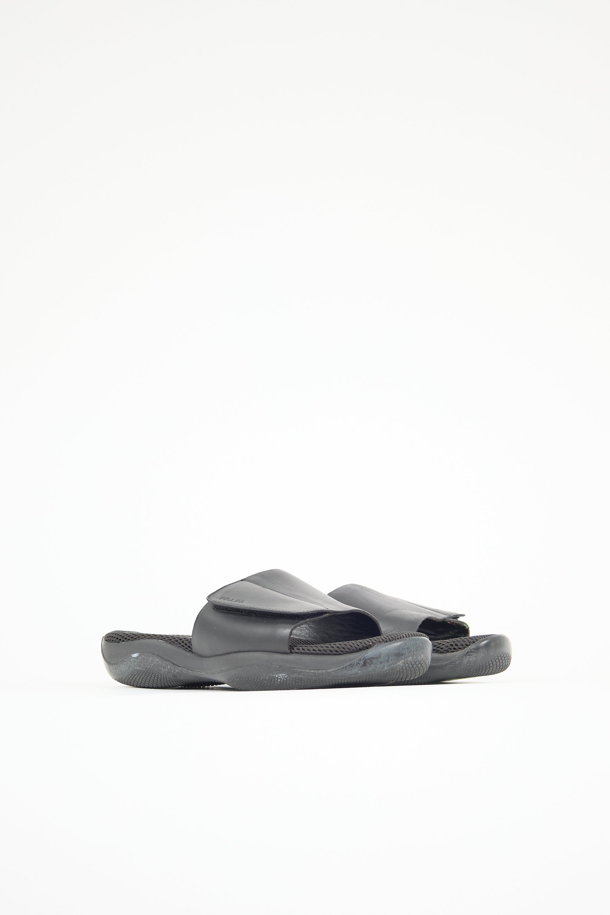 Pre-owned Prada Sport black slides featuring rounded toe, wide leather vamp strap with debossed logo and Velcro closure, mesh footbed, and Vibram rubber sole.