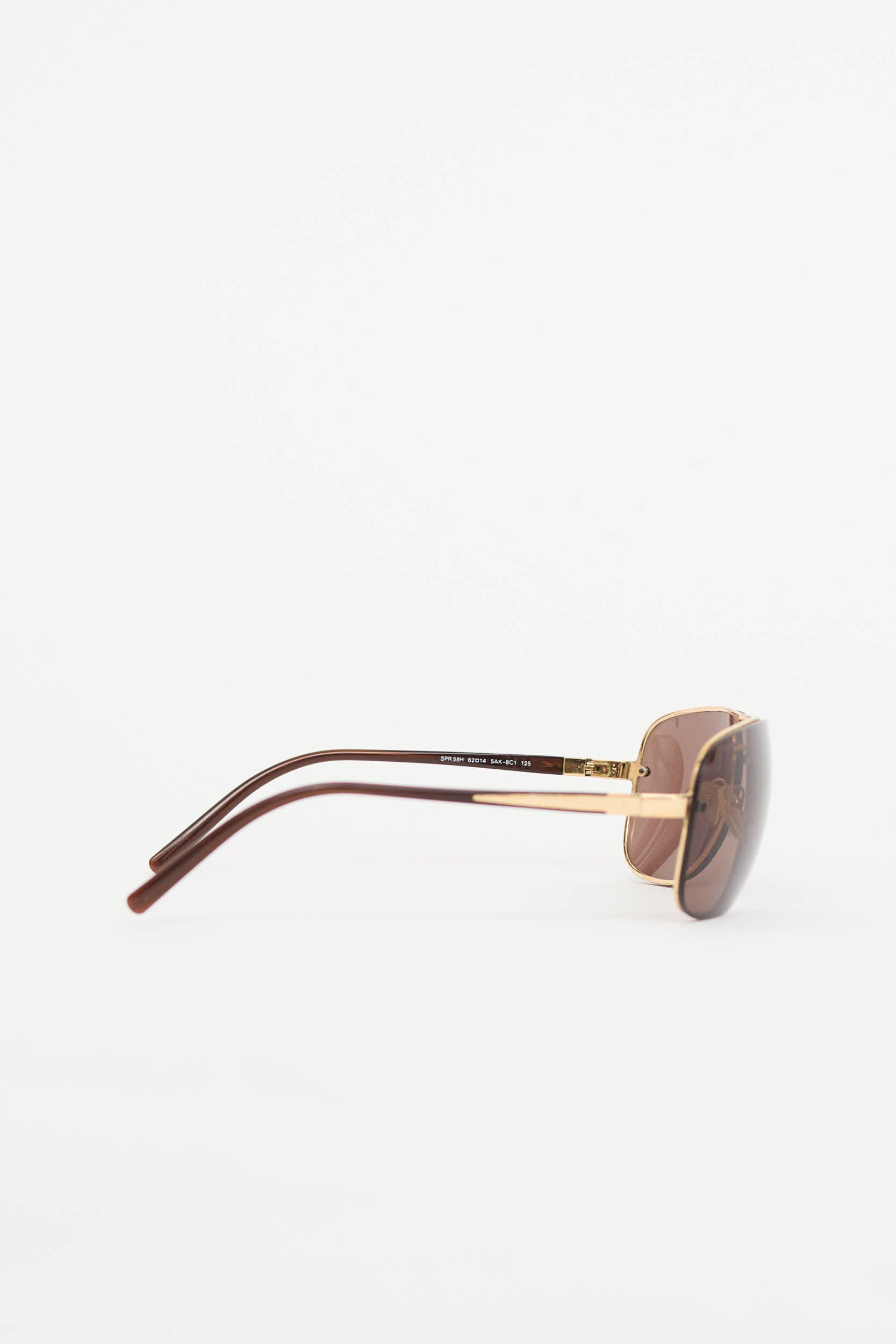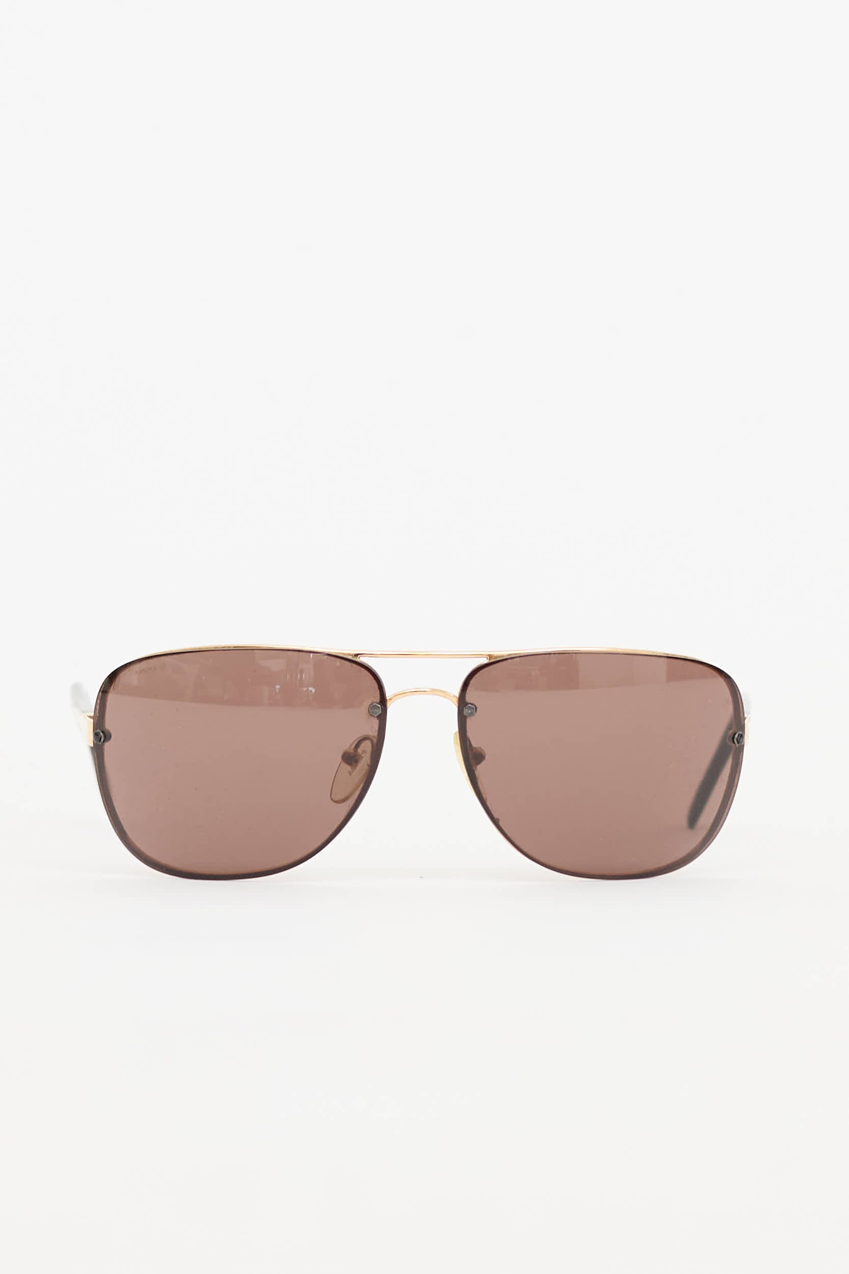 Pre-owned Prada brown SPR 58H Sunglasses featuring round aviator wire frames, brown tinted lenses, and gold toned engraved logo text at temples. Includes original case.