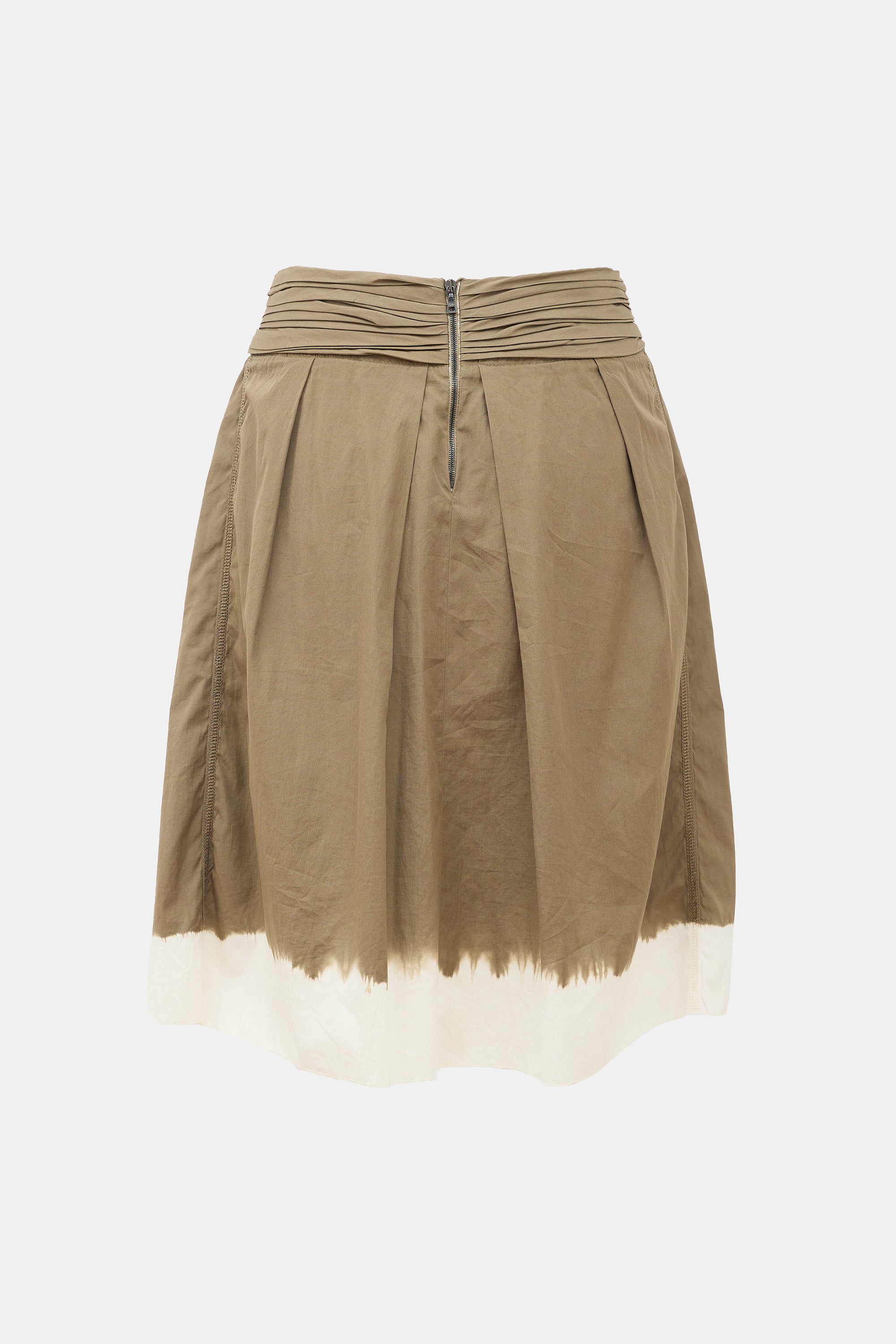Pre-owned Prada Spring/Summer khaki green and white dip dye midi skirt featuring pleated waist, in seam pockets, layered front panel, side vents, raw hem, and concealed back zip. Produced in 2006. Attributed to Miuccia Prada.