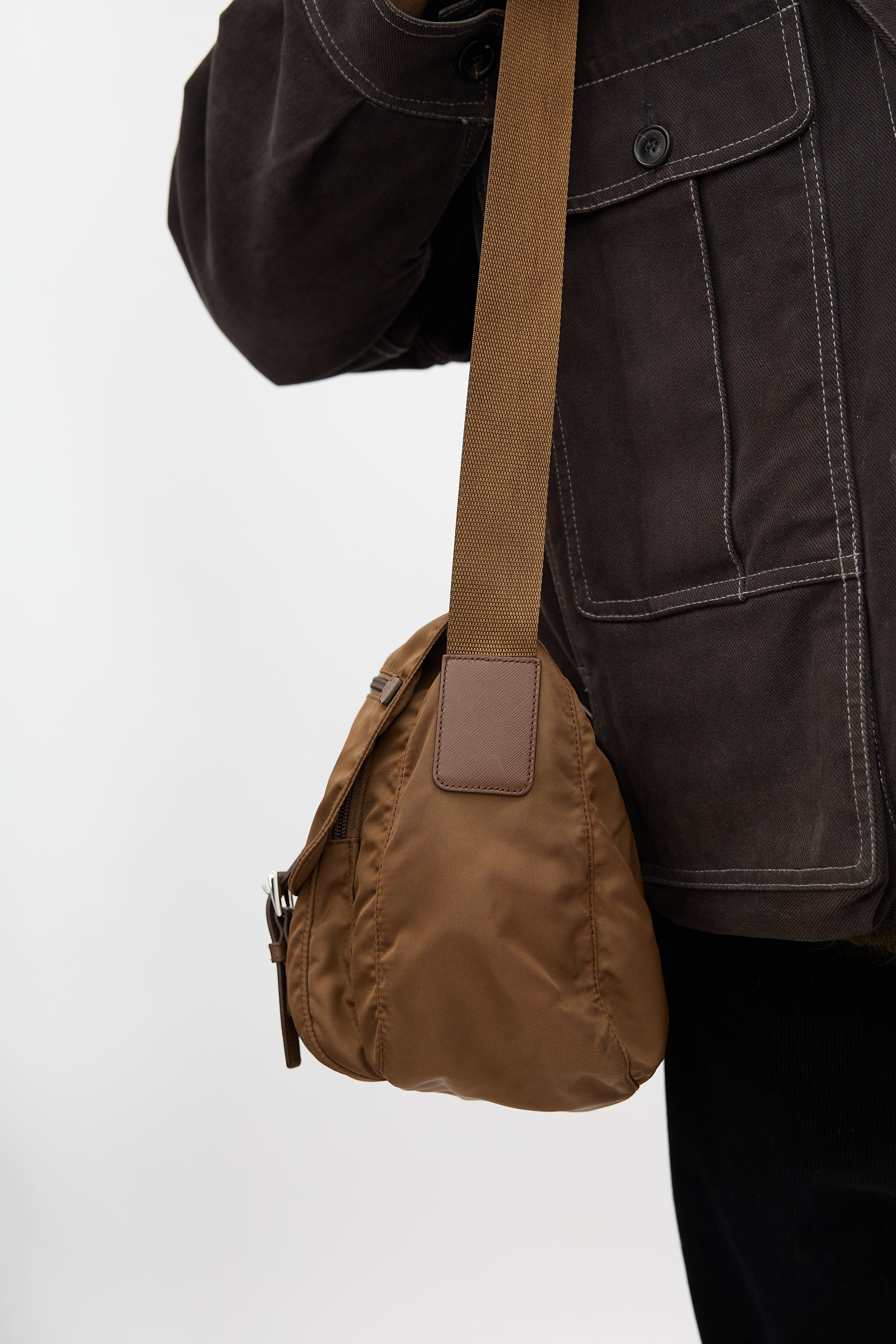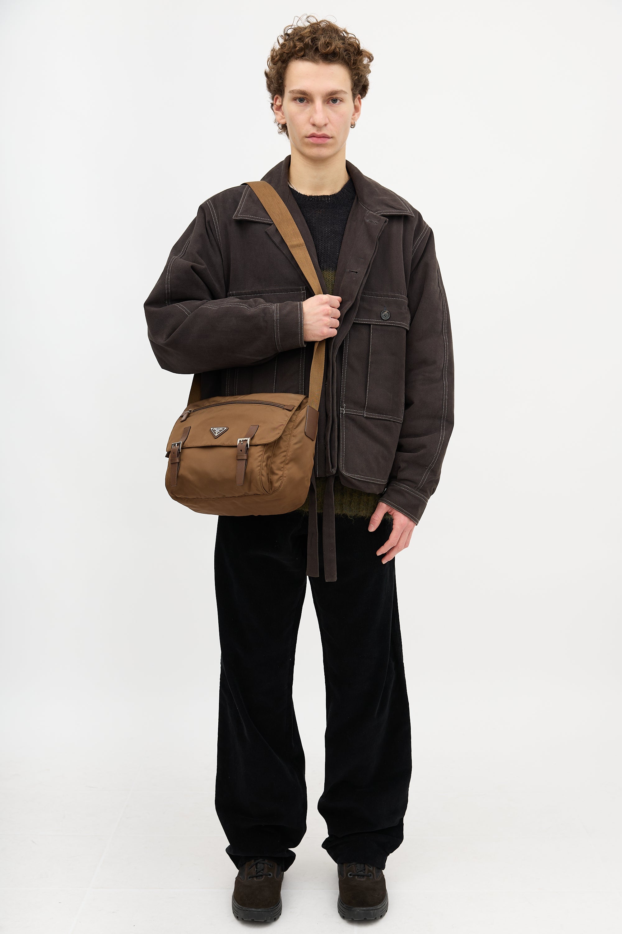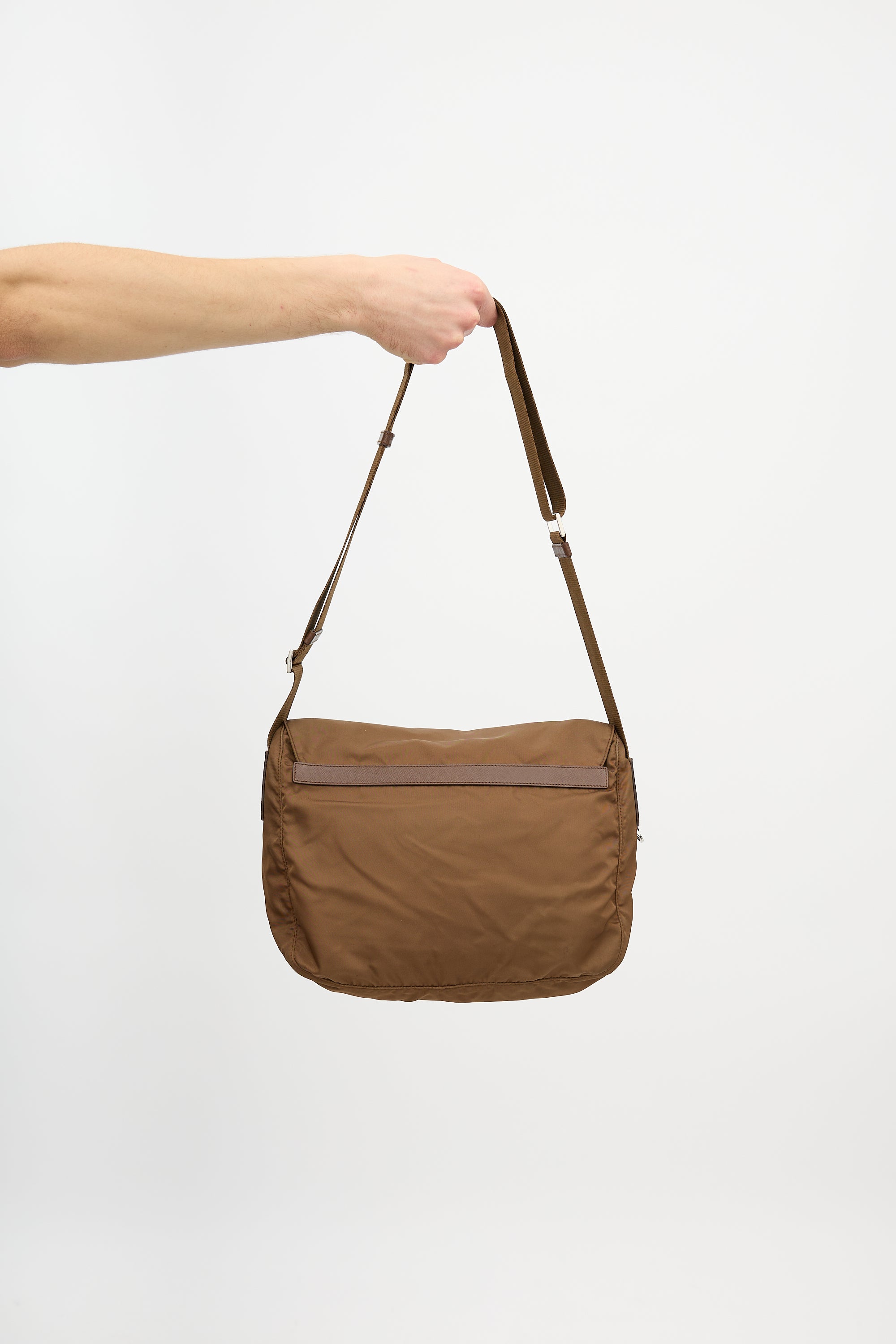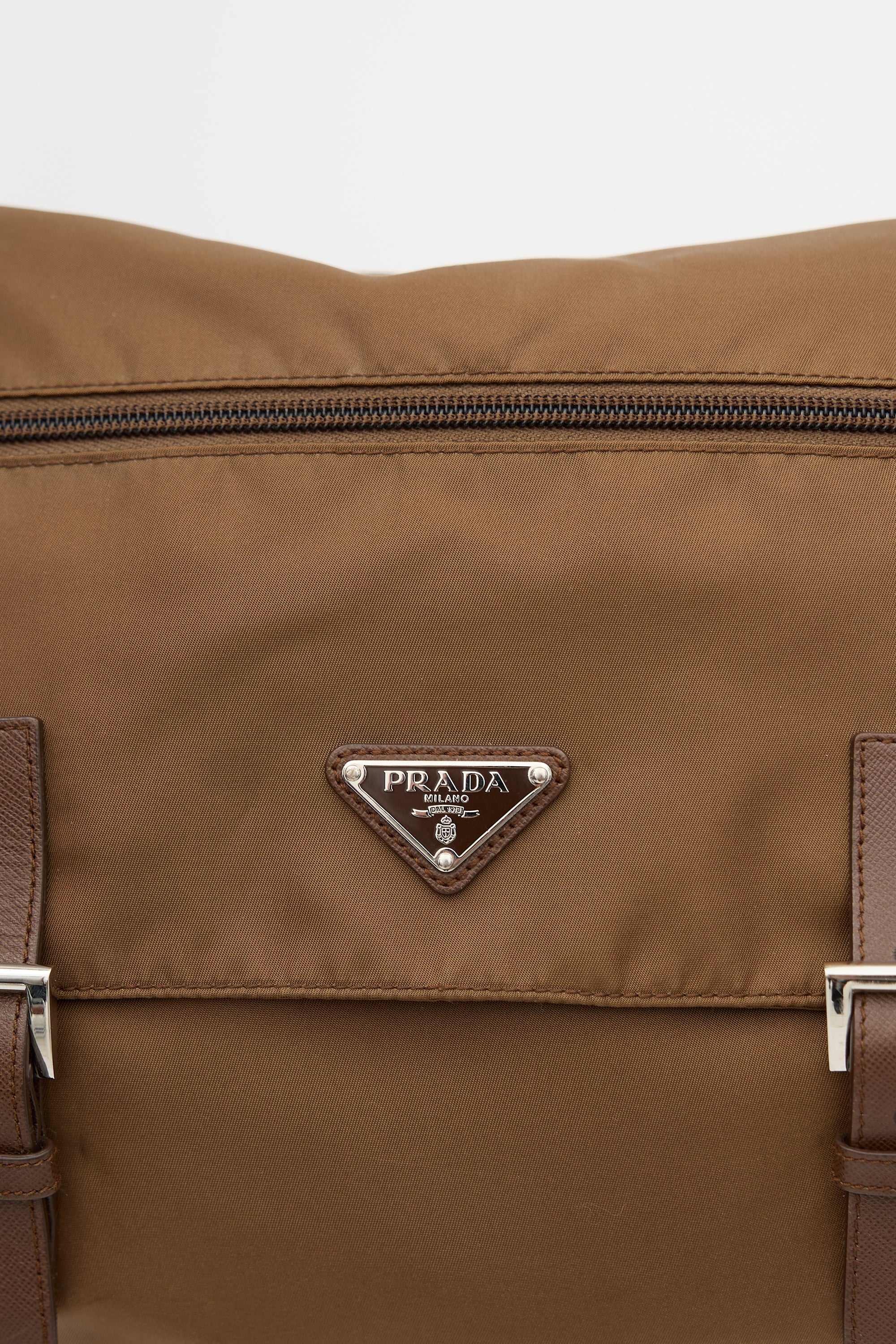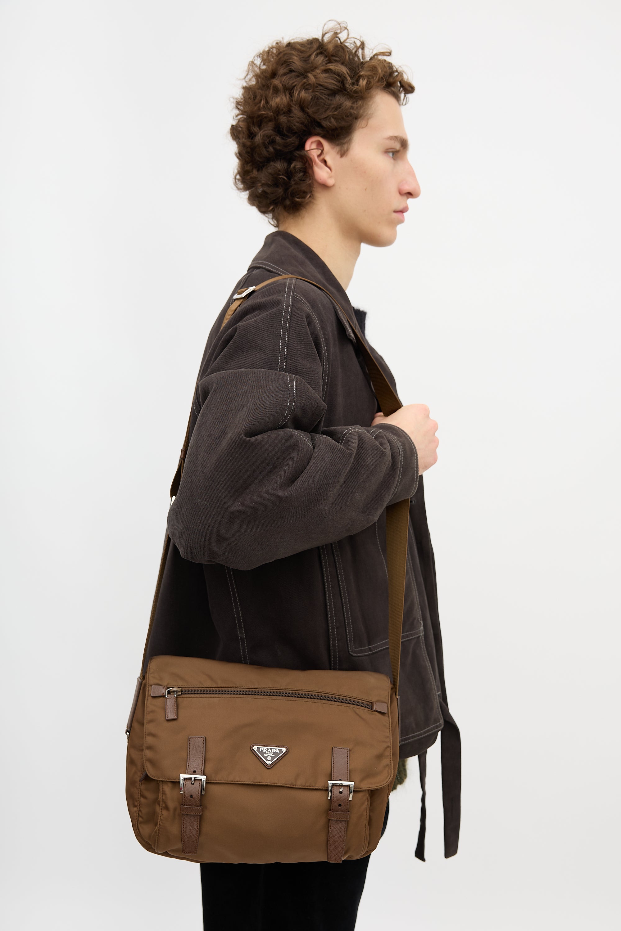 Pre-owned Prada brown Tessuto nylon messenger bag featuring adjustable webbed crossbody strap, silver tone hardware, Saffiano leather trims, enameled triangle logo plaque at front, top flap with adjustable buckle strap closures and top zip pocket, one zip pocket at underflap, zip top closure with one main compartment, and one interior zip pocket and one slip pocket.