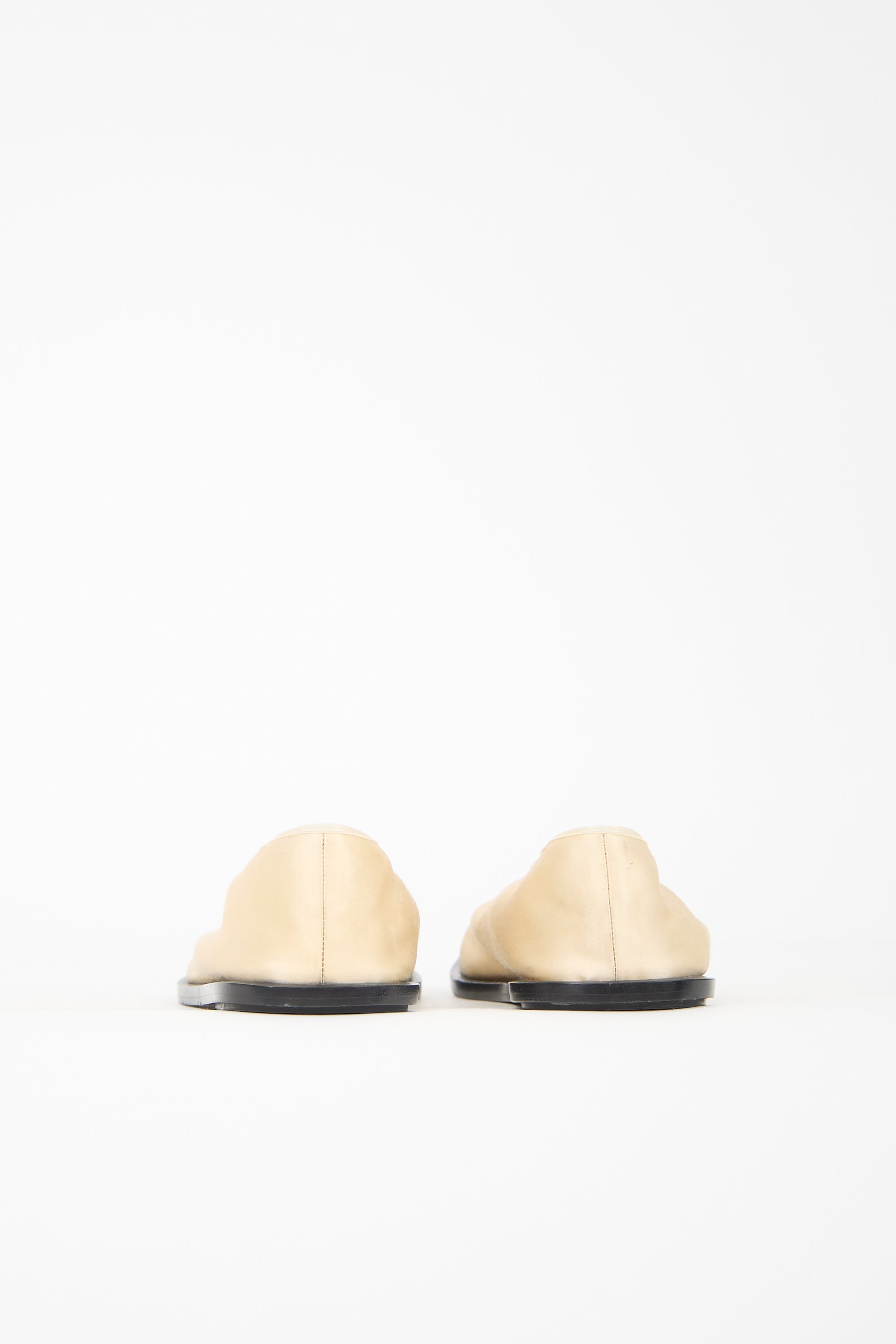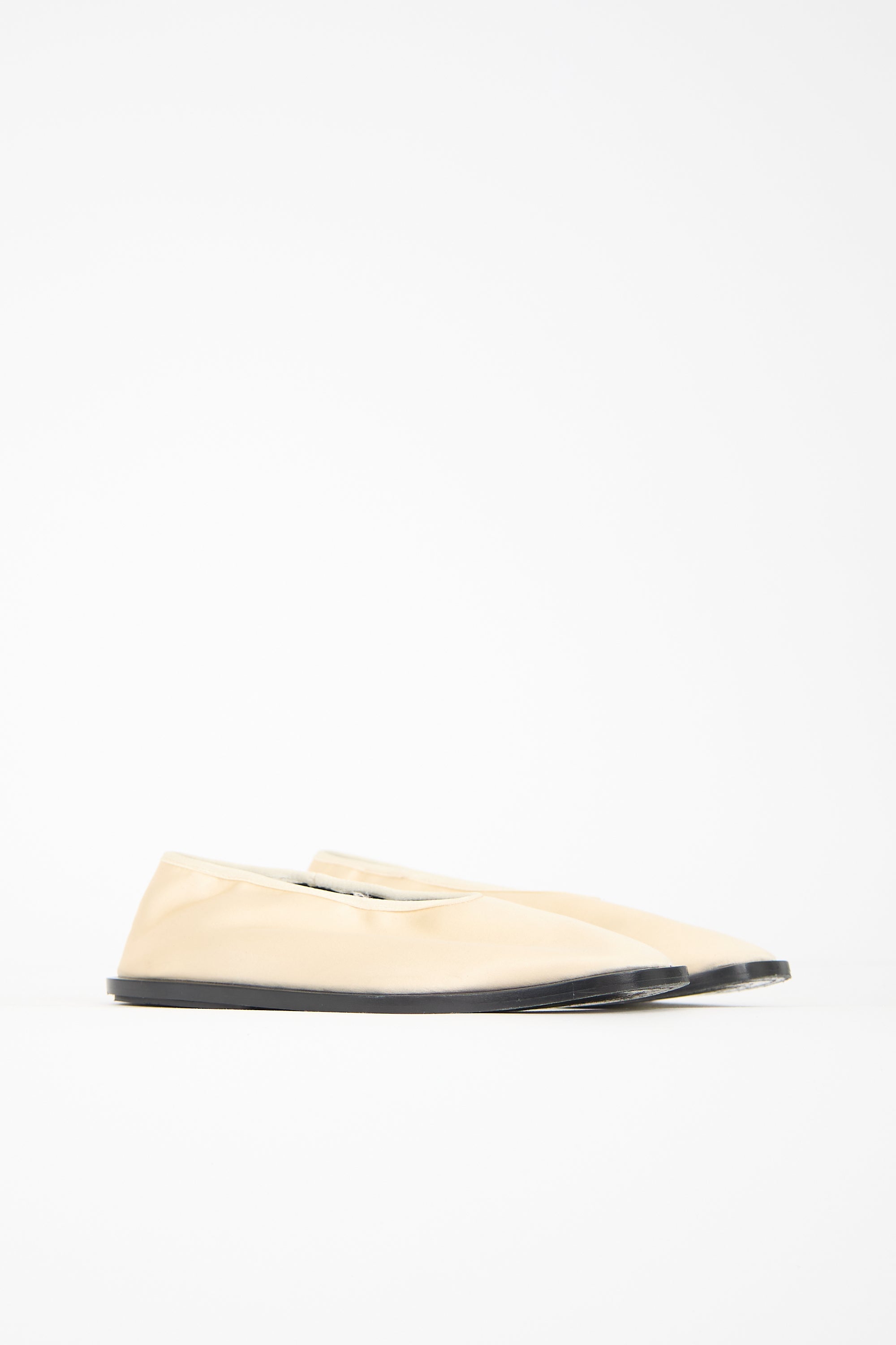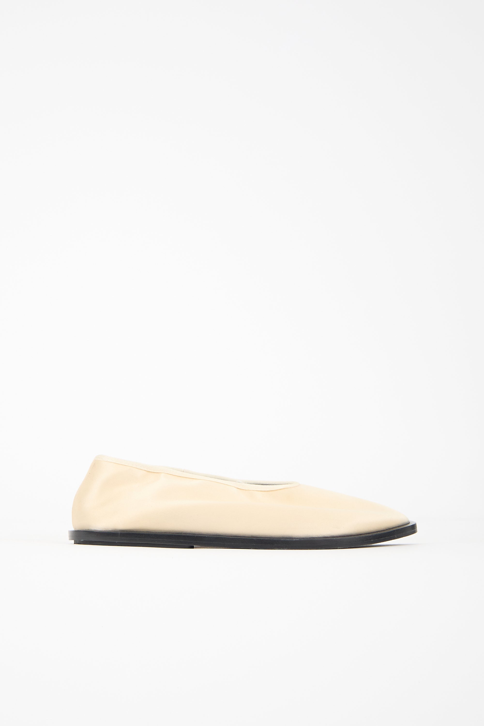Pre-owned Proenza Schouler cream satin flats featuring a squared toe, pull on entry, elasticized collar, and a black leather sole.