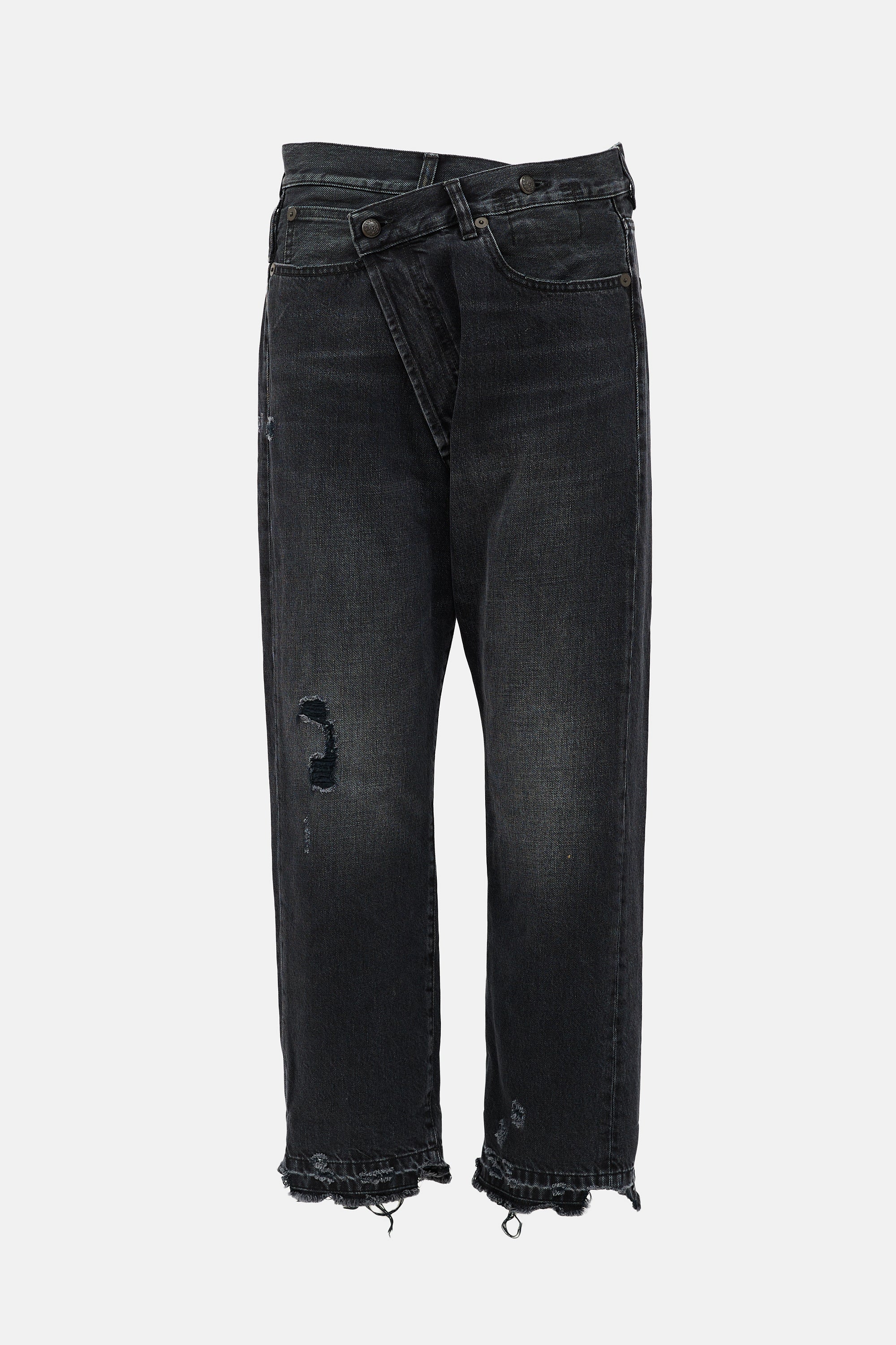 Pre-owned R13 washed black Crossover jeans featuring belt loops, crisscross waist, button fly, five pocket styling, intentional distressing, jacron patch at back, and wide leg.
