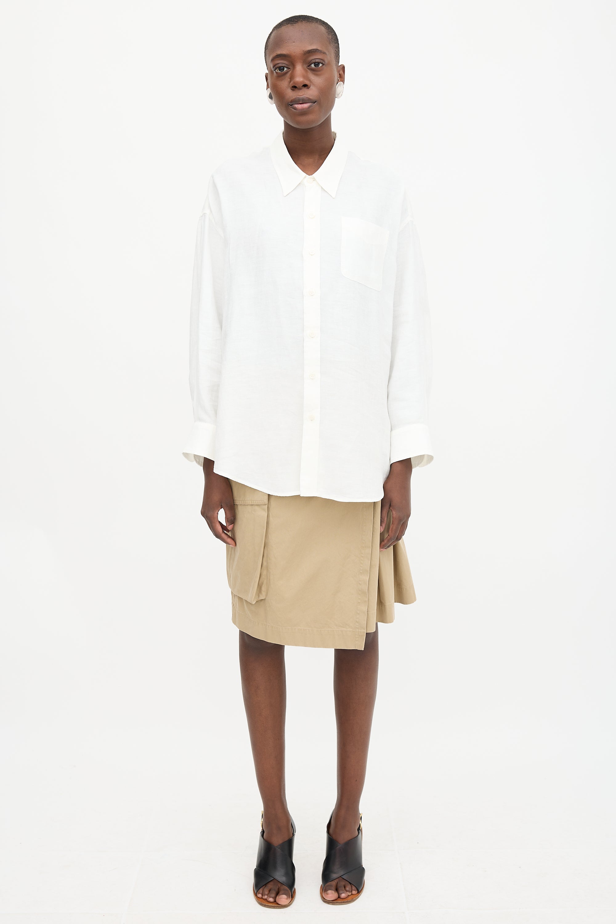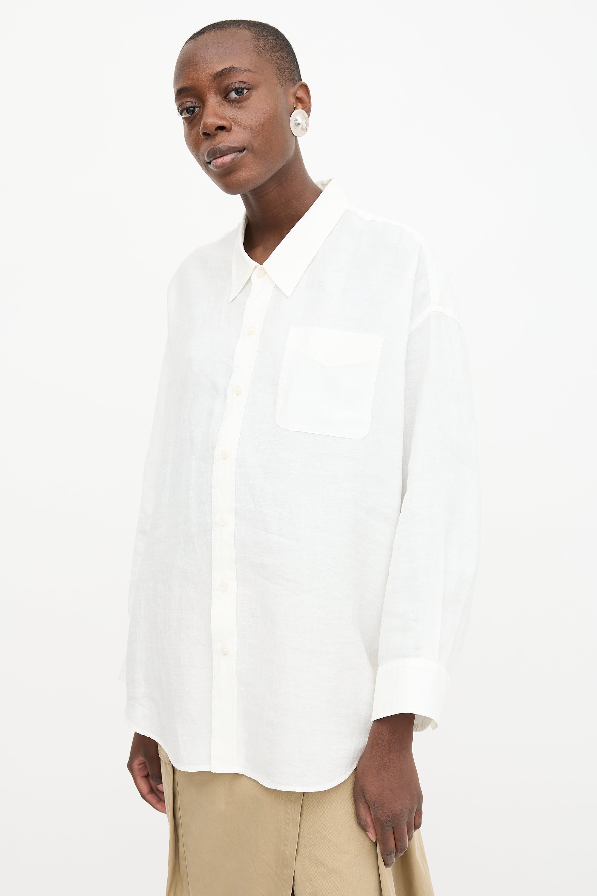 Pre-owned R13 white linen blend Drop Neck shirt featuring a spread collar, button front, patch pocket, hi-low hem, and oversized fit.