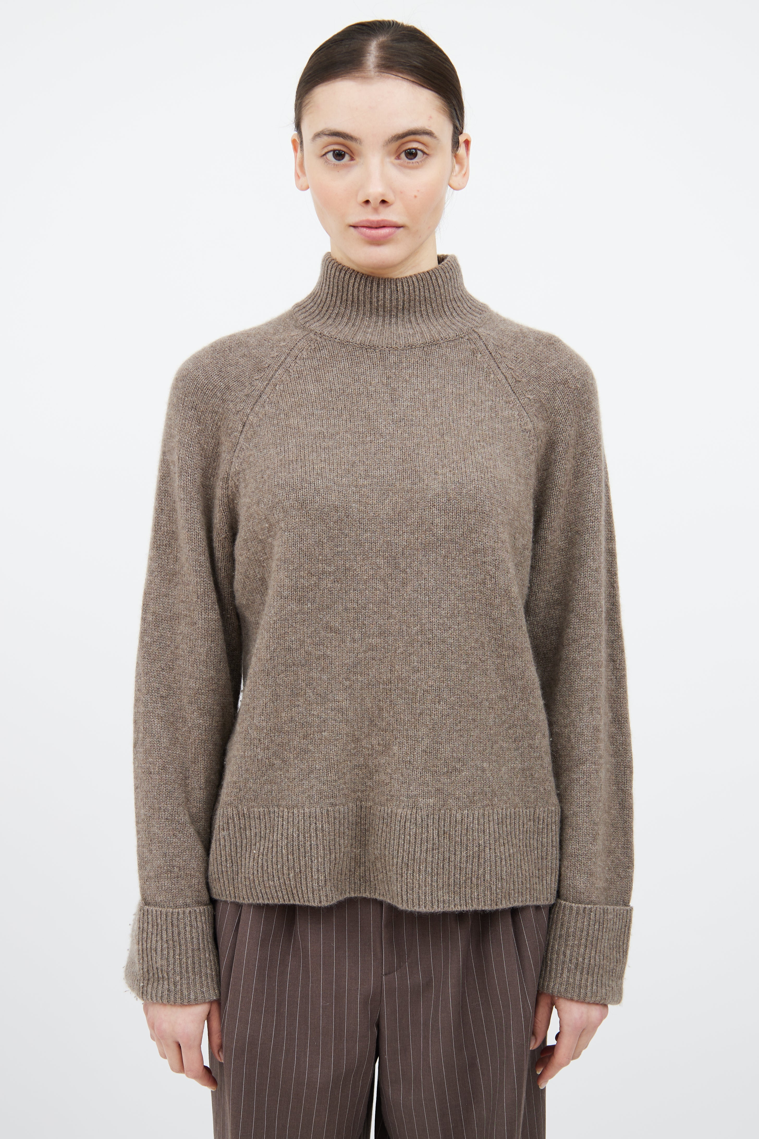 Pre-owned Reformation brown cashmere knit sweater featuring a turtleneck, long cuffed raglan sleeves, and ribbed hem.
