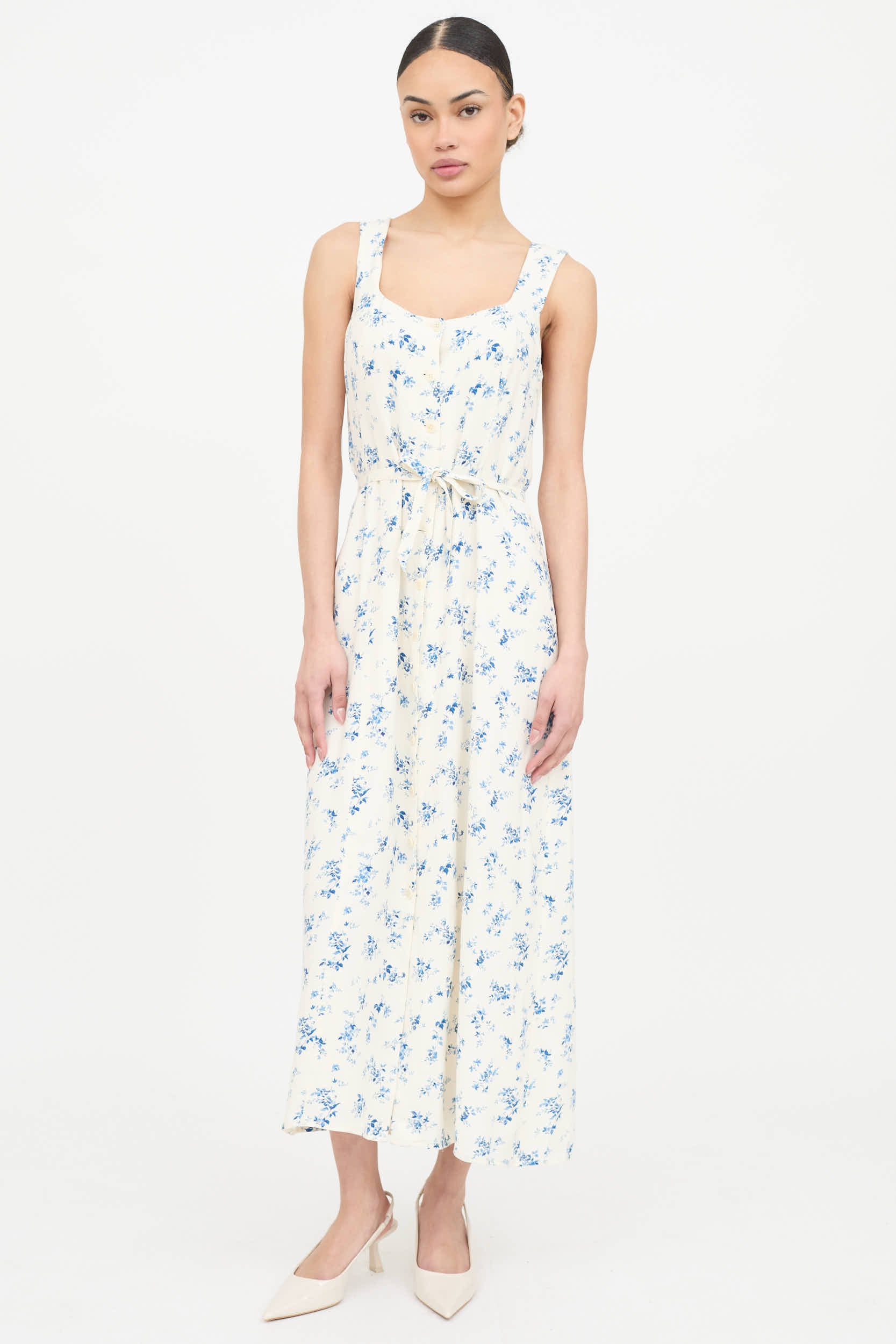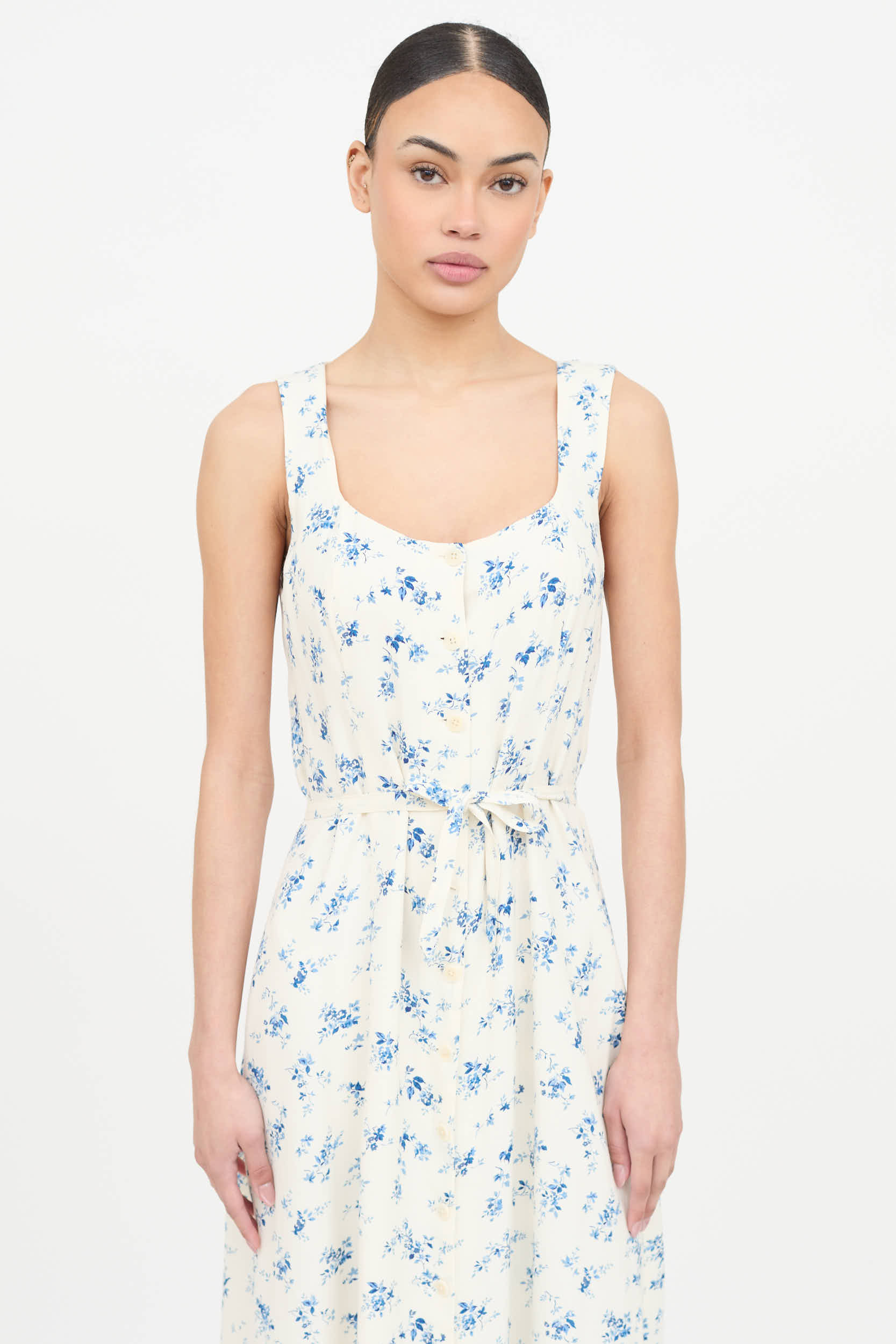 Pre-owned Reformation blue and cream floral dress featuring a U neckline with button up closure, sleeveless shoulders, and tie at waist. Lined.