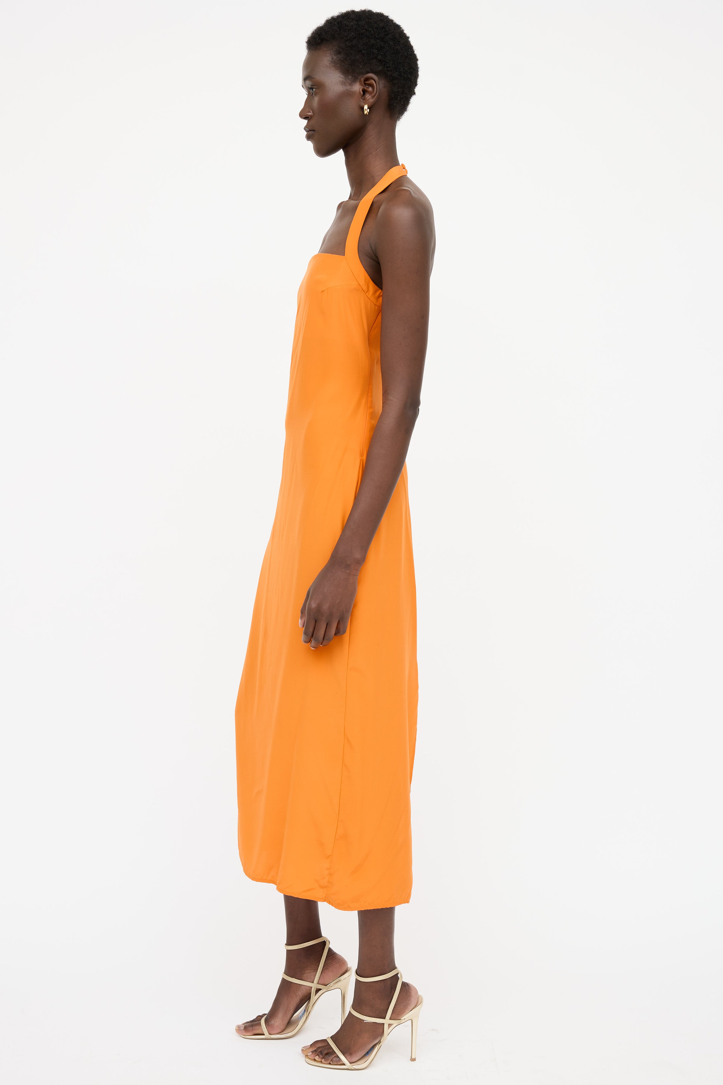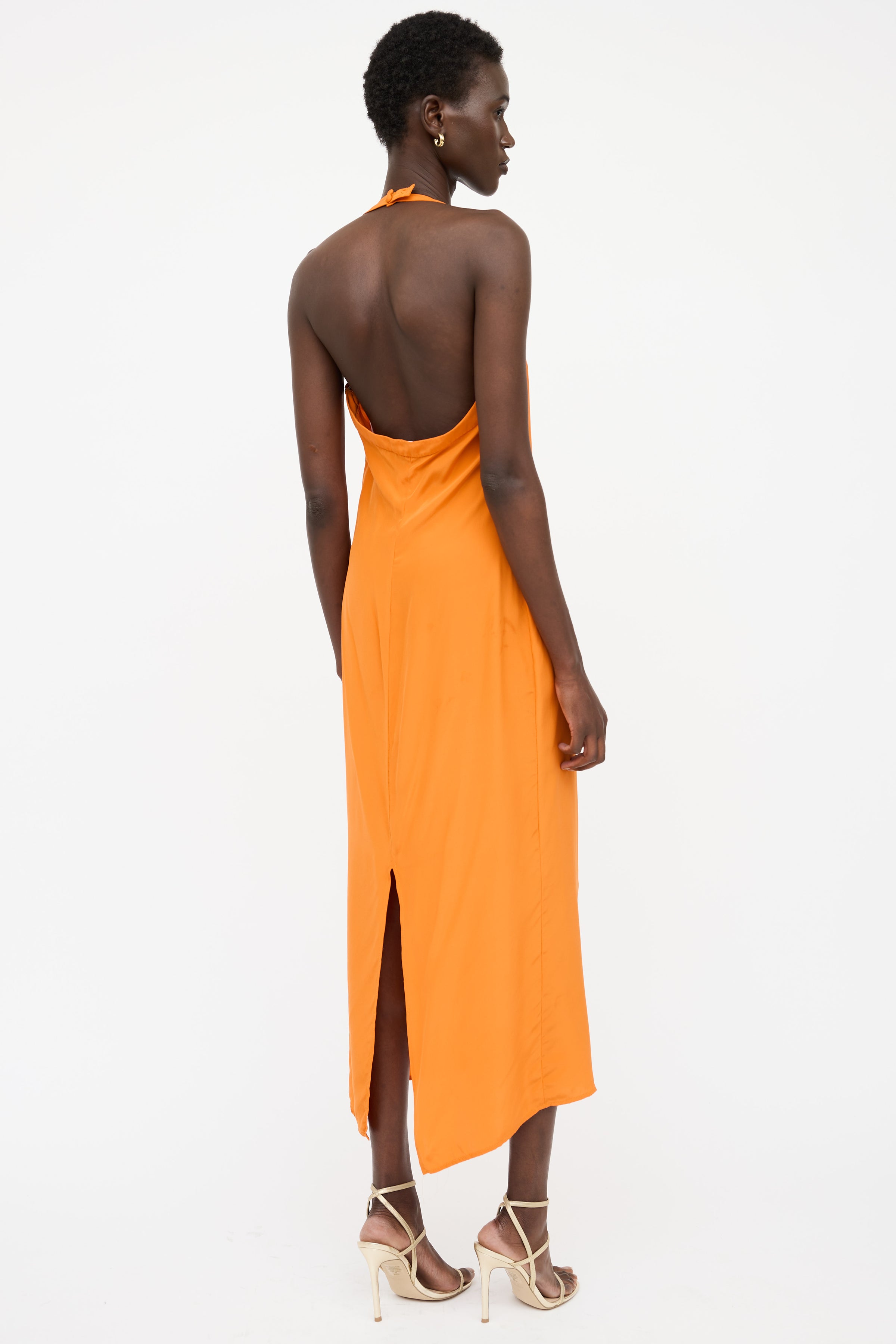 Pre-owned Reformation orange silk halter dress featuring halter neckline with button closure at back, open back, concealed zip at side, and back vent.