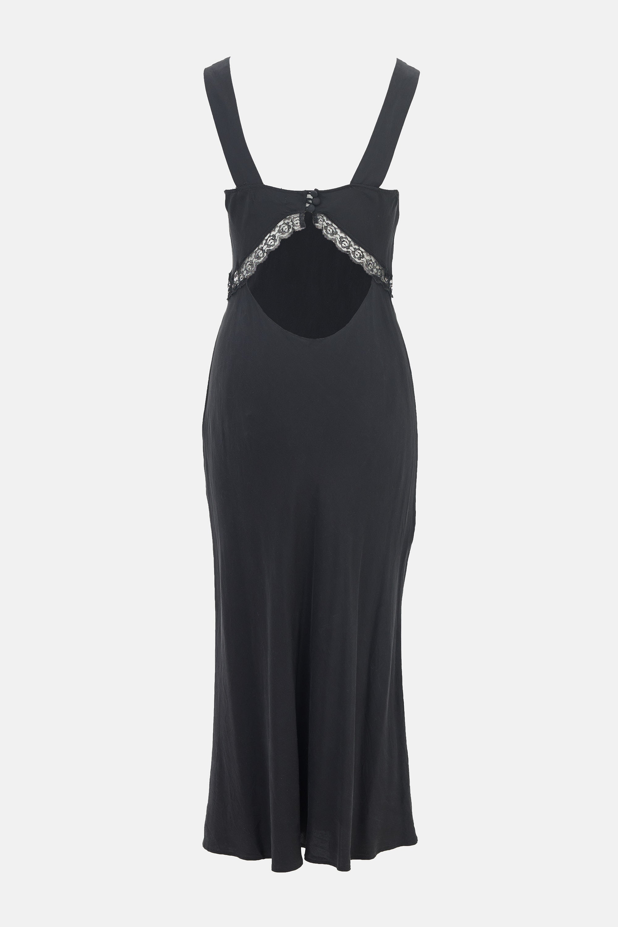 Pre-owned Reformation black silk Provence midi dress featuring a V-neckline, scalloped lace trim, cutout back with button fastenings, sheer lace at bodice, and fitted silhouette. Unlined.
