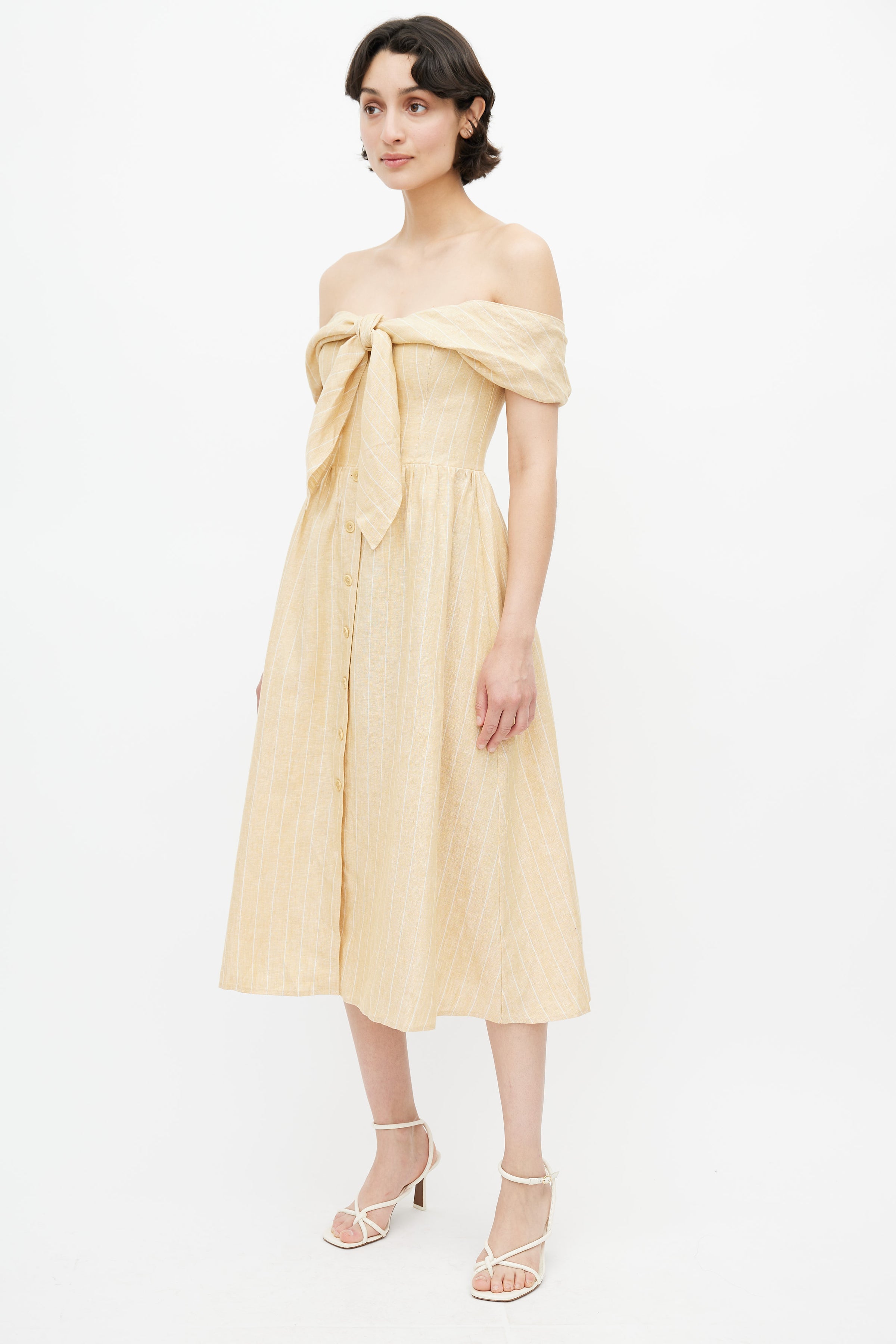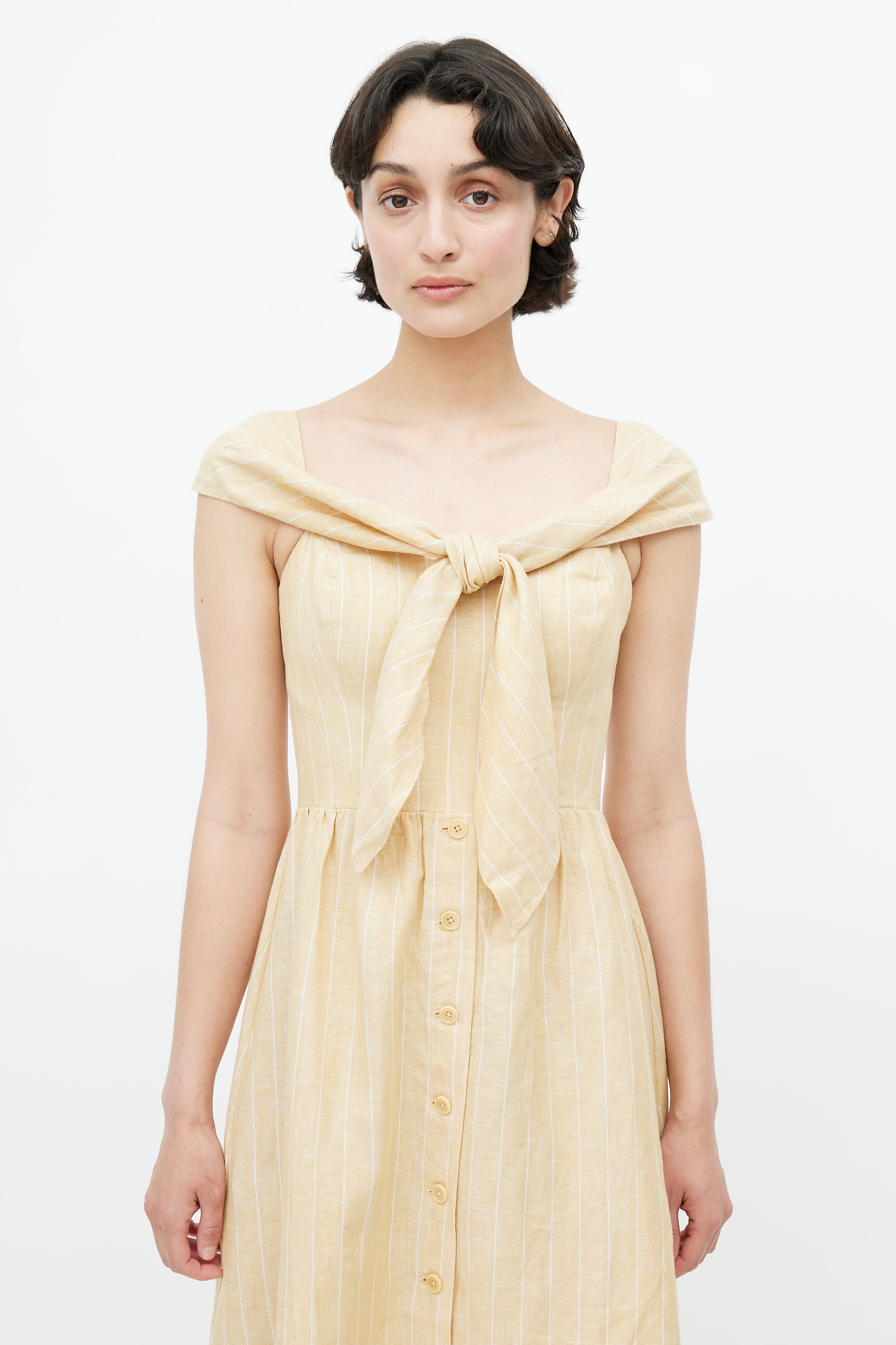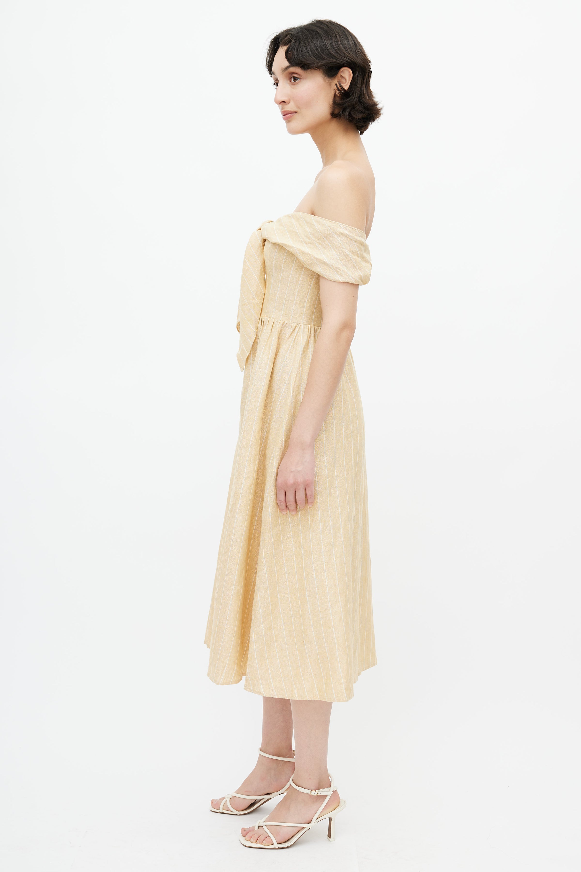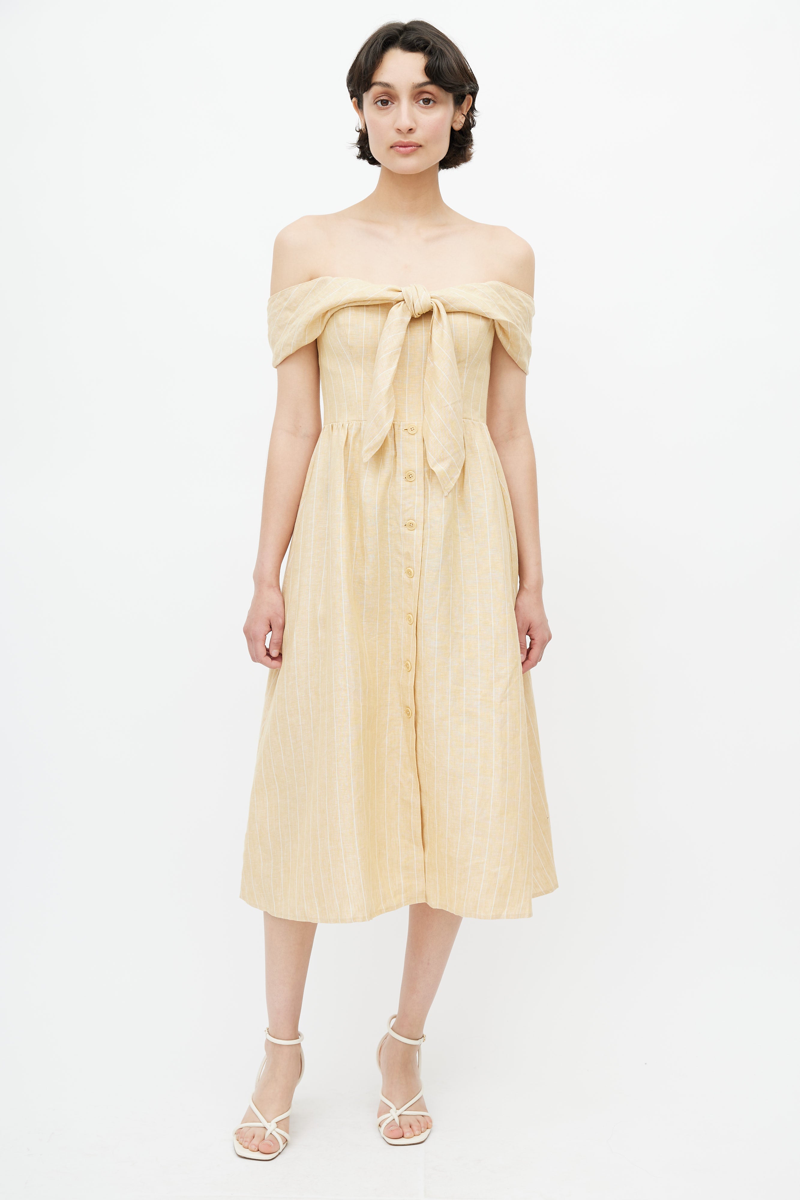 Reformation yellow and white linen Barrington dress featuring off the shoulder straps, stripes, tie detail at front, buttoned skirt, smocked back, and zip closure at back.