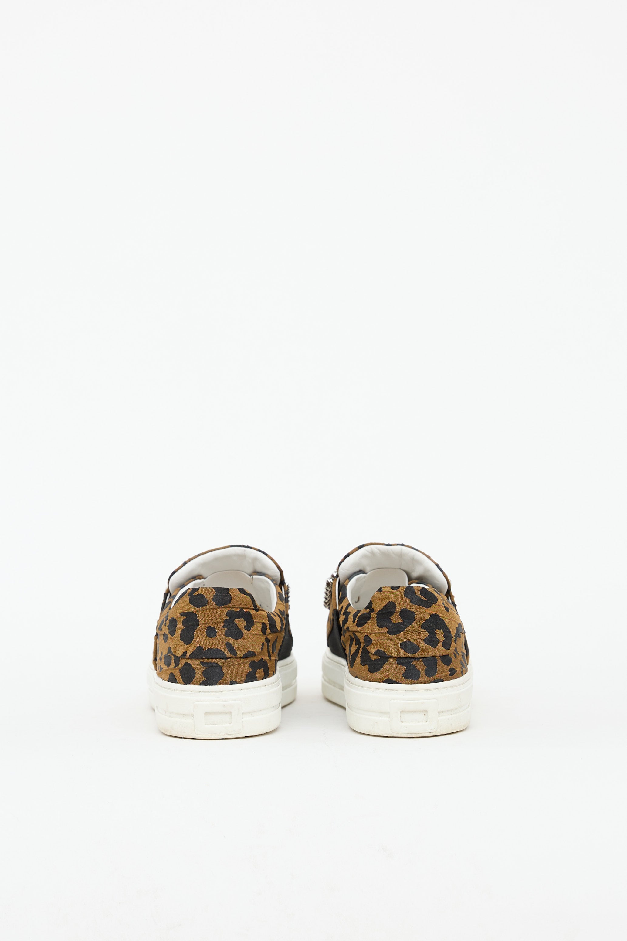 Pre-owned Roger Vivier brown sneaker featuring leopard textile upper, crystal embellished buckle, round toe, slip on entry, white rubber sole, leather insole and lining.