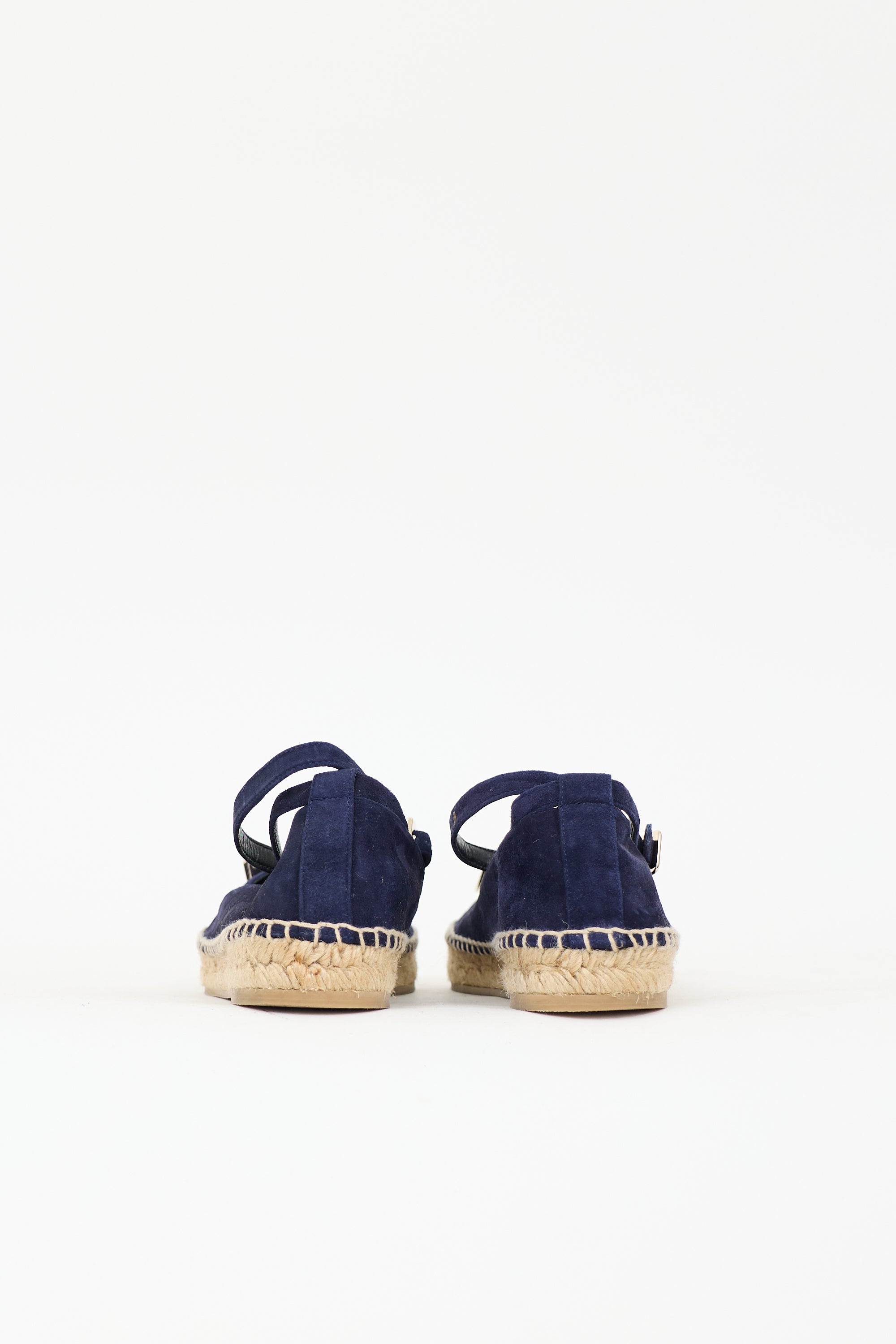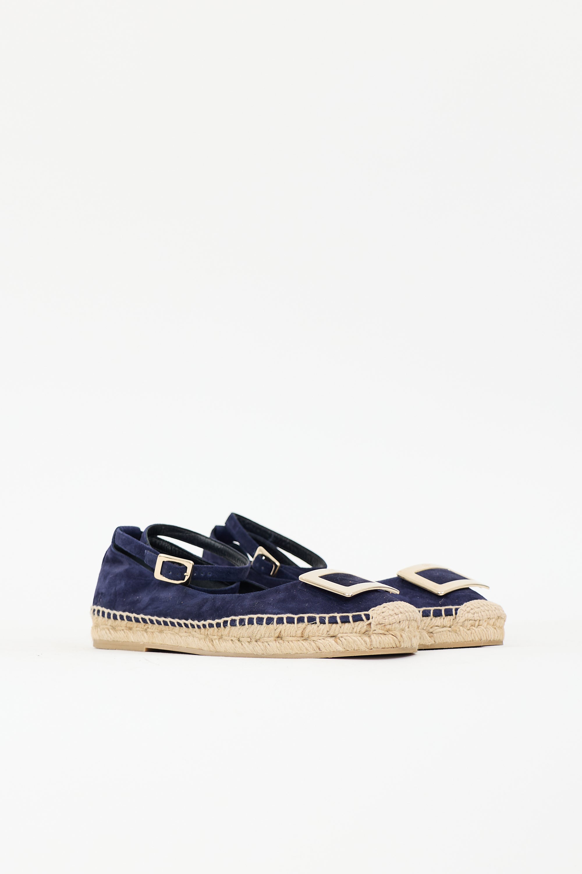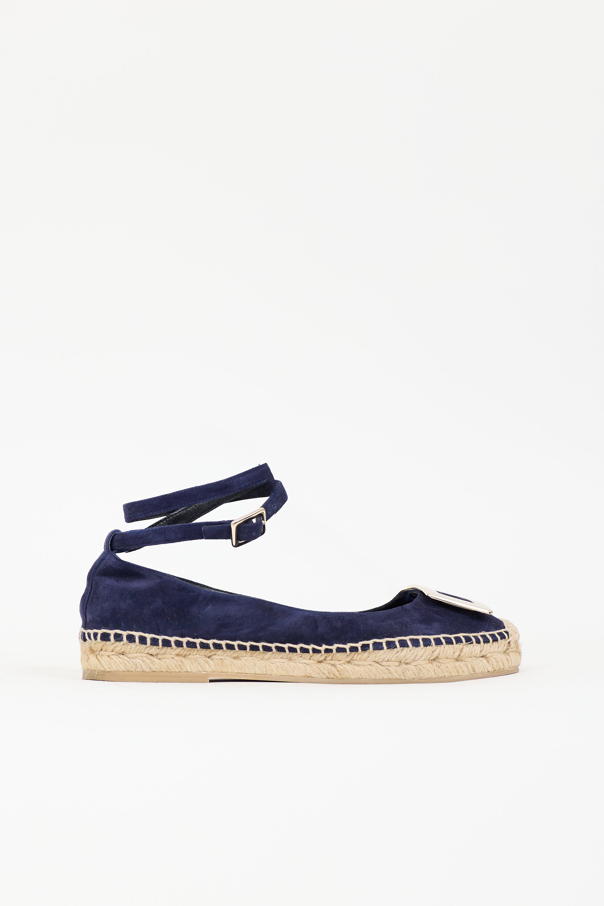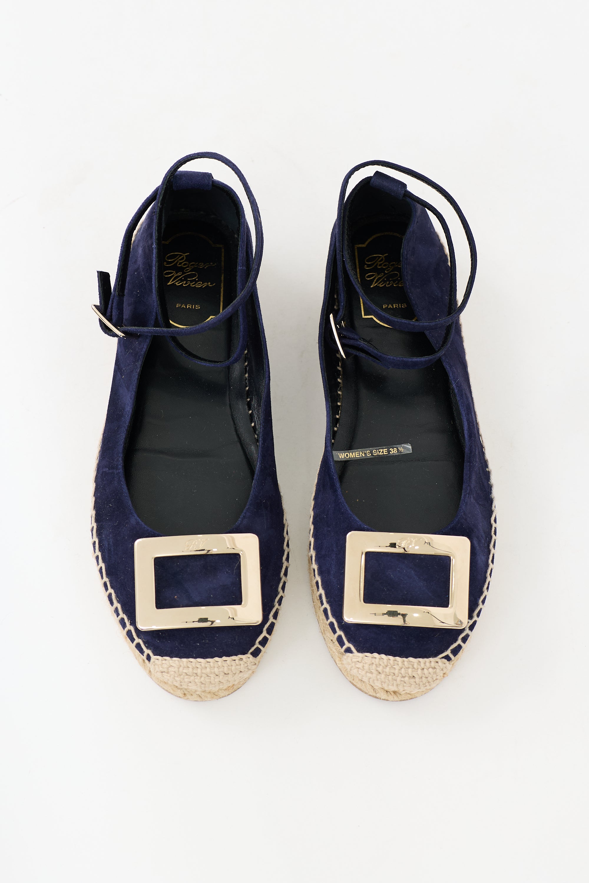 Pre-owned Roger Vivier navy suede flats featuring rounded toe, gold tone buckle, wraparound ankle strap, and braided jute midsole.
