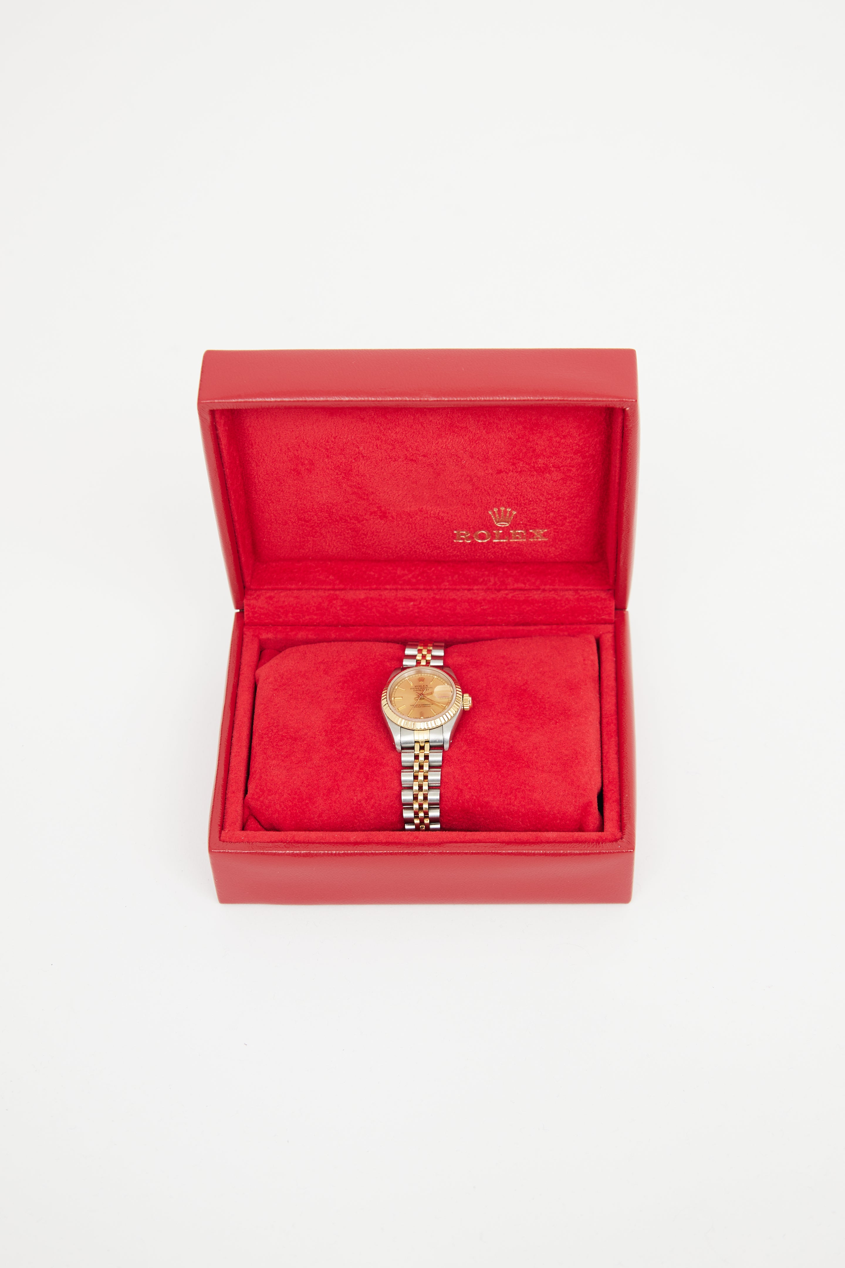 Pre-owned Rolex Oyster Perpetual Automatic Datejust wristwatch featuring a 26mm wide stainless steel case with 18K yellow gold fluted bezel, champagne dial with gold tone stick markers and hands, sapphire cyrstal face with cyclops date magnifier, accompanied with a stainless steel and 18K yellow gold Jubilee bracelet and folding clasp closure. Model #69173. Production 1990.