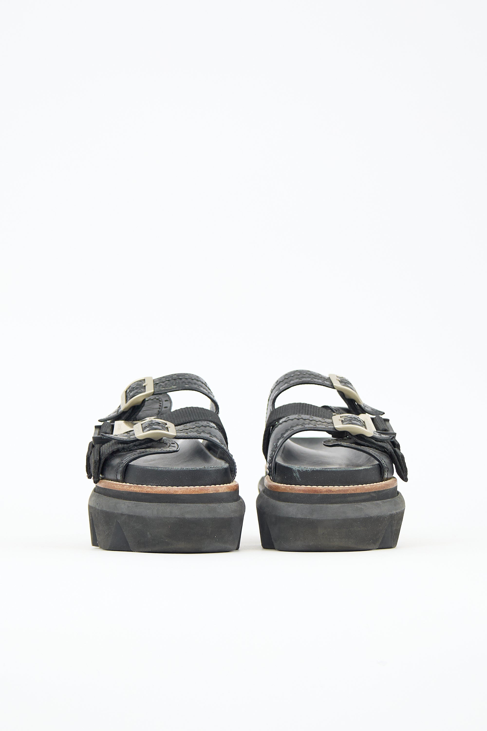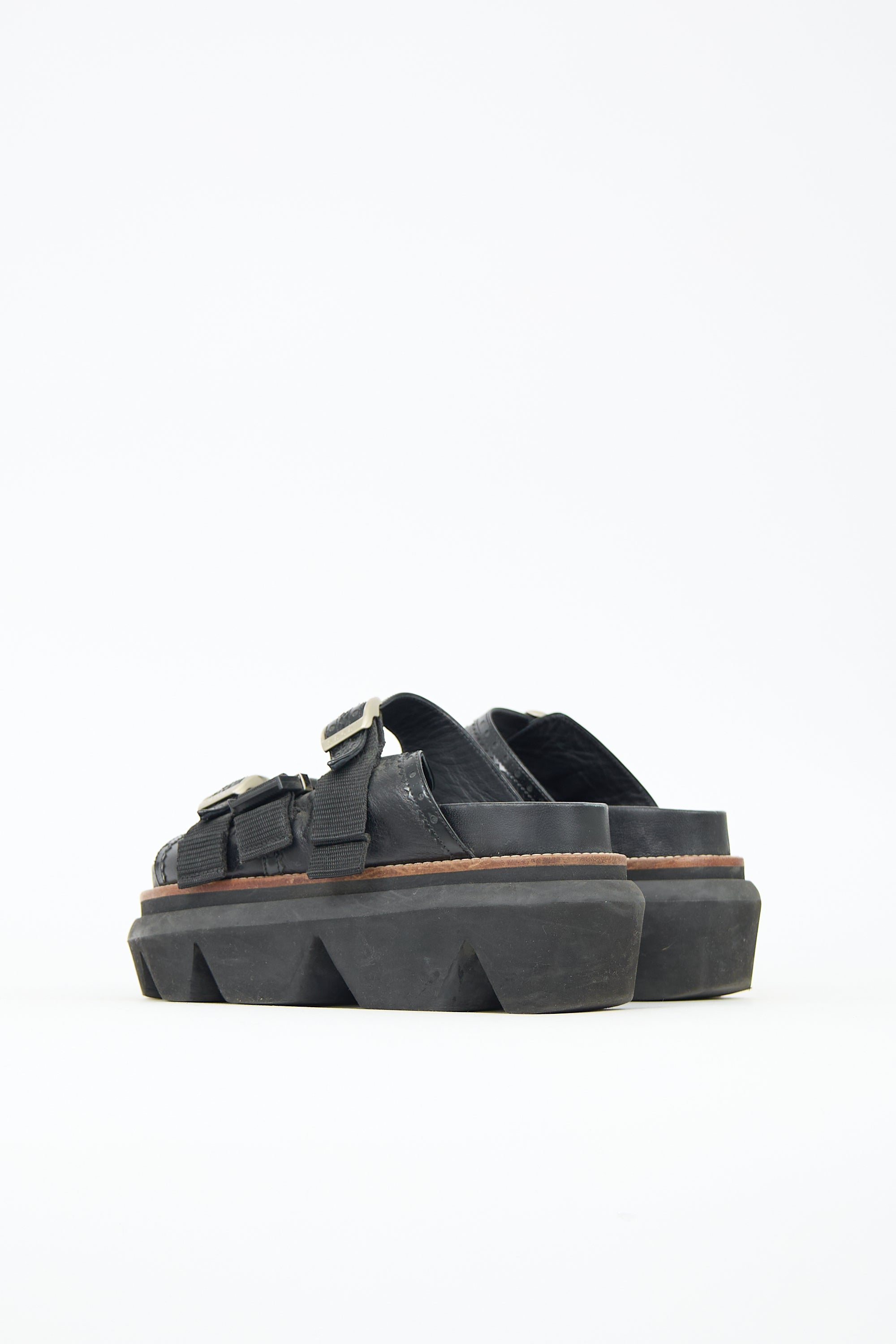 Pre-owned Sacai black leather slides featuring rounded toe, three straps with silver tone logo buckles at vamp, and treaded rubber platform sole.