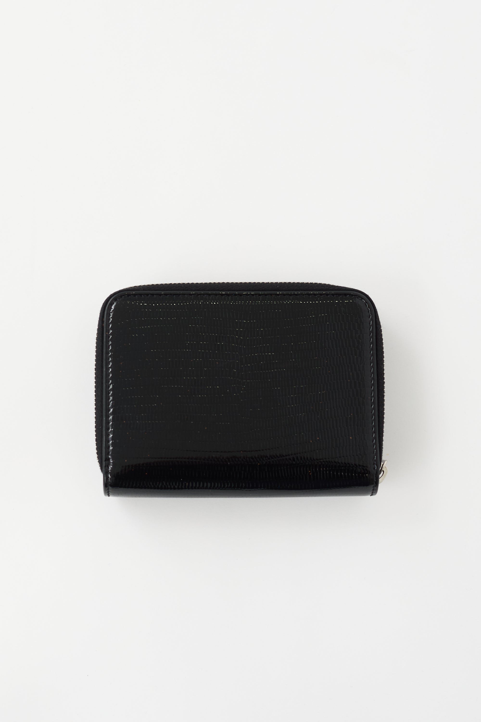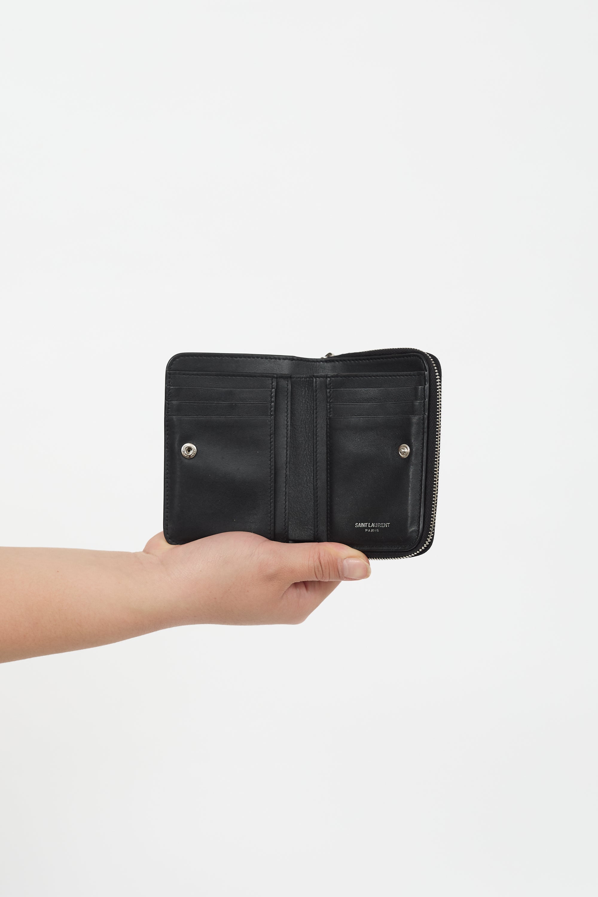 Pre-owned Saint Laurent black embossed leather bifold wallet featuring a silver tone Cassandre logo at front face, zip pocket, snap closure, and leather lined interior with six card slots and five bill slots. Comes with original dust bag.
