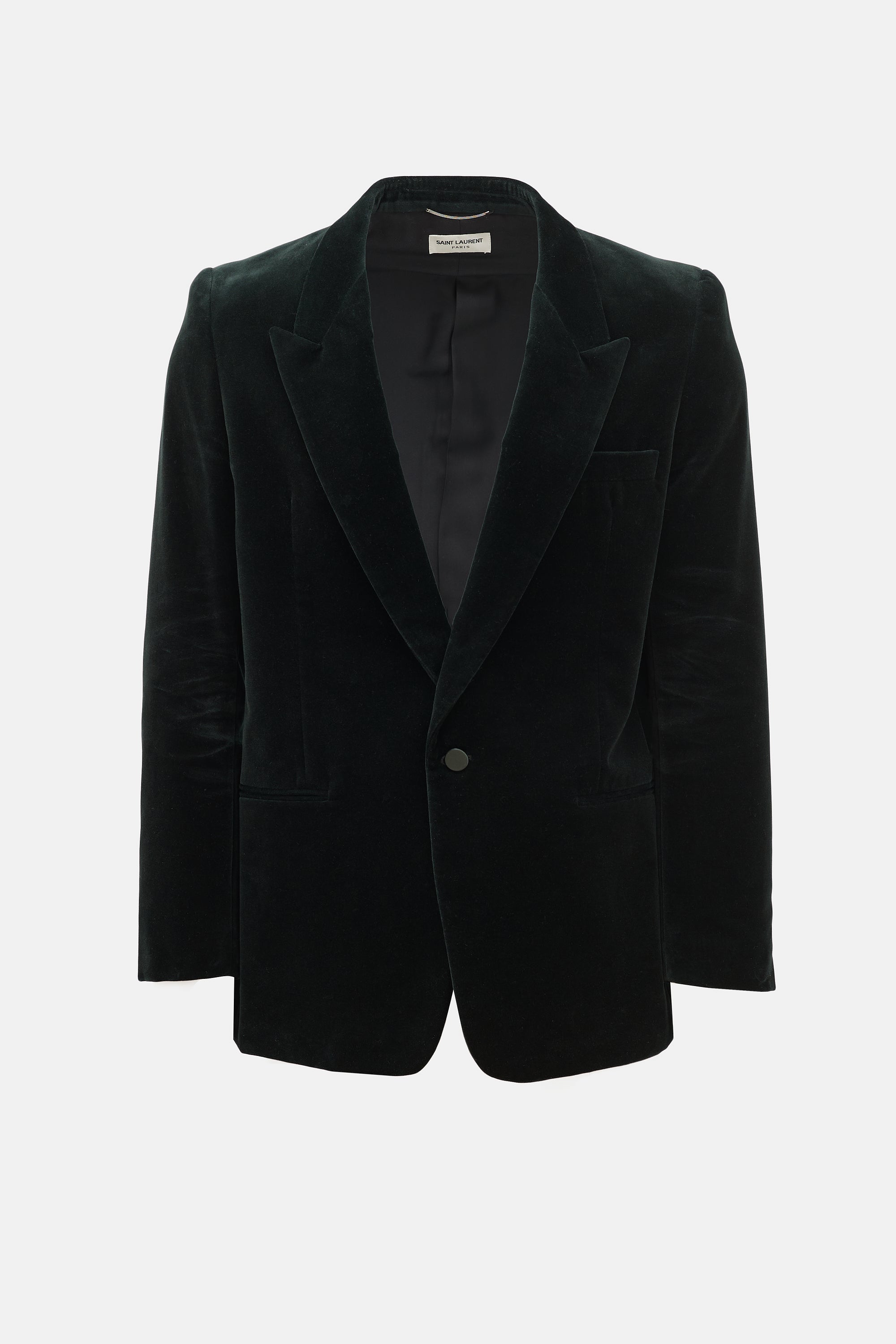 Pre-owned Saint Laurent 2022 dark green velvet blazer featuring a peak lapel, single button closure, padded shoulders, three welt pockets at front, fitted silhouette, vented back hem, and buttoned cuffs. Lined.