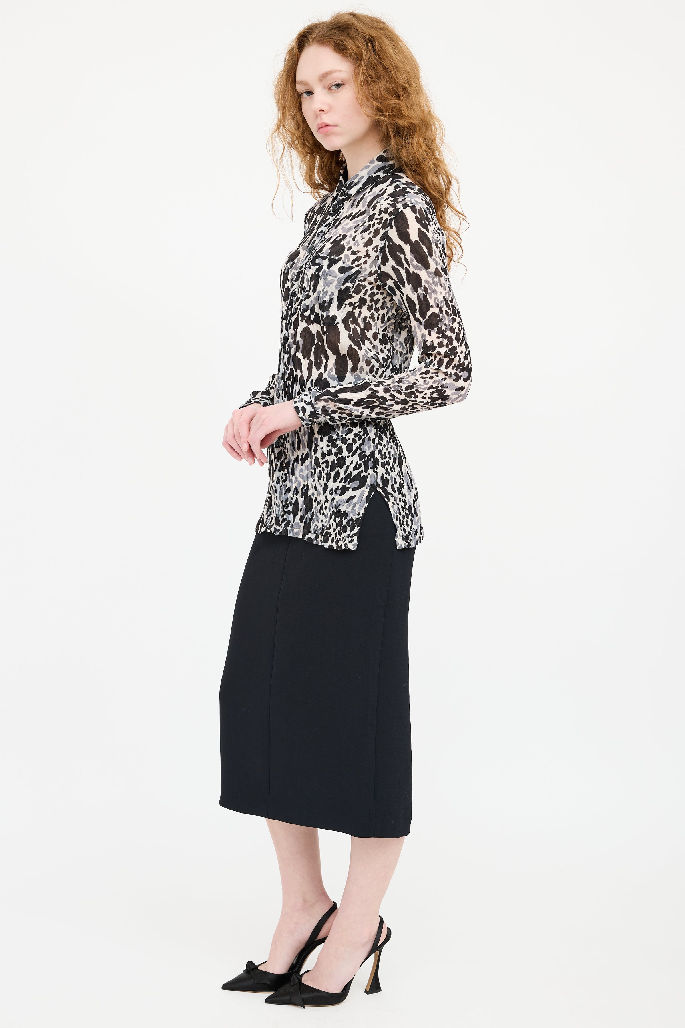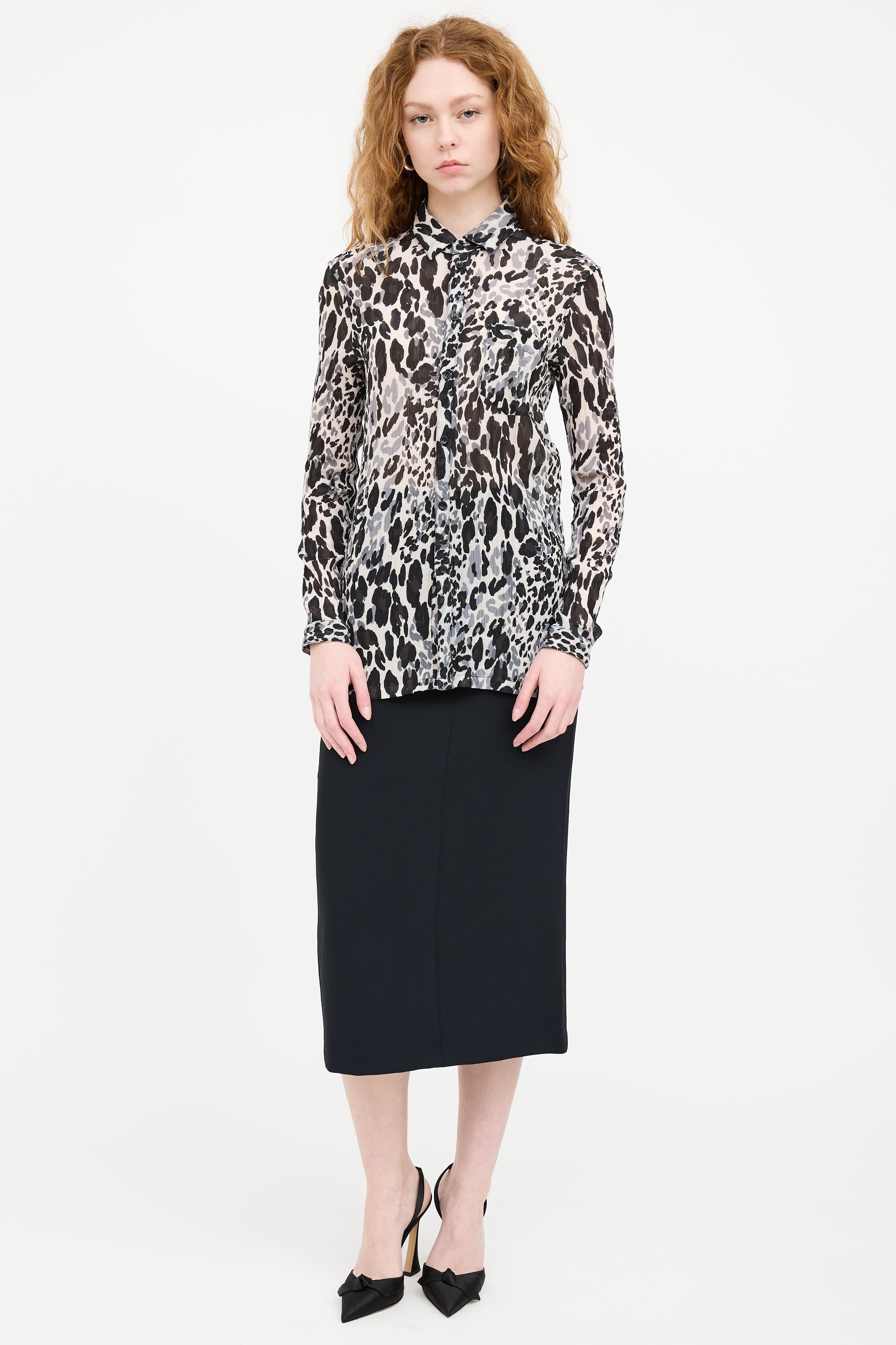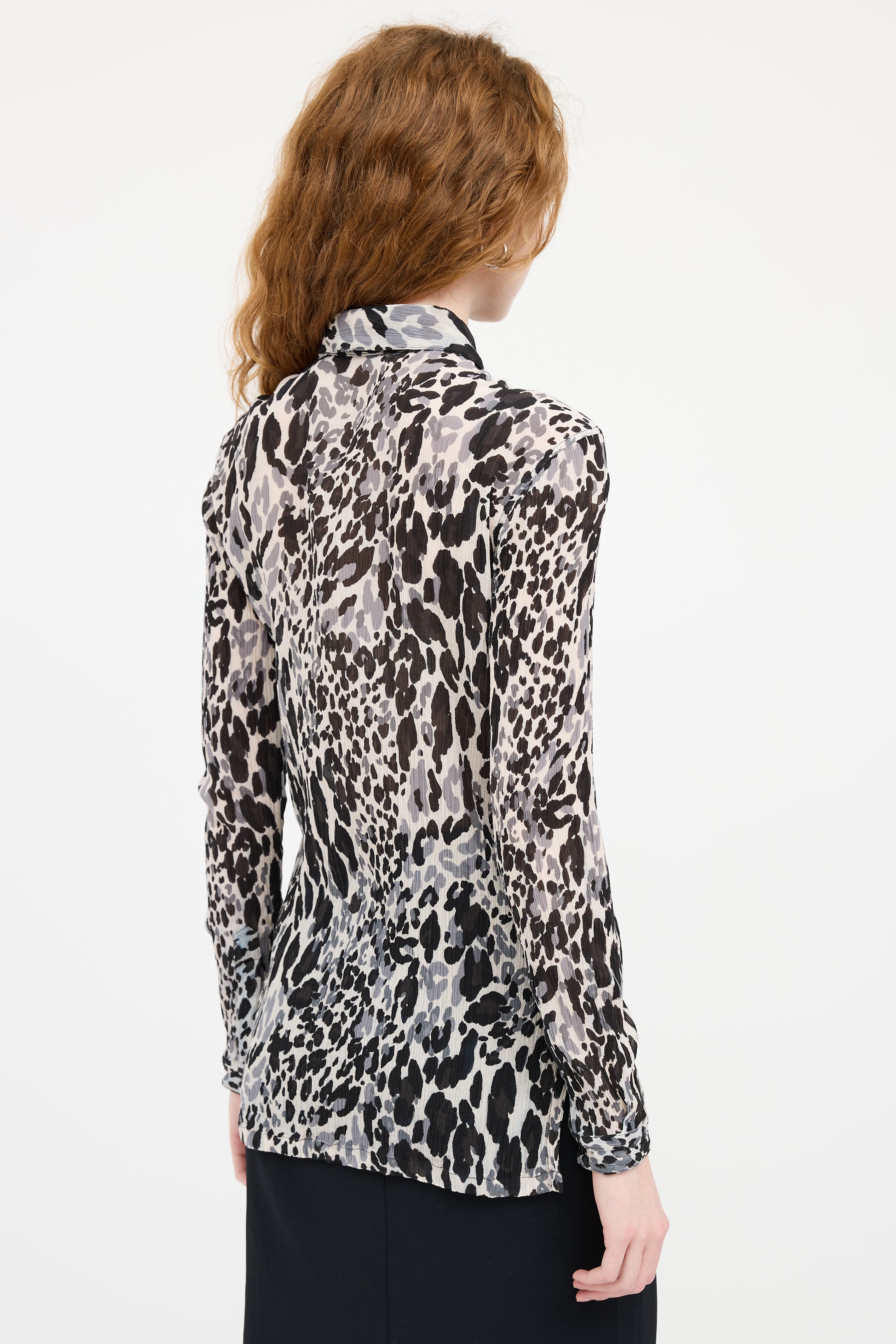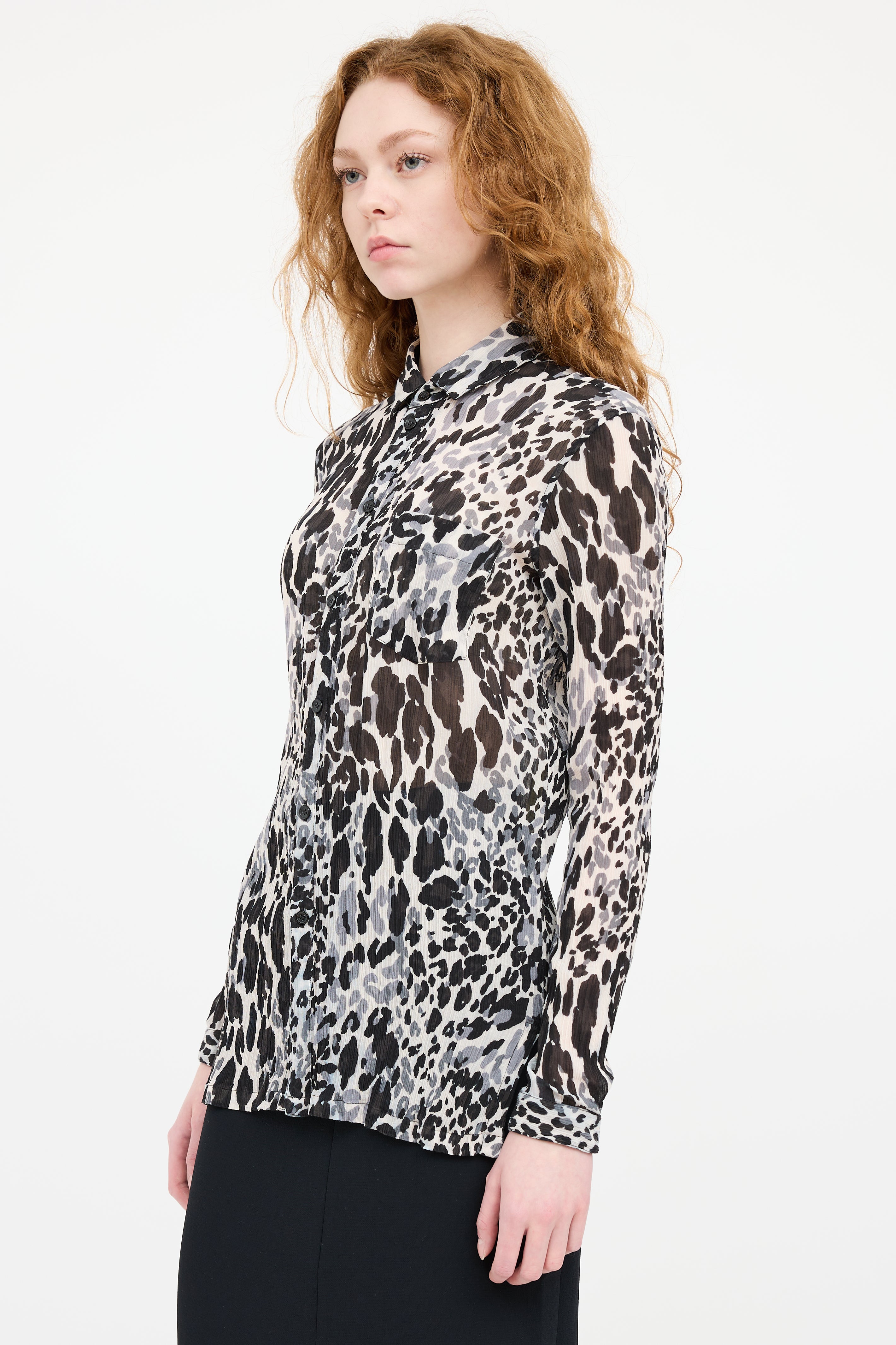 Pre-owned Saint Laurent white shirt featuring a black and grey leopard print pattern throughout, pointed collar, long sleeves with buttoned cuffs, one patch pocket at chest, and button up closure.