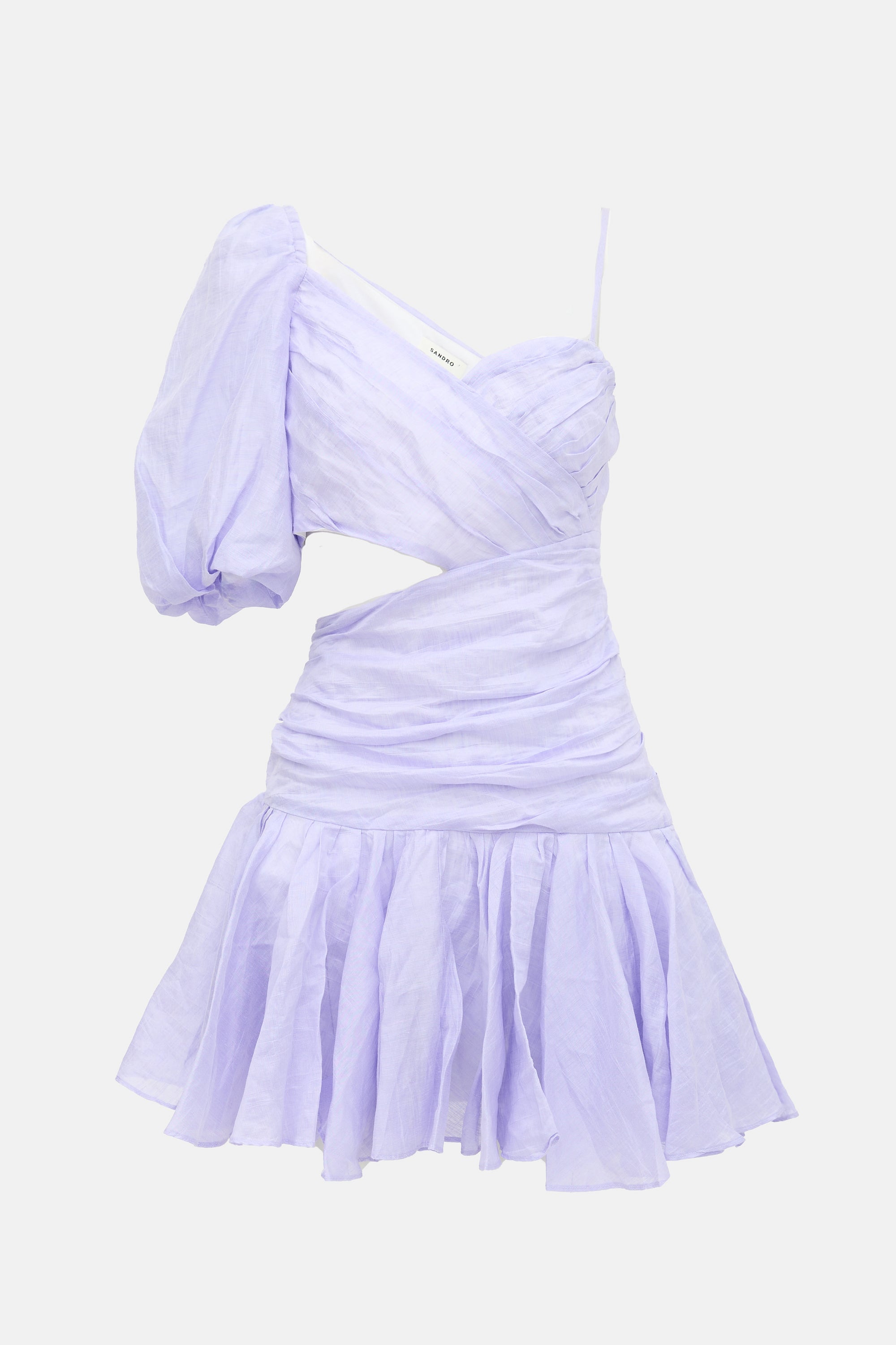 Pre-owned Sandro purple linen mini dress featuring a one shoulder design with puff sleeve, detachable spaghetti strap, sweetheart neckline, ruching throughout, side zip closure, cutout at waist, and ruffled skirt. Lined.