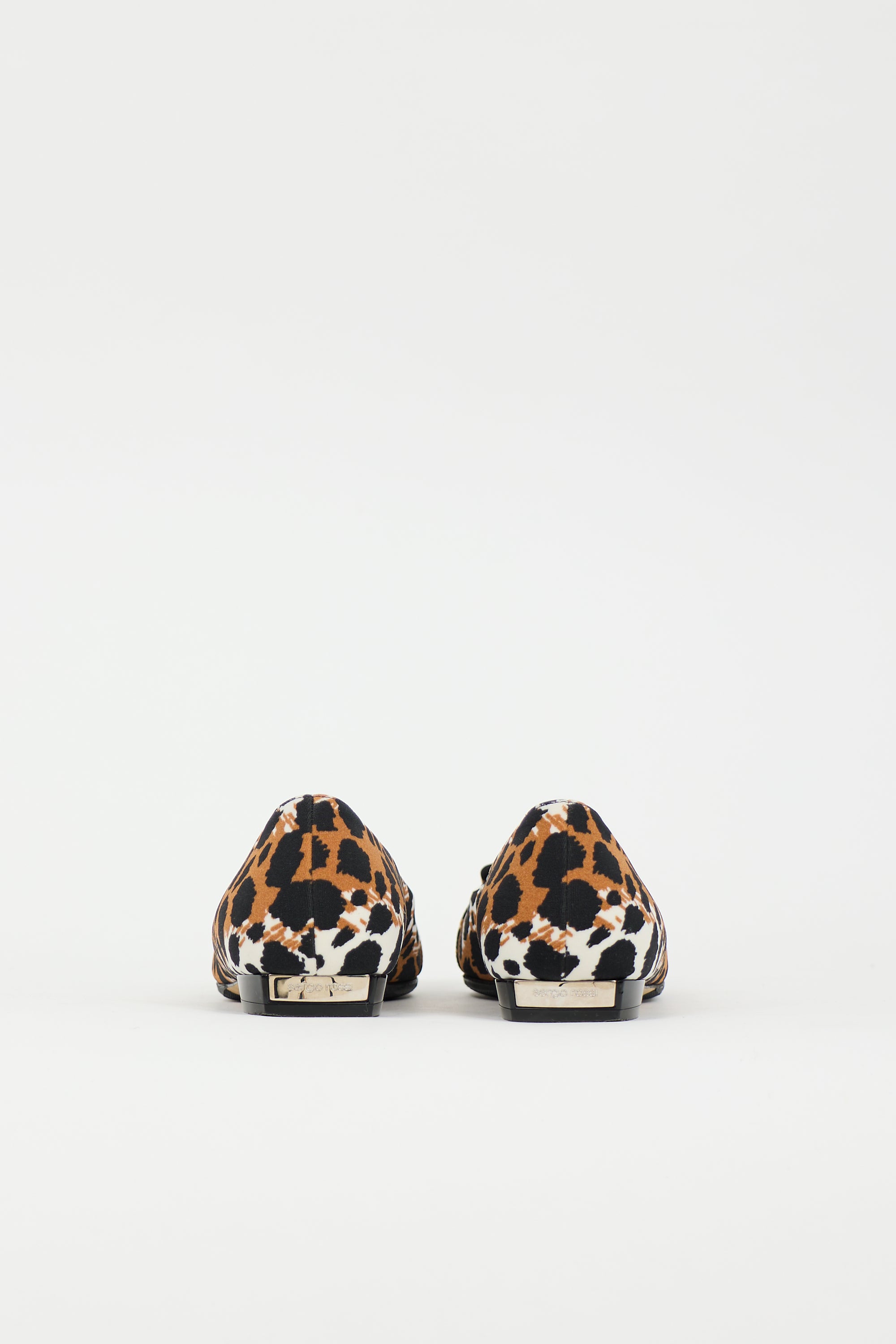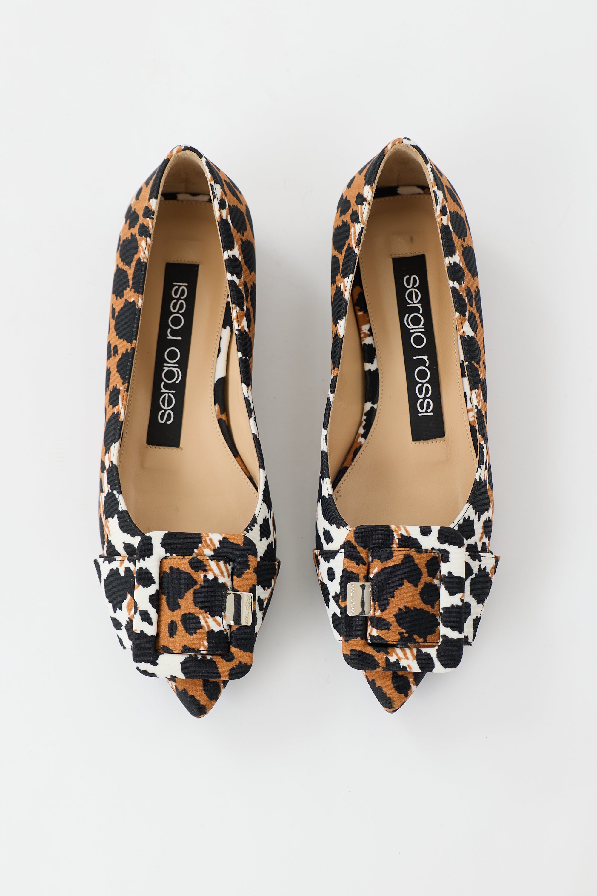 Pre-owned Sergio Rossi black, brown, and white flat featuring pointed toe, leopard print, covered decorative buckle at front, and patent block heel with silver tone logo at back. Includes original dust bag.