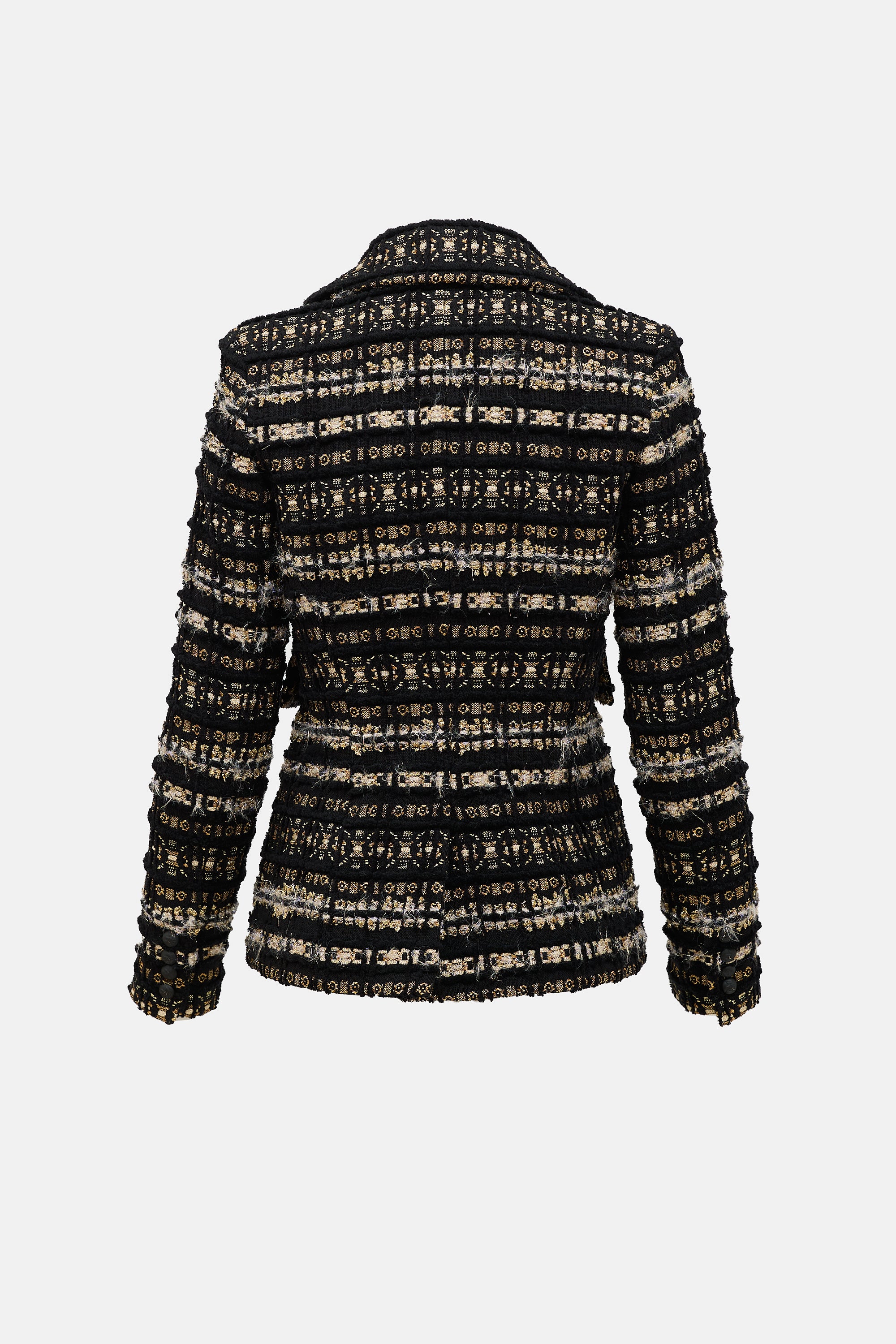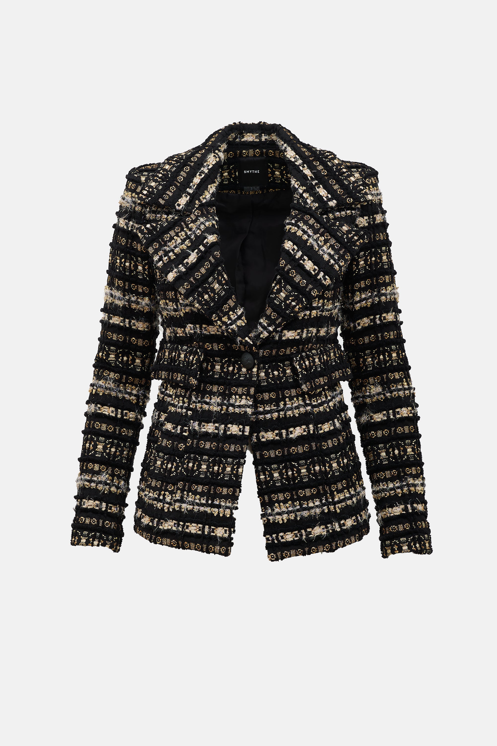 Pre-owned Smythe black and gold metallic threaded bouclé blazer featuring a notched lapel, single button closure, padded shoulders, two faux flap pockets, vented back, and buttoned cuffs. Lined.