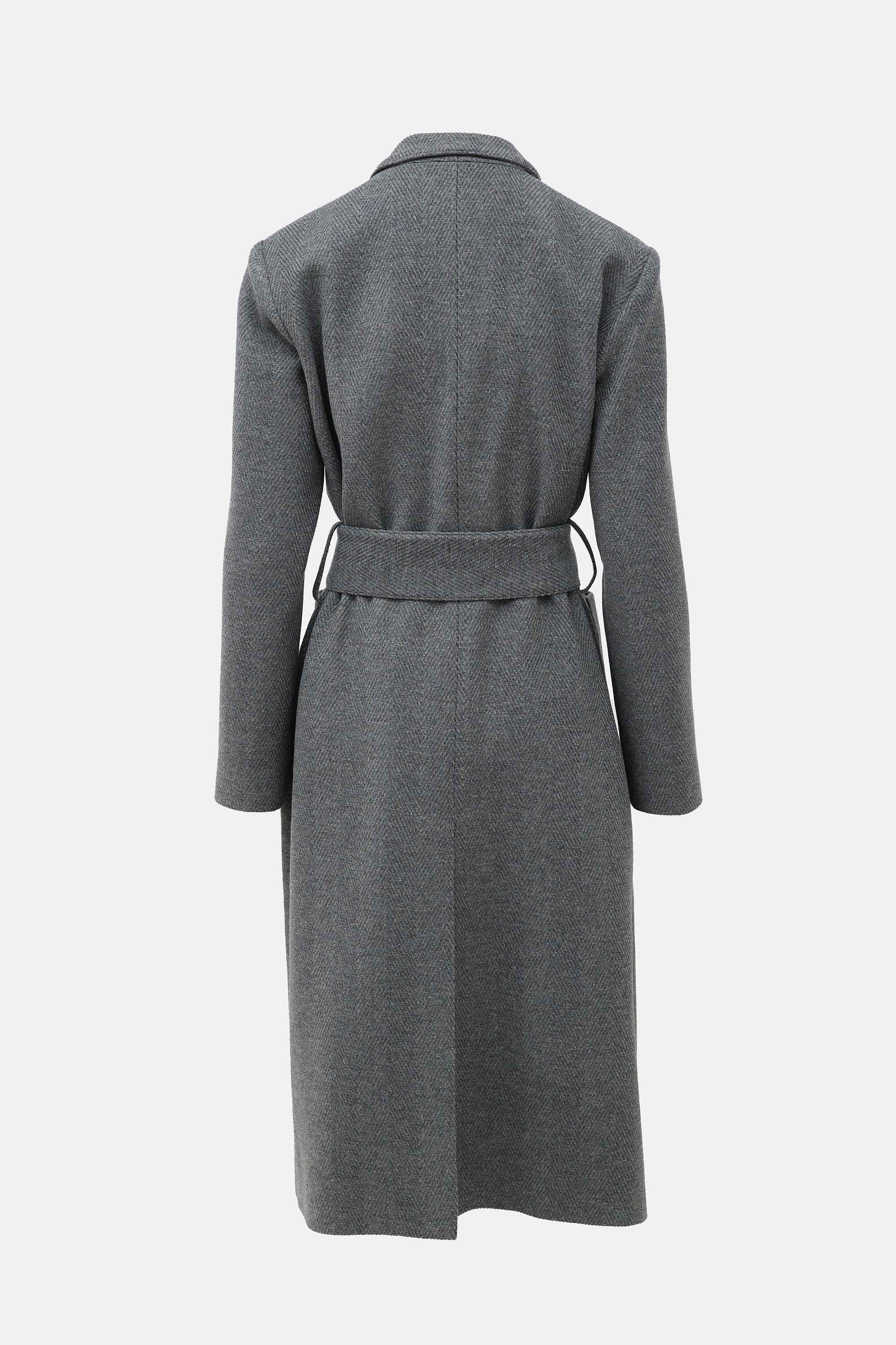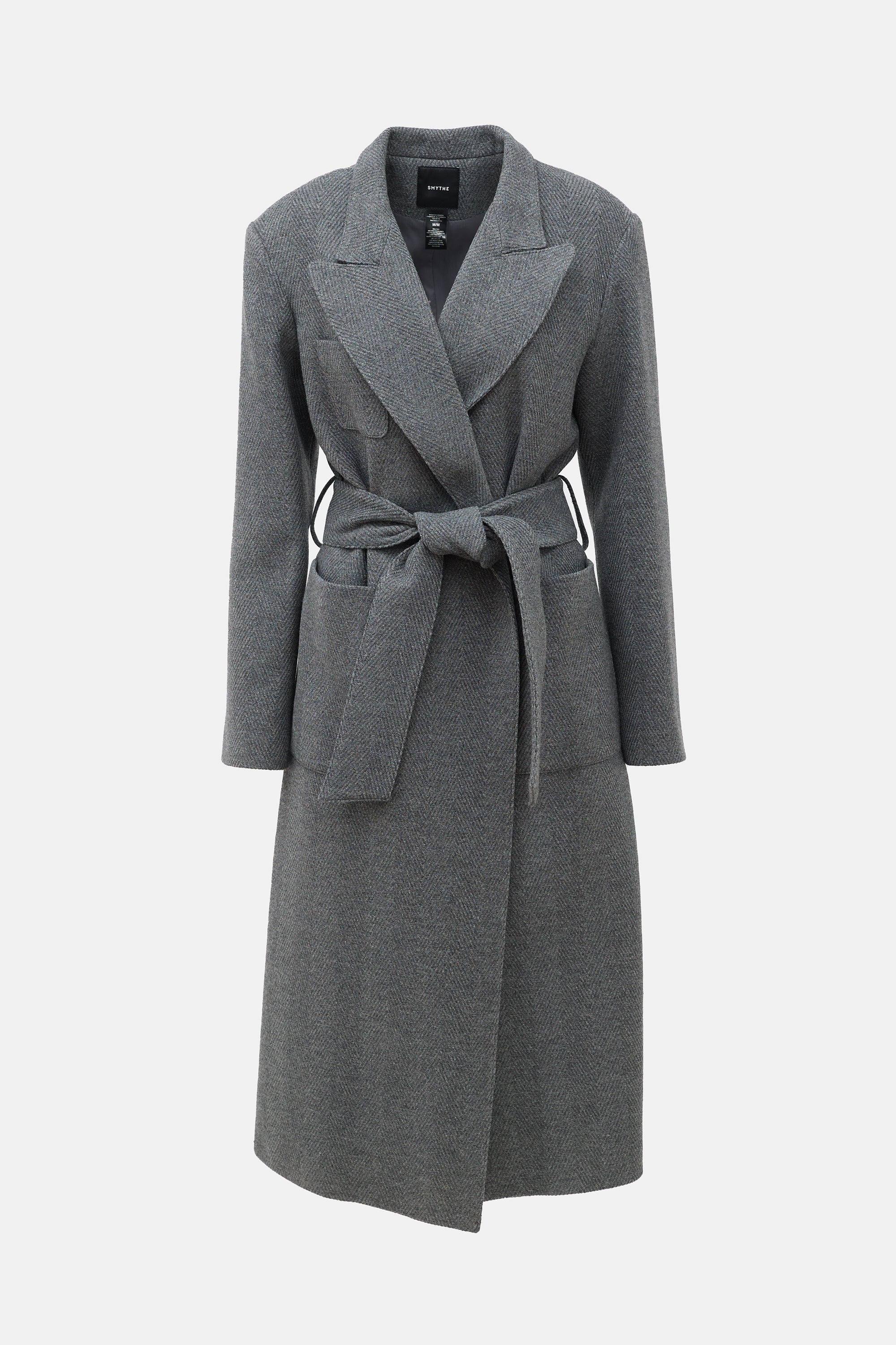 Pre-owned Smythe grey coat featuring a tonal Herringbone pattern, wide peak lapel, padded shoulder, open front, tie belt, and patch pockets. Lined.