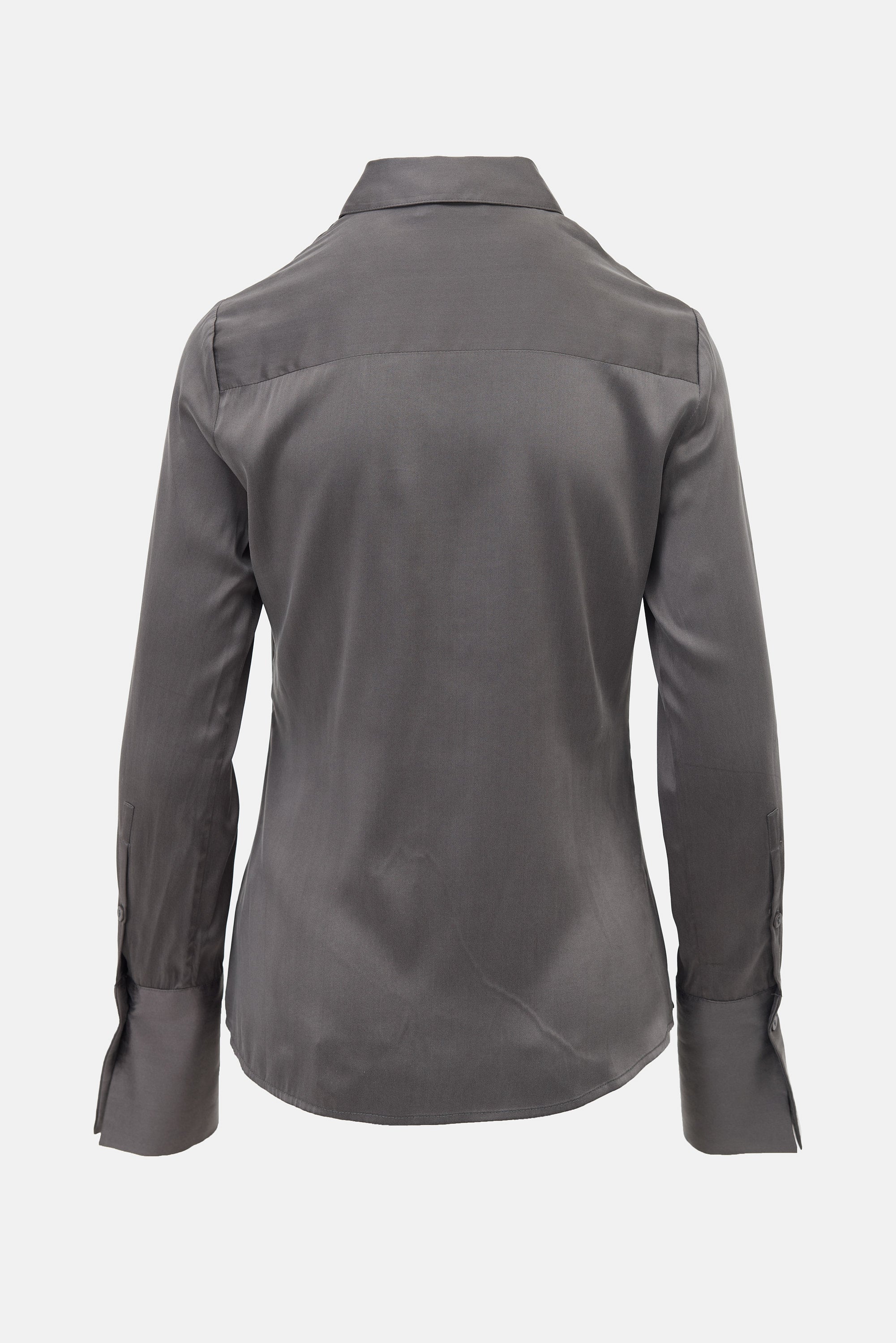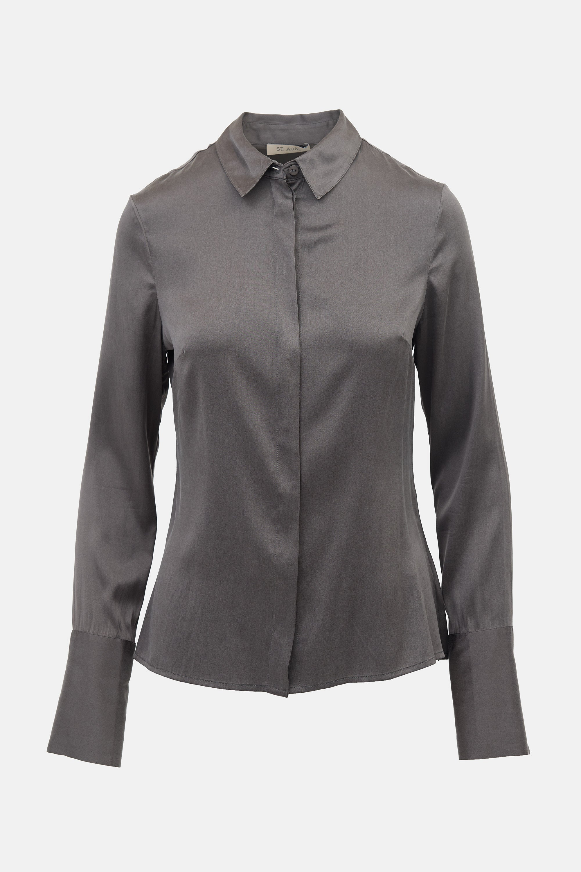 Pre-owned St. Agni grey Soft Silk shirt featuring a point collar, concealed button front, darts at bust, and buttoned cuffs.