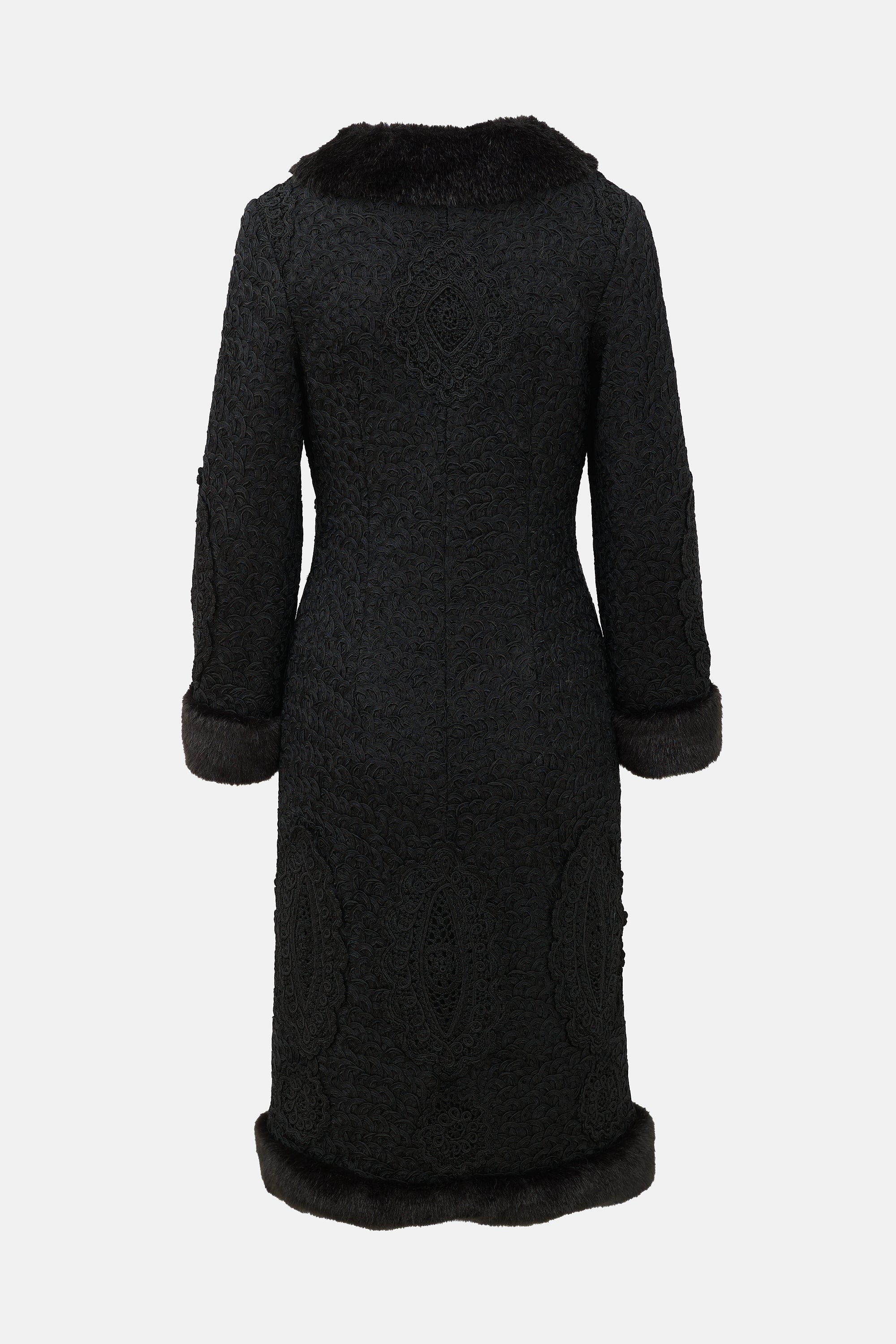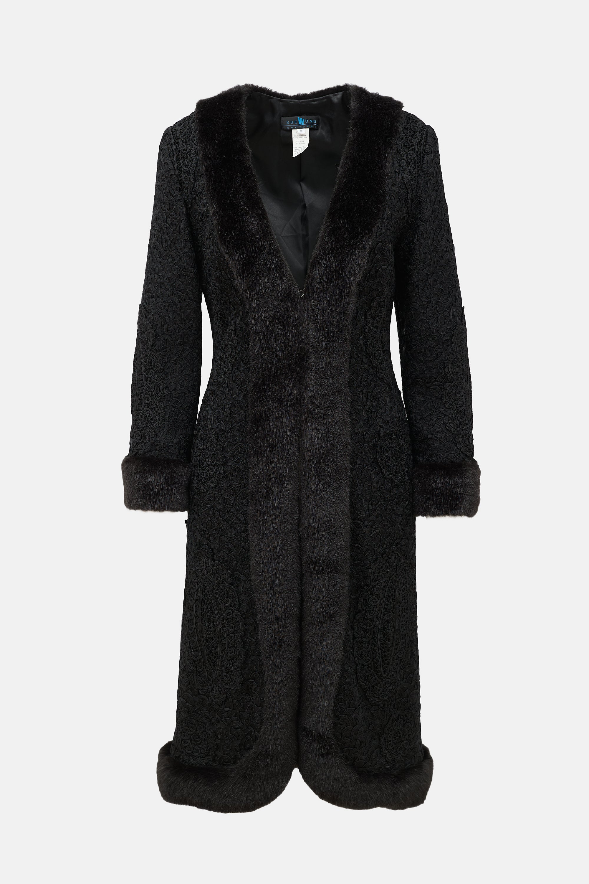 Pre-owned Sue Wong silk coat featuring soutache embroidery, tonal faux fur trim, open front, and crochet paisley details. Lined.
