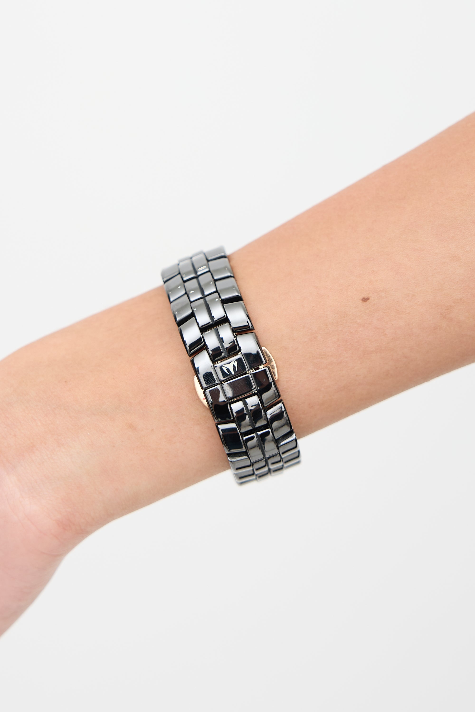 Pre-owned Technomarine black wristwatch featuring a 35mm wide case with rose gold tone stainless steel rim, ceramic bezel with minute markers, rose gold tone Arabic numeral hour markers and hands, chronograph display, date display at 4 o'clock, sapphire crystal face, and ceramic bracelet with push button deployment clasp. Comes with extra links.