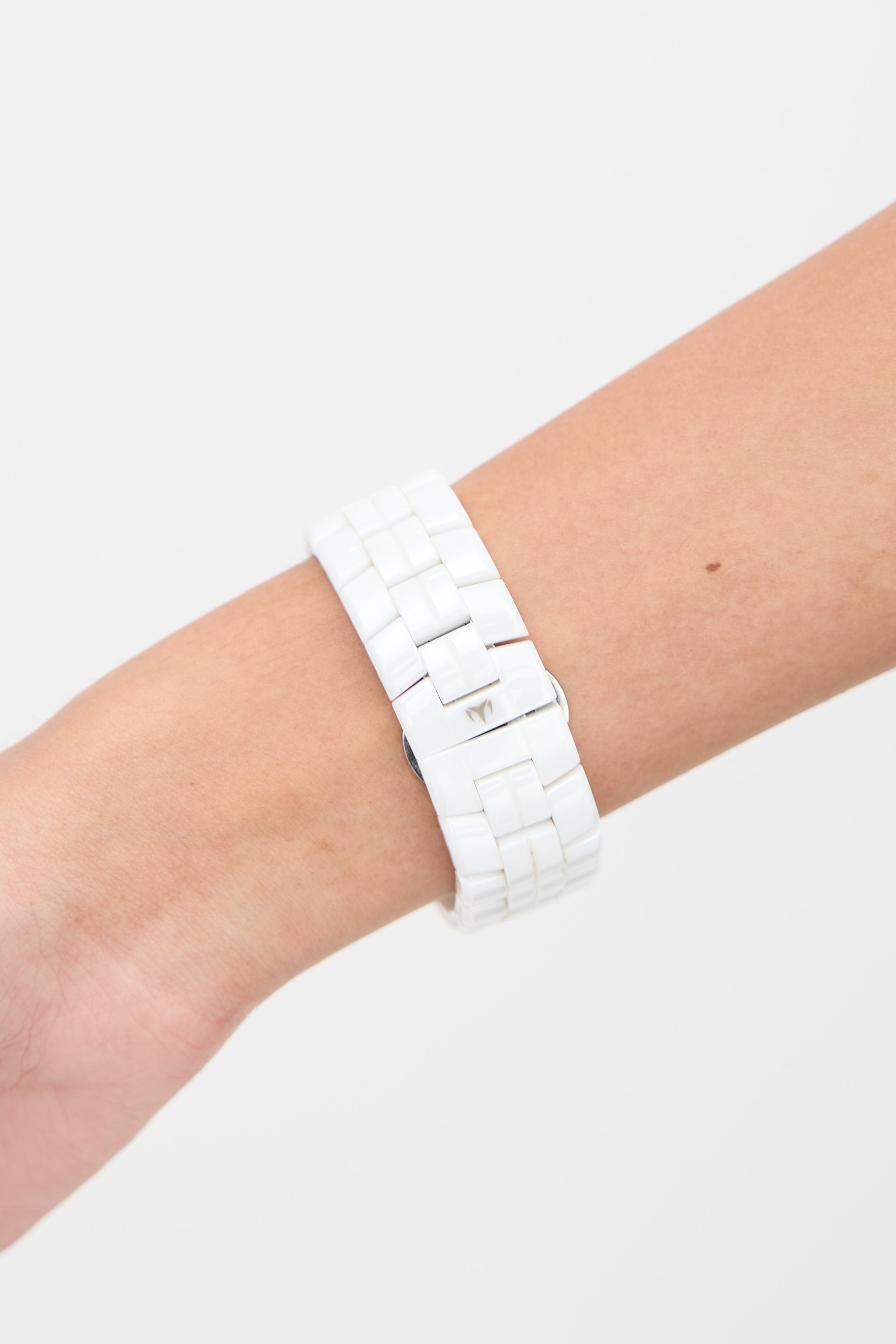 Pre-owned Technomarine white wristwatch featuring a 40mm wide case with stainless steel rim, diamond bezel, silver tone tone Arabic numeral hour markers and hands, chronograph display, date display at 4 o'clock, sapphire crystal face, and ceramic bracelet with push button deployment clasp. Comes with extra links.